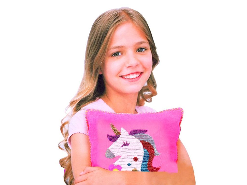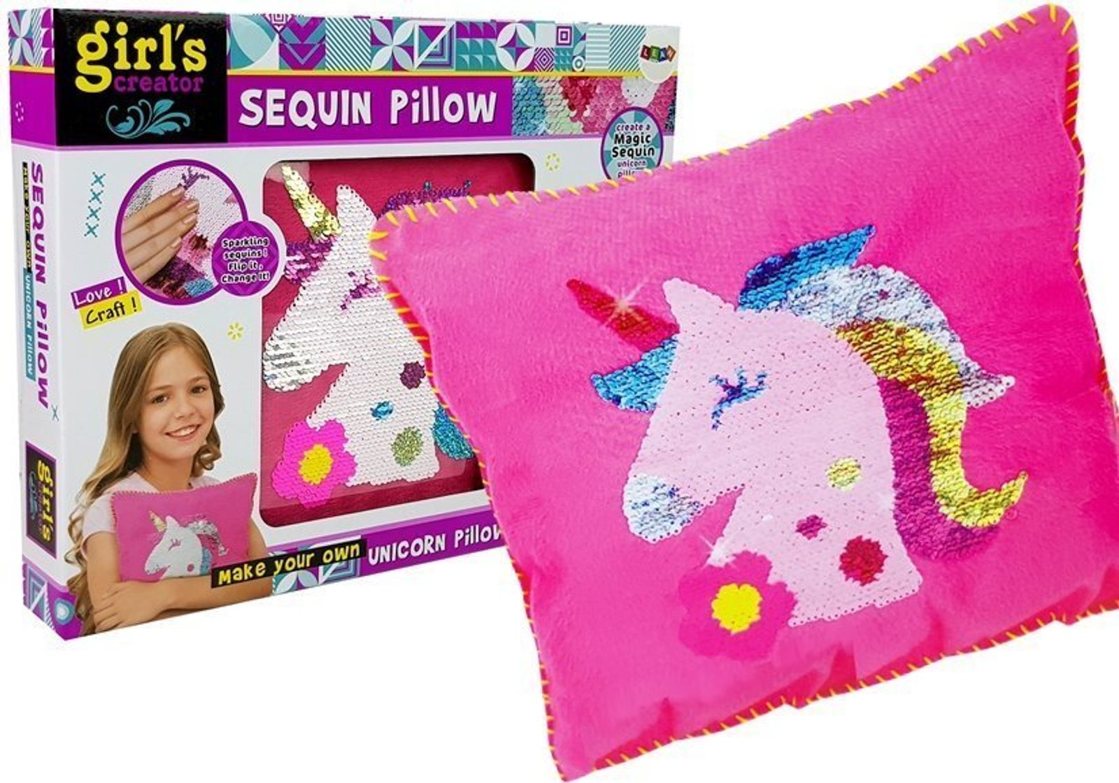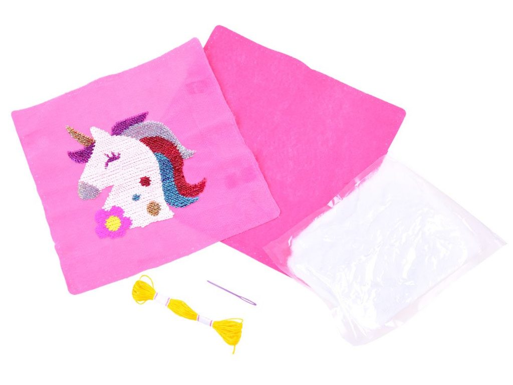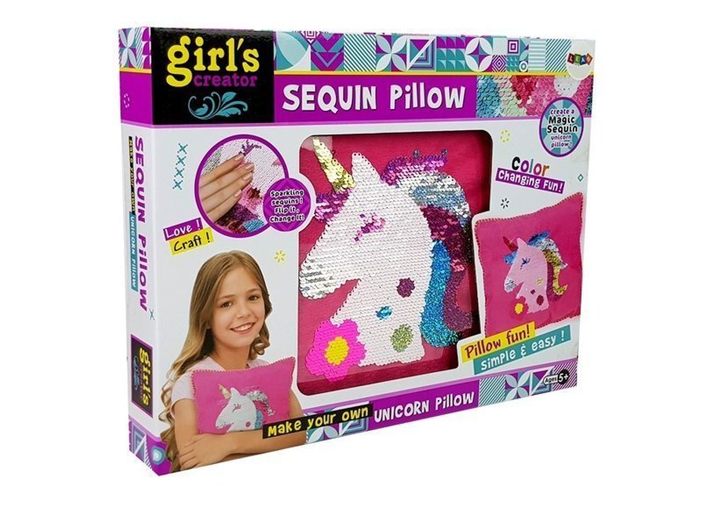 Sada Sequin Pillow potěší každou malou švadlenu a umožní ji ušít si vlastní flitrový polštářek s jednorožcem. Okouzlující, růžová, měkká látka s obrázkem jednorožce potěší každého fanouška těchto kouzelných tvorů. Flitry jsou navíc oboustranné, hlazením jednorožce se mění jeho barva. Sada obsahuje přední stranu polštáře s s jednorožcem, zadní stranu, výplň, šňůrku a bezpečnou jehlu. Určeno pro děti od 5 let věku.