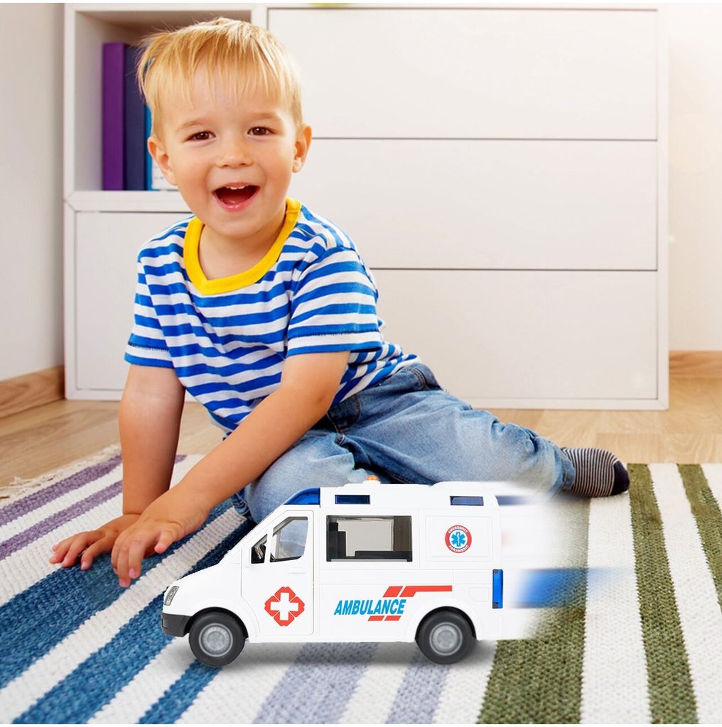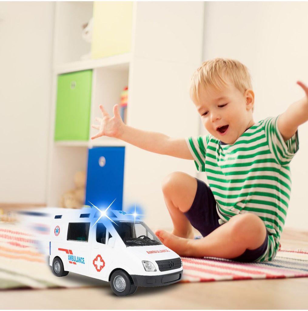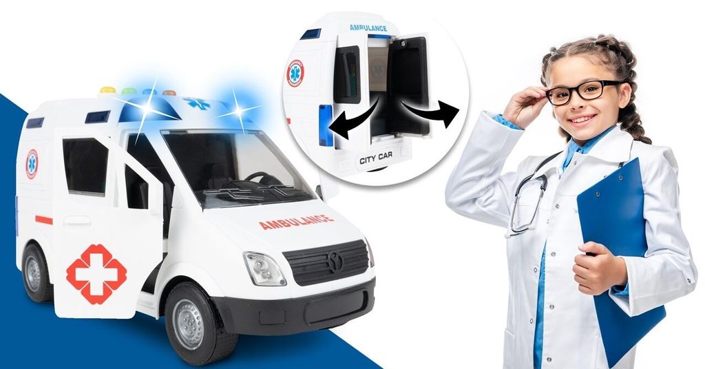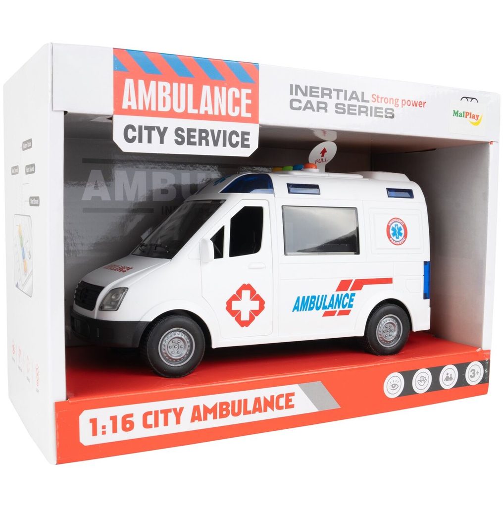 Sanitka City Ambulance je ideální hračkou pro rozvoj manuální zručnosti a logického myšlení. Je vybavena tlačítky, které spouští sirénu, zvuky motoru a troubení. Na střeše je umístěný svítící maják. Autíčko má gumová kola a pohon na setrvačník. Přední a zadní dveře autíčka jsou otevírací. Hračka je určena pro děti od 36 měsíců věku.
