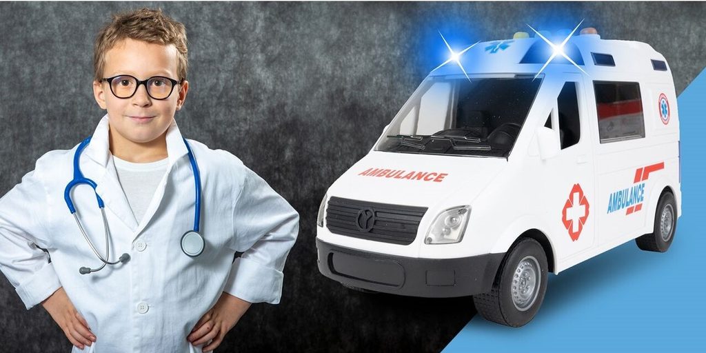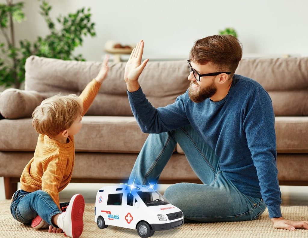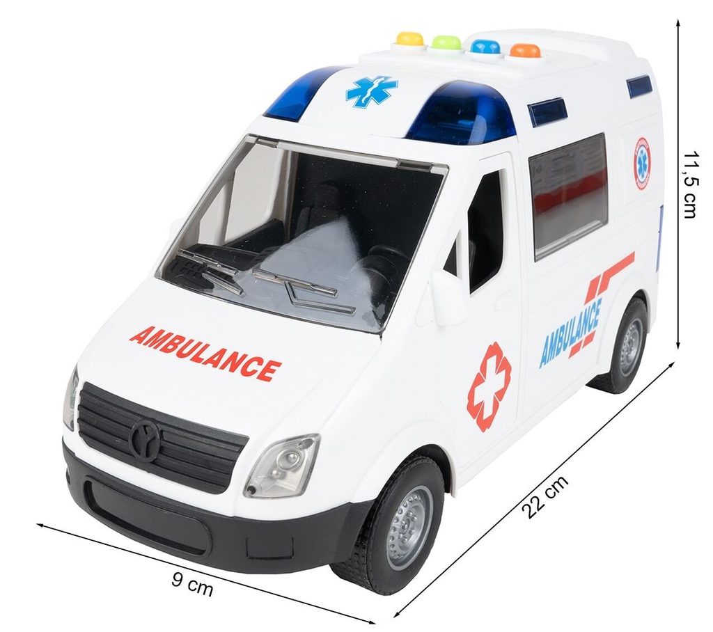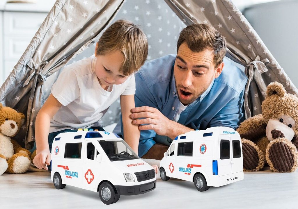 Sanitka City Ambulance je ideální hračkou pro rozvoj manuální zručnosti a logického myšlení. Je vybavena tlačítky, které spouští sirénu, zvuky motoru a troubení. Na střeše je umístěný svítící maják. Autíčko má gumová kola a pohon na setrvačník. Přední a zadní dveře autíčka jsou otevírací. Hračka je určena pro děti od 36 měsíců věku.