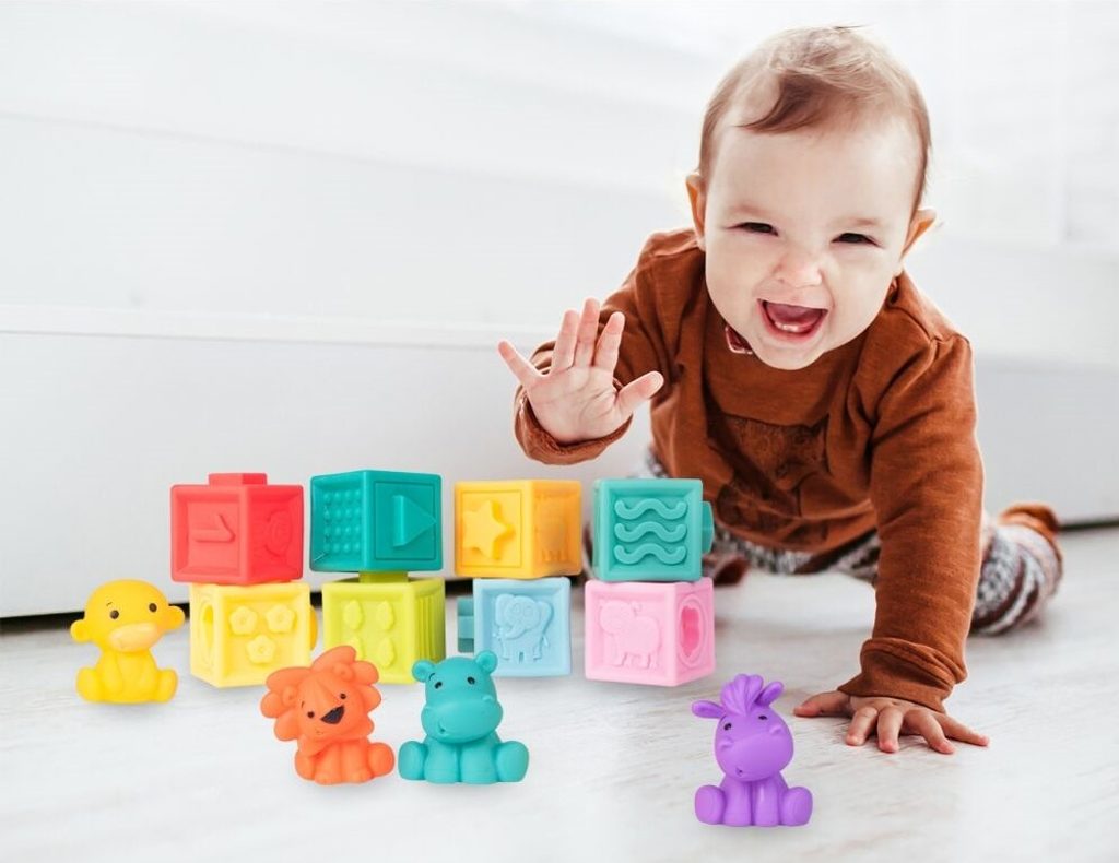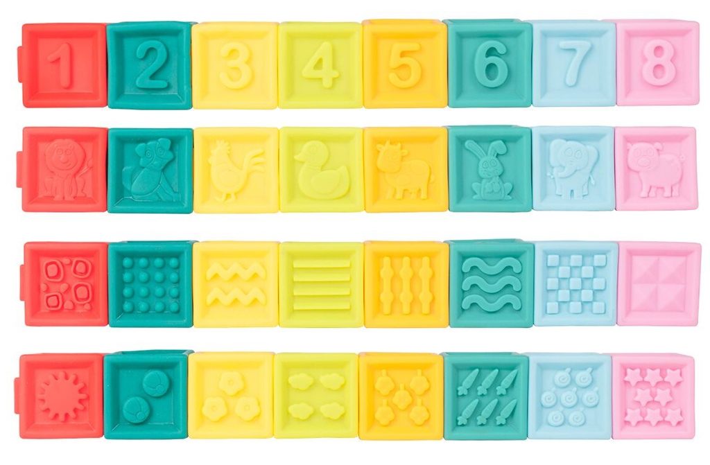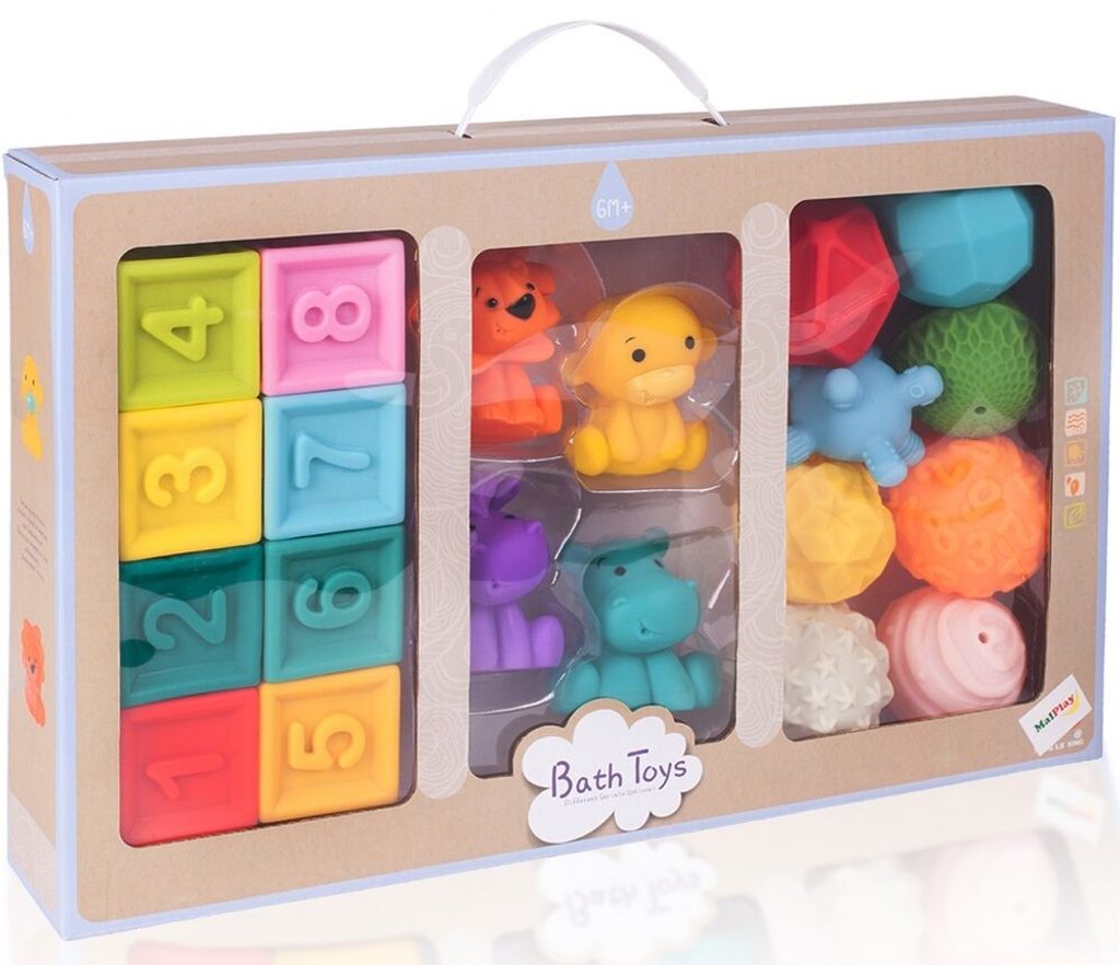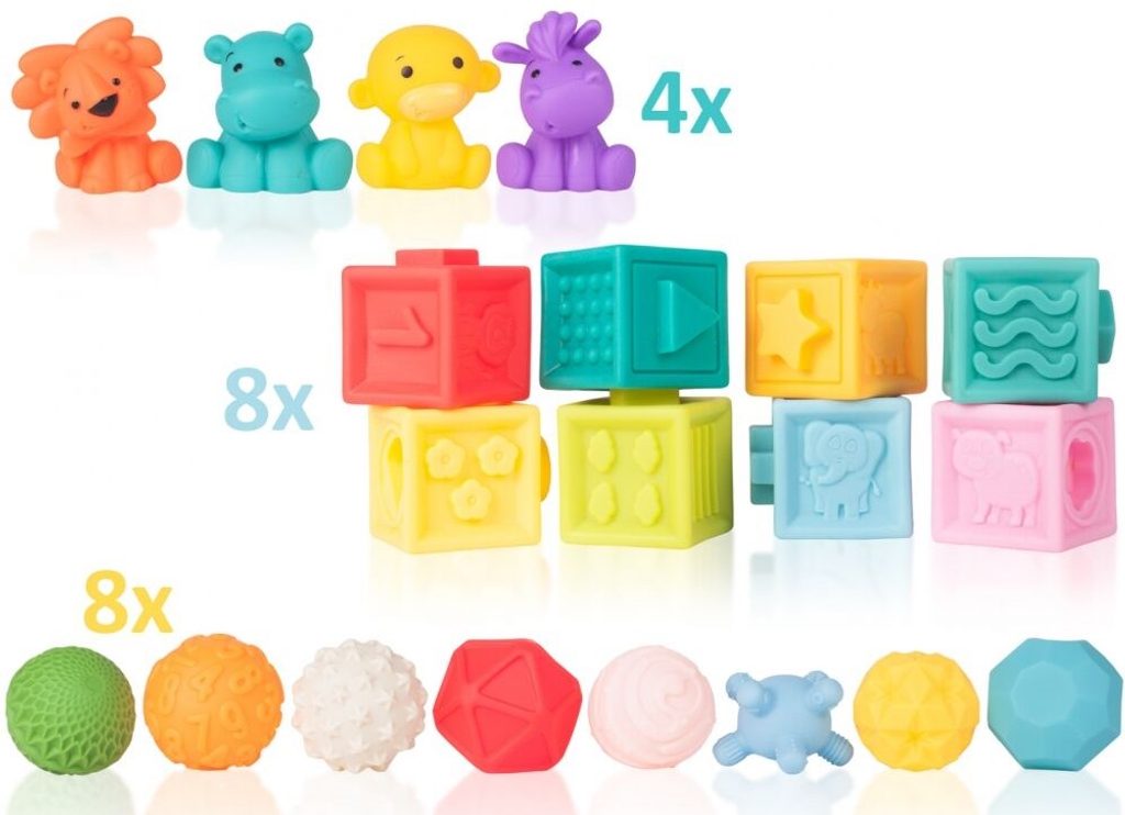 Sada měkkých senzorických hraček Bath Toys je určena pro ty nejmenší děti. Stimuluje u nich představivost, mysl, zrak a sluch. Zmáčknutím hračky se ozve zvuk a navíc tímto dítě posiluje ruce. V sadě najdete celkem 20 kusů. 8 míčků, 8 kostek a 4 zvířátka v různých barvách, tvarech a velikostech vyrobených ze zcela bezpečného materiálu. Hračka je určena pro děti od 6 měsíců věku.