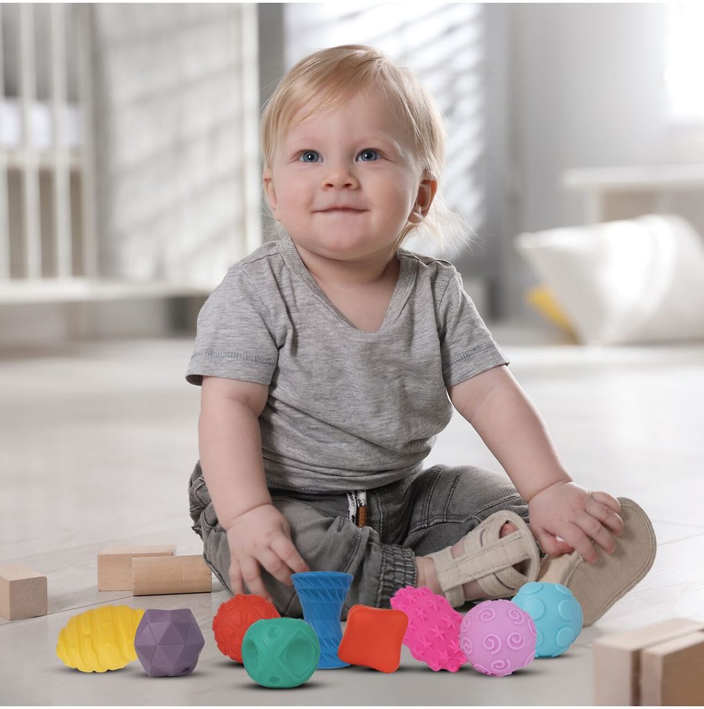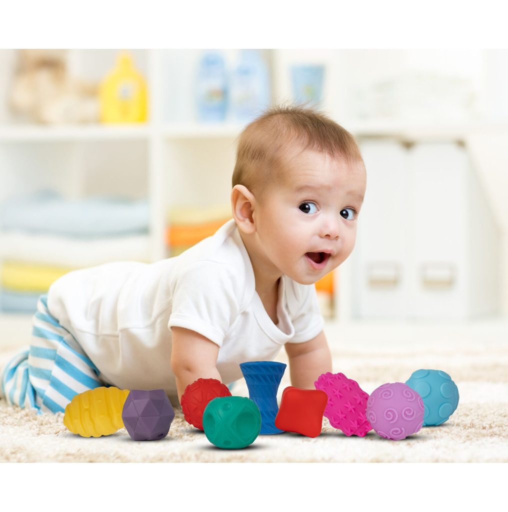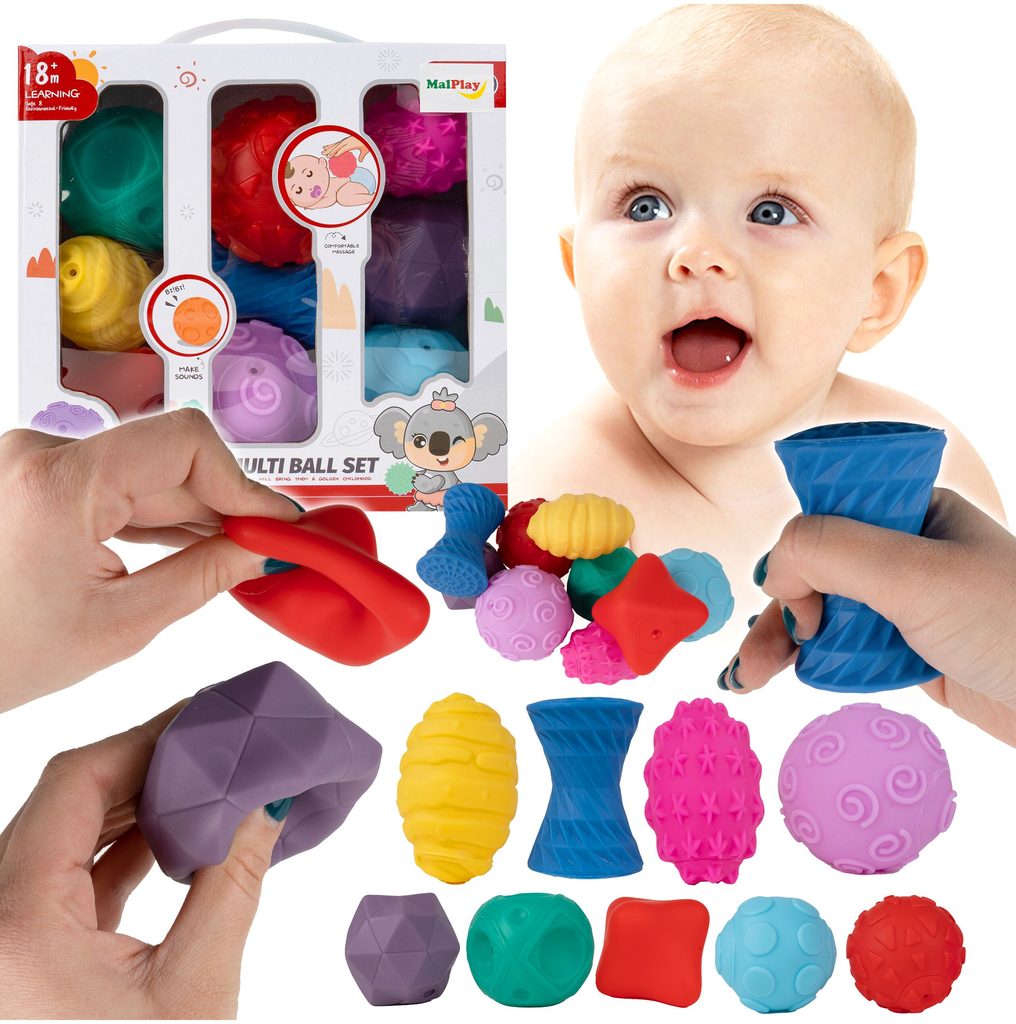 Sada měkkých senzorických míčků Multi Ball Set je určena pro ty nejmenší děti. Stimuluje u nich představivost, mysl, zrak a sluch. Zmáčknutím  dítě posiluje ruce. V sadě najdete celkem 9 míčků v různých barvách, tvarech a velikostech vyrobených ze zcela bezpečného materiálu. Hračka je určena pro děti od 18 měsíců věku.