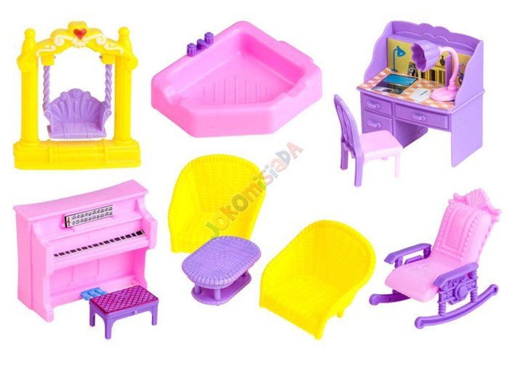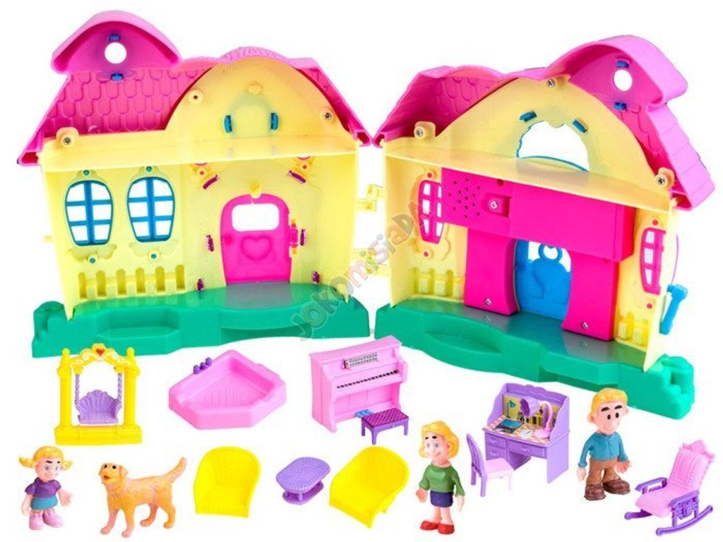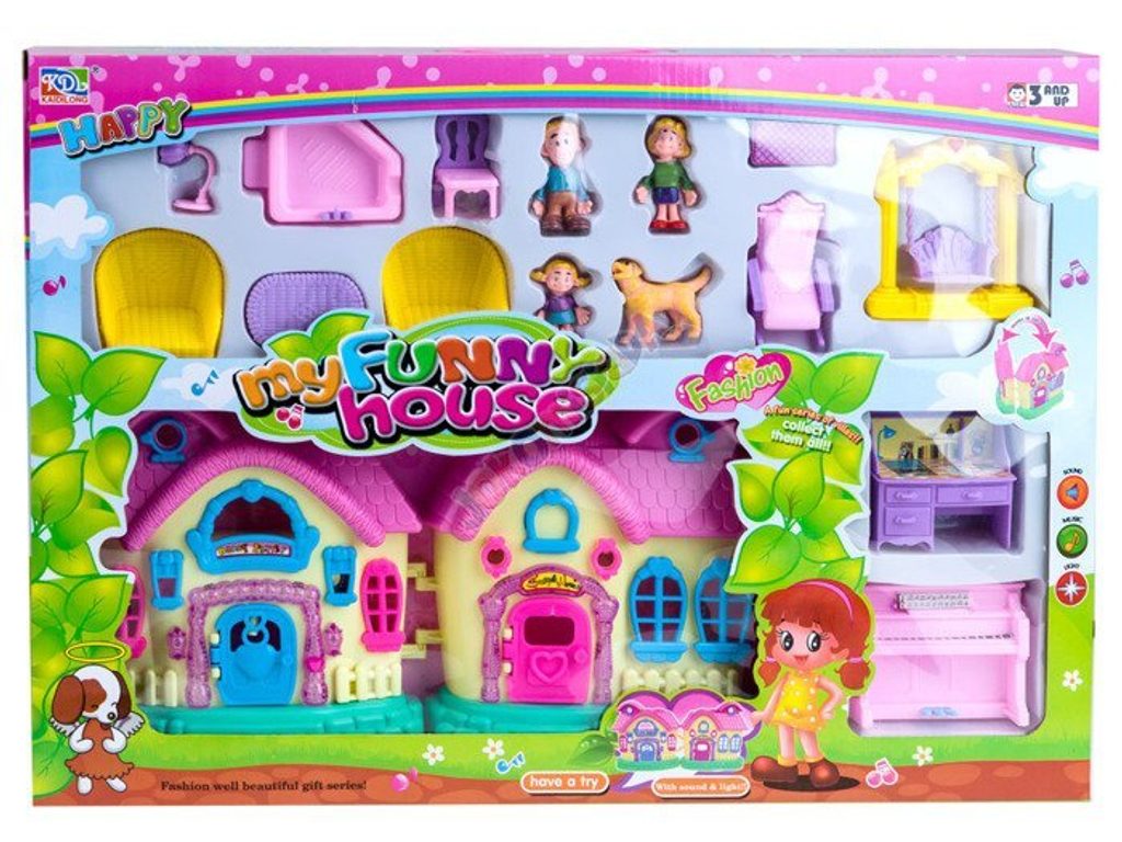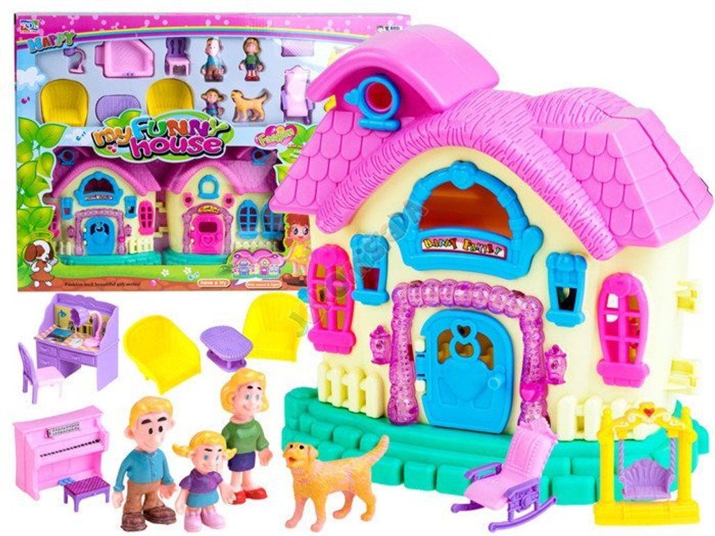 Dětský rozkládací domeček s postavičkami a kompletním vybavením My Funny House je ideální hračkou pro každou holčičku nebo chlapečka . Součástí domečku jsou 4 postavičky: máma, táta, dcera a pejsek. Je vybavený kompletním nábytkem, najdete zde křesla, stůl, židli, houpačku, psací stůl, klavír, houpací křeslo, židli, lampičku a dokonce i vanu. Dveře domečku jsou otevírací. Po zmáčknutí tlačítka ve tvaru srdíčka se ozve zvonek, štěkání pejska a rozsvítí se dveřní lampičky. Hračka je vyrobená z plastu v pestrobarevném provedení a určena pro děti od 3 let.