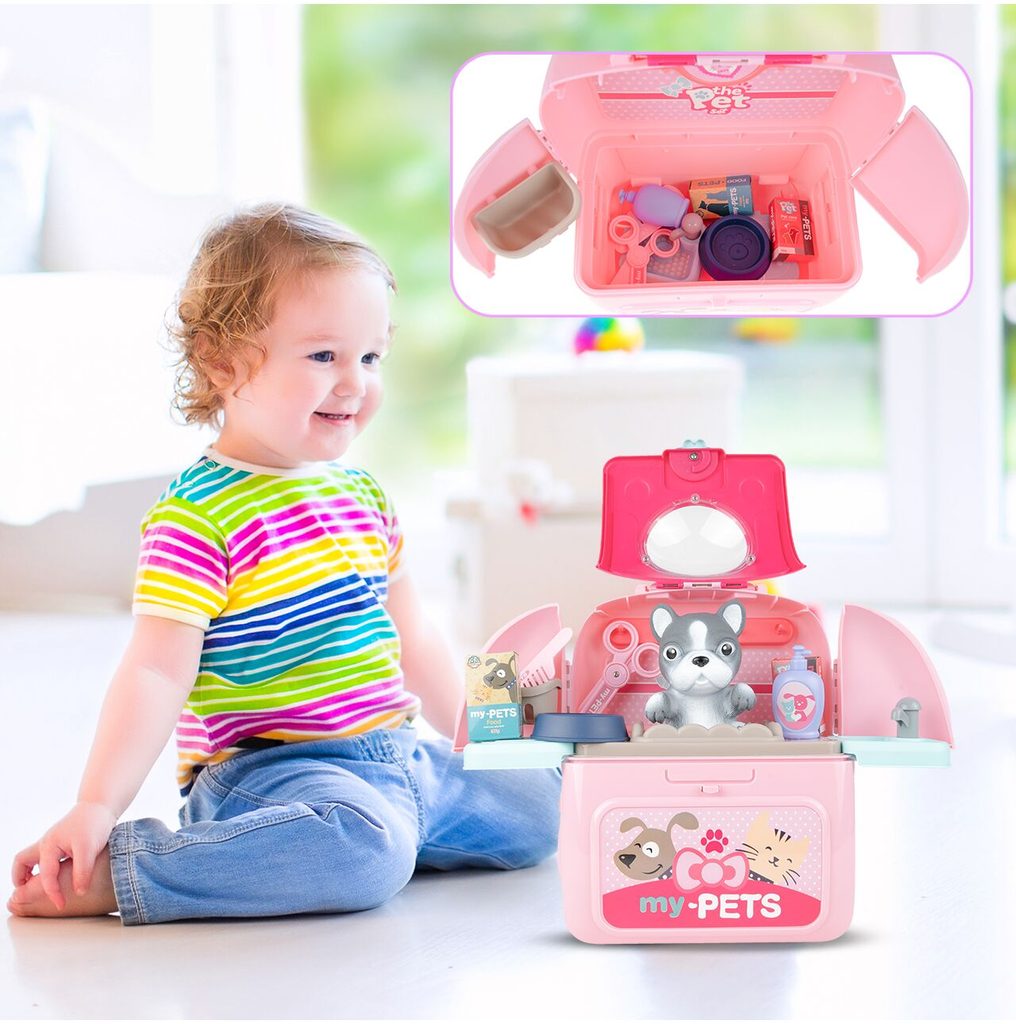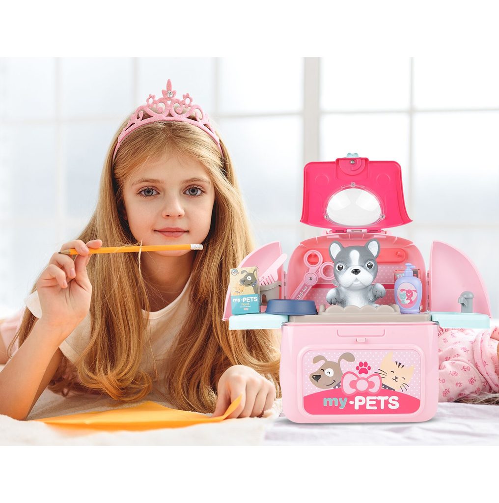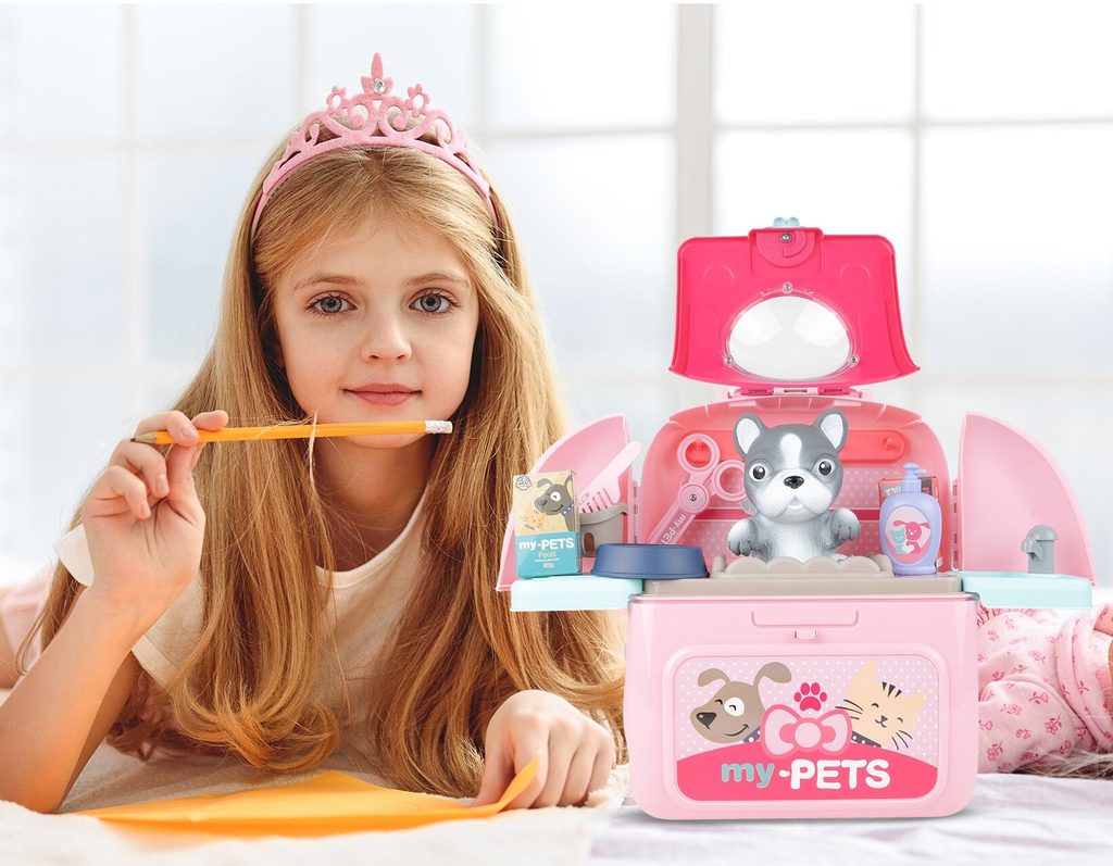 Rozkládací kosmetický salón pro pejska obsahuje vše potřebné pro péči o své oblíbené zvířátko. Lze ho jednoduše složit a rozložit a díky přiloženým popruhům ho lze jednoduše přenášet. Součástí salónu jsou kromě pejska také nůžky, hřeben, miska, umyvadlo s baterií a imitace kosmetiky. Hračka je vyrobená z plastu v pestrobarevném provedení a určena pro děti od 3 let.