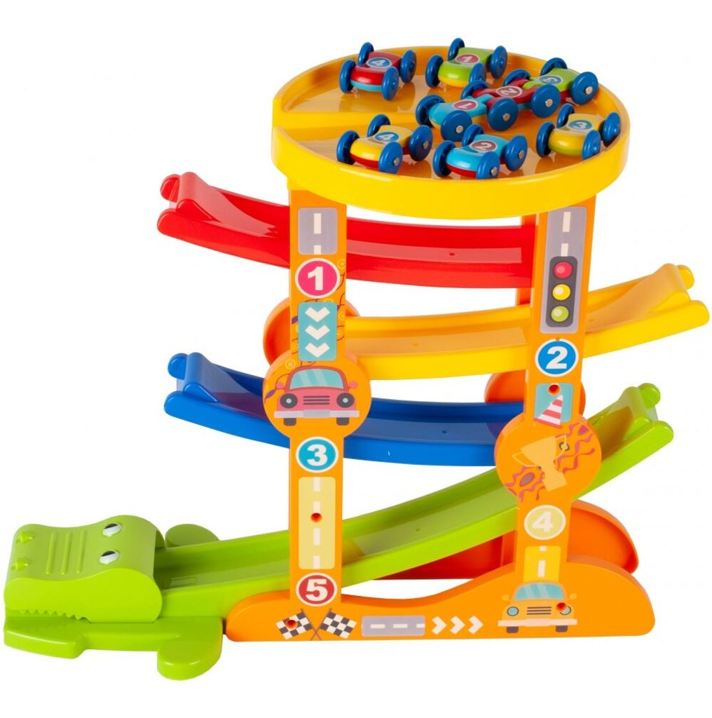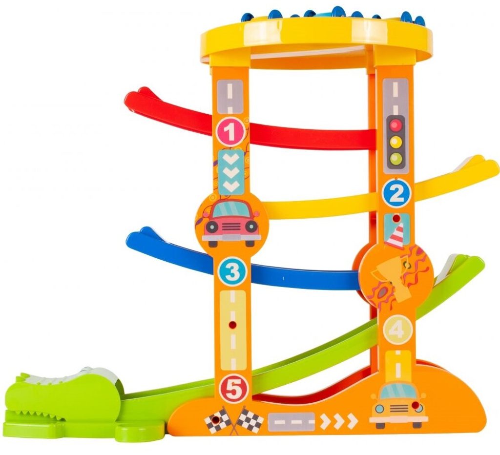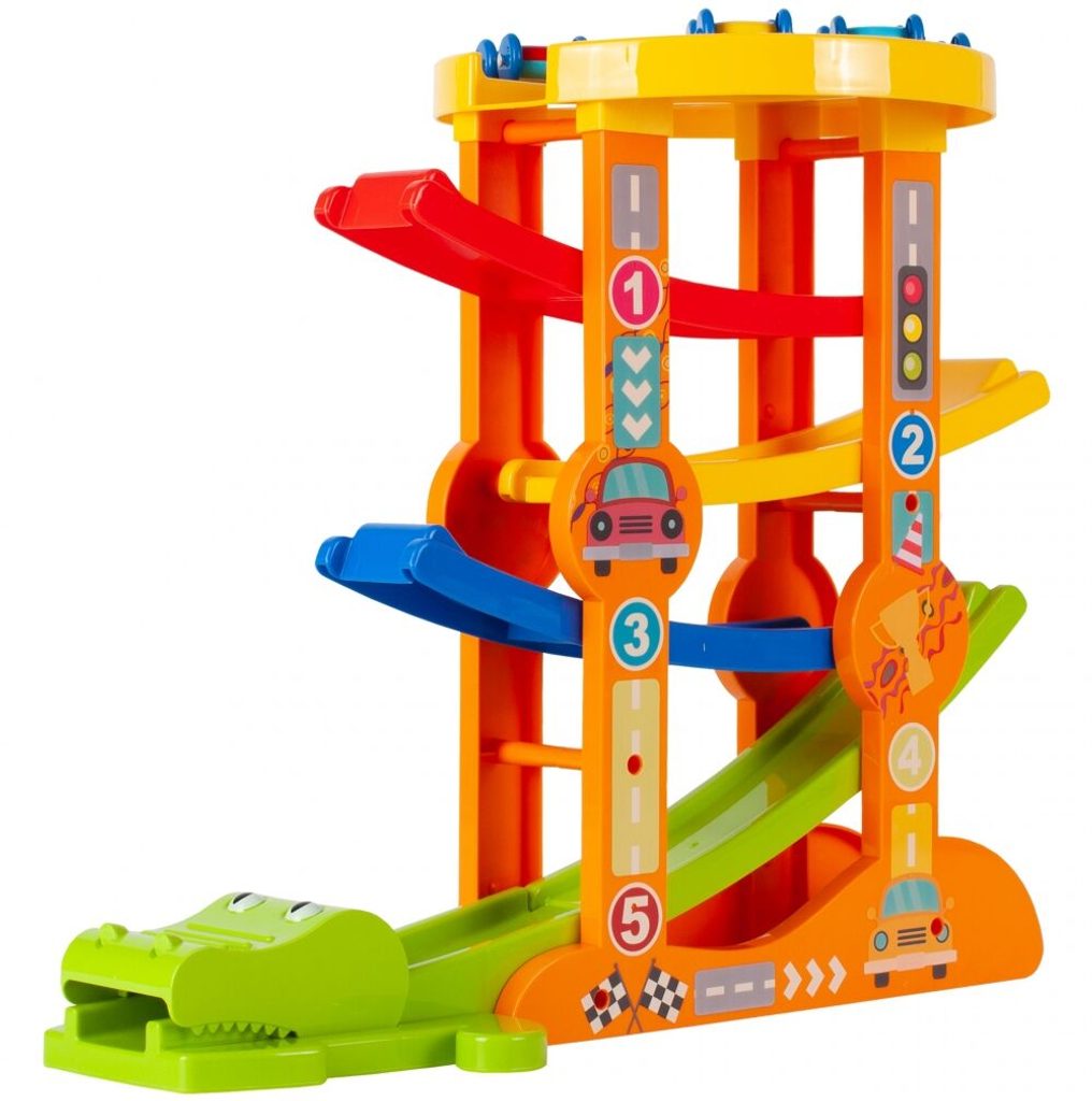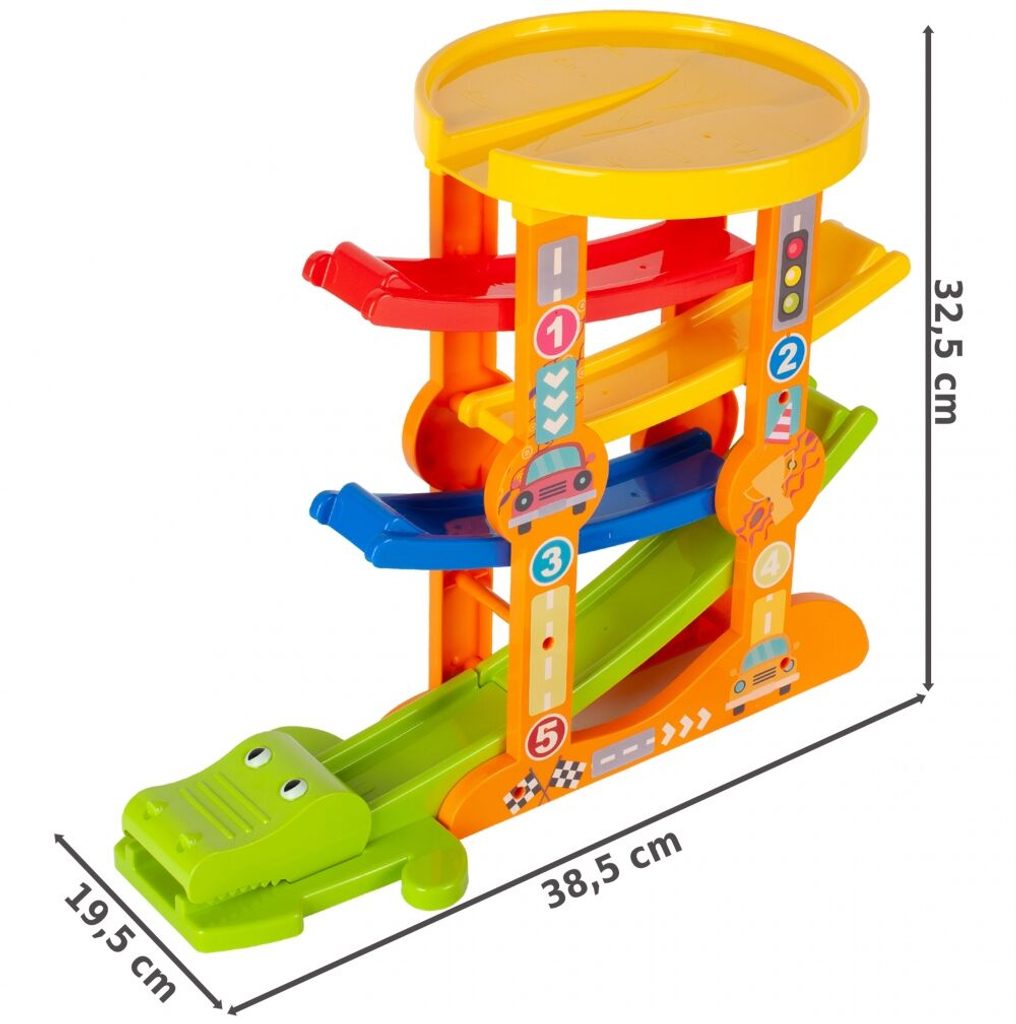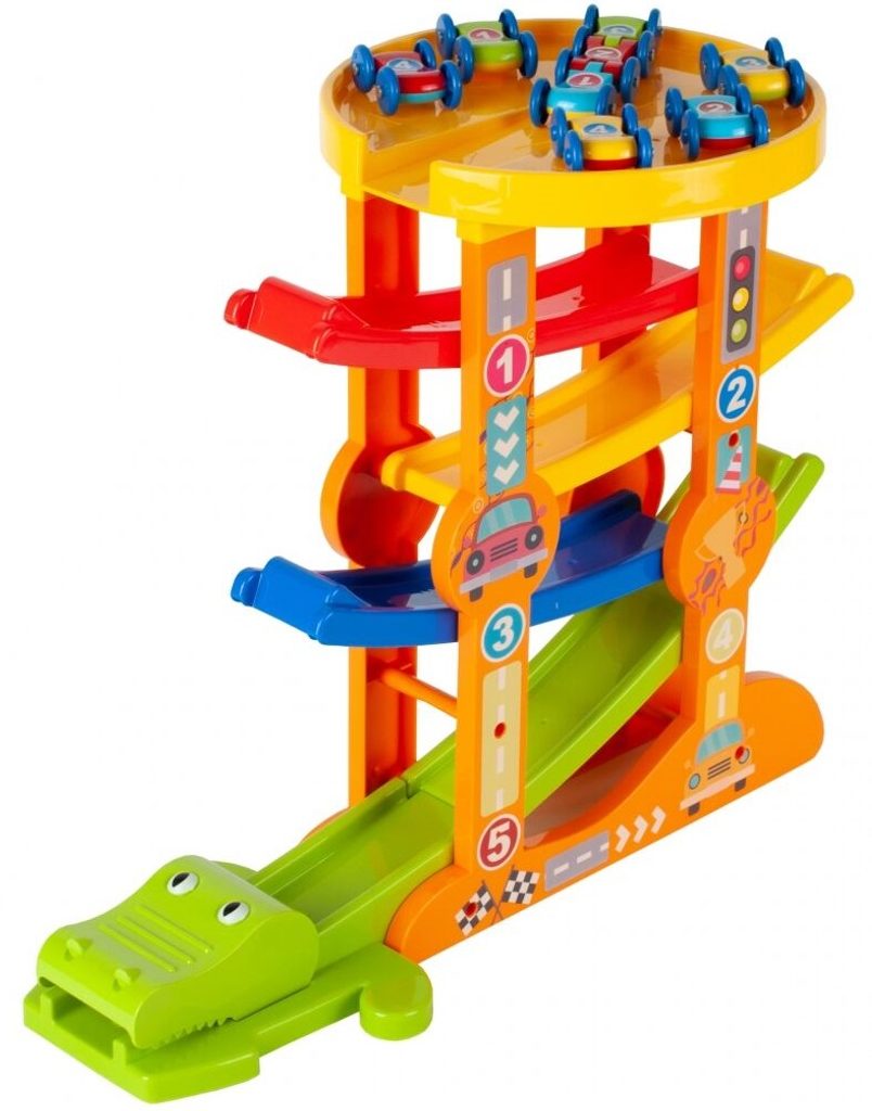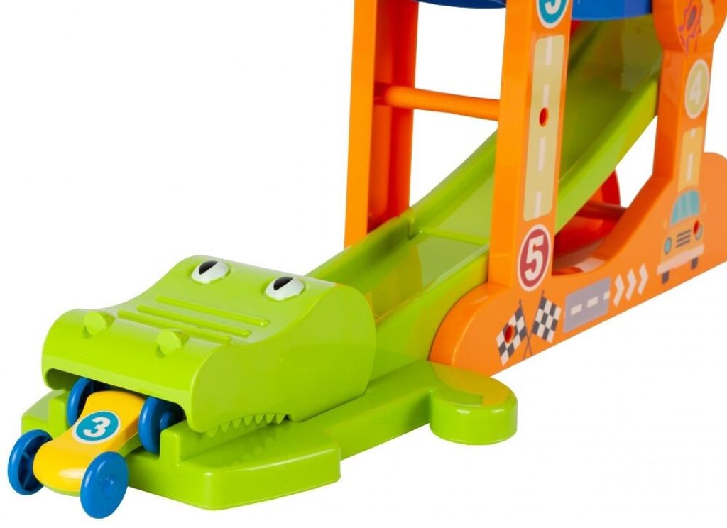 Skluzavka se 6 autíčky Krokodýl je skvělou zábavou pro nejmenší děti. Celkem 5 pater, které jsou propojeny tak, že autíčka, které jsou součástí balení mohou sjet zhora až dolů. Dole je umístěna hlava krokodýla, kterou autíčka vyjíždějí. Vše je vyrobeno z plastu v pestrobarevném barevném provedení. Hračka je určena pro děti od 36 měsíců věku.