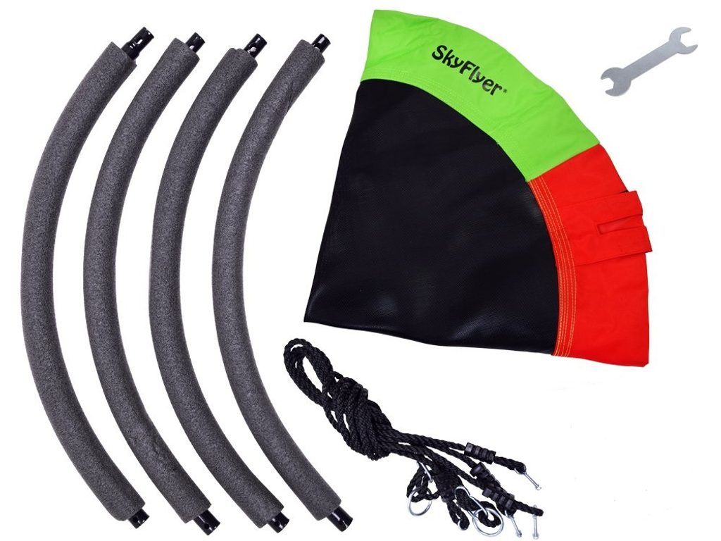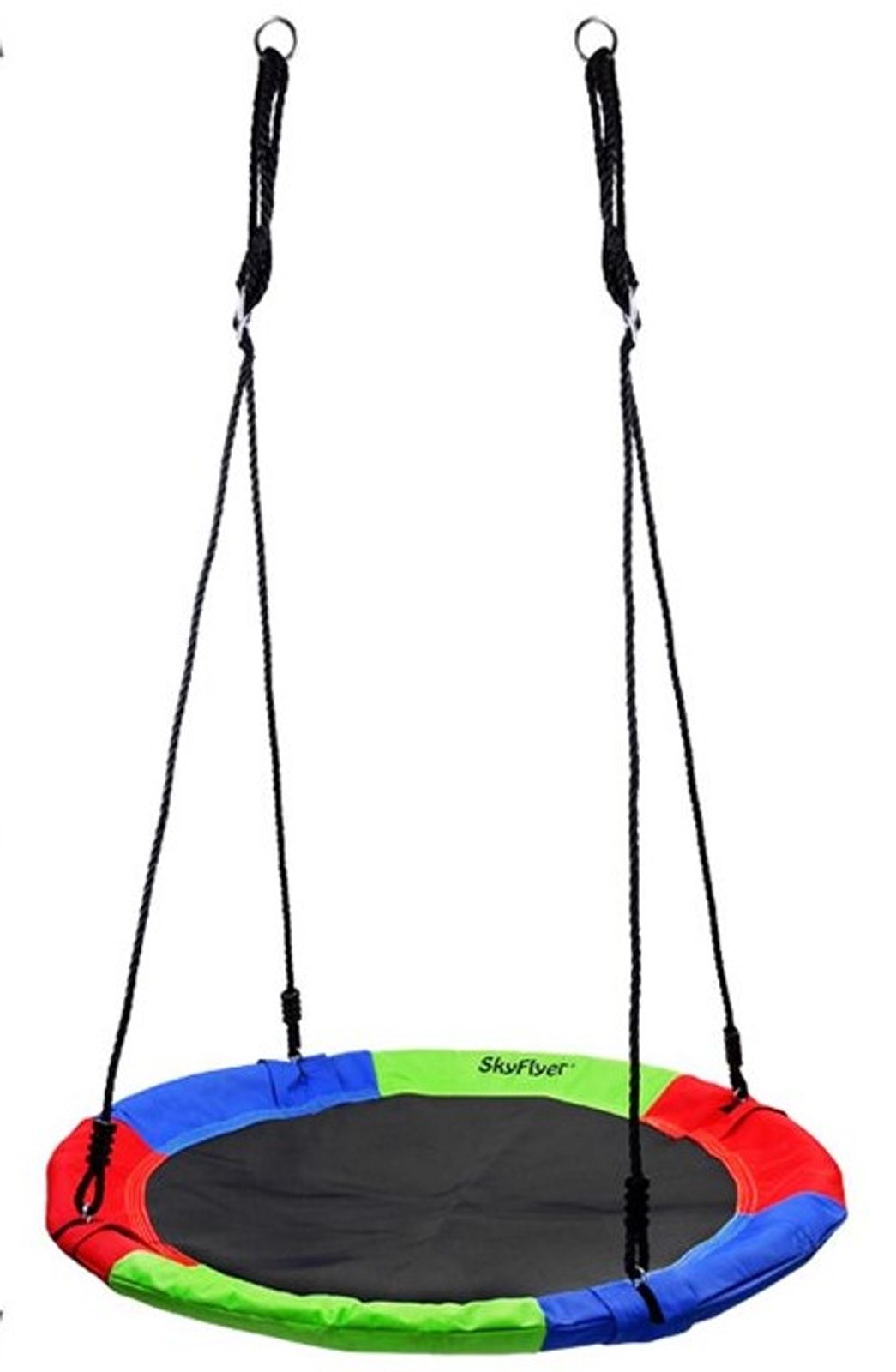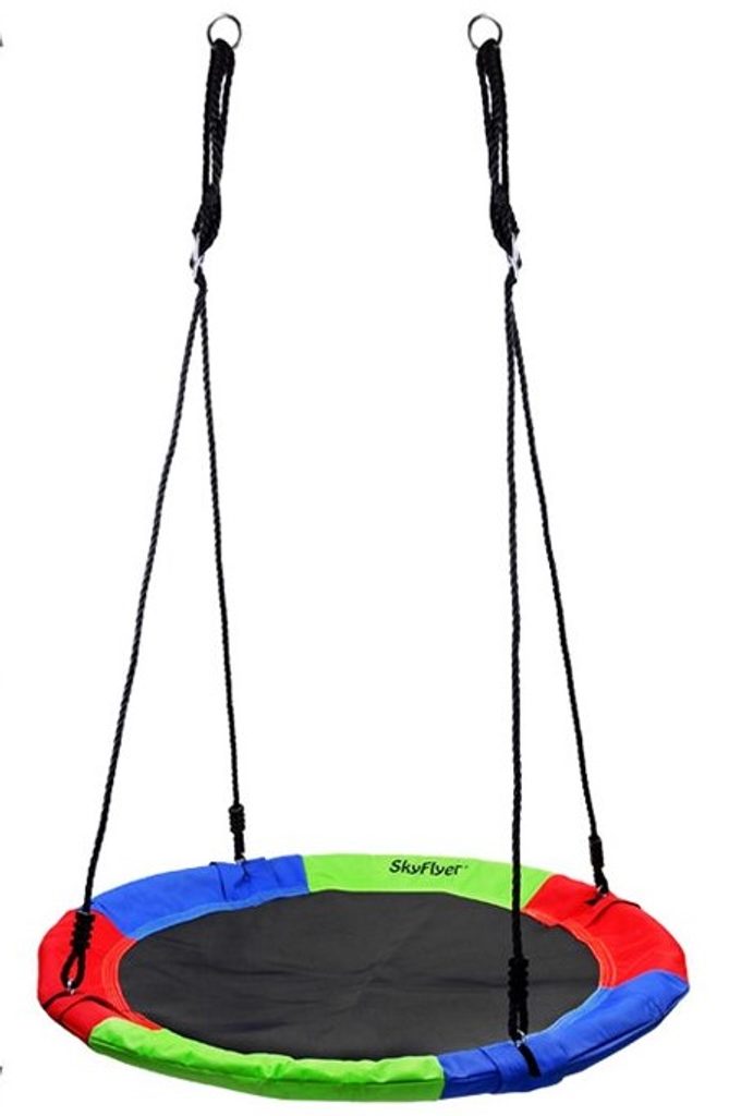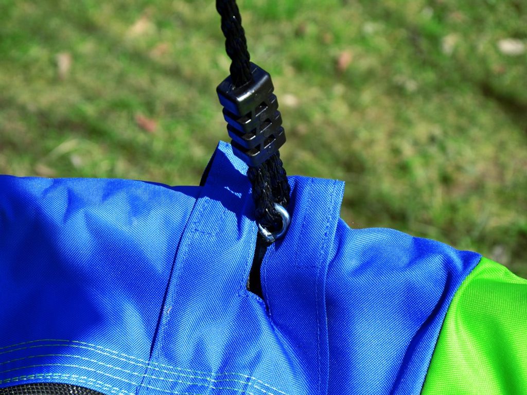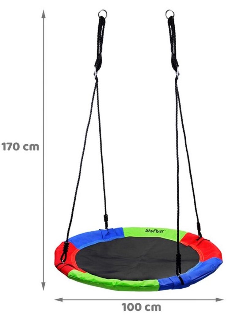 SkyFlyer dětská houpačka Čapí hnízdo je určena pro děti od 3 let věku. Je opatřena širokým sedadlem o průměru 100 cm vyrobeného z odolného pestrobarevného polyesteru. Závěsy jsou nastavitelné až do délky 170 cm a ukotvují se pomocí kovových šroubů. Velmi snadná montáž.