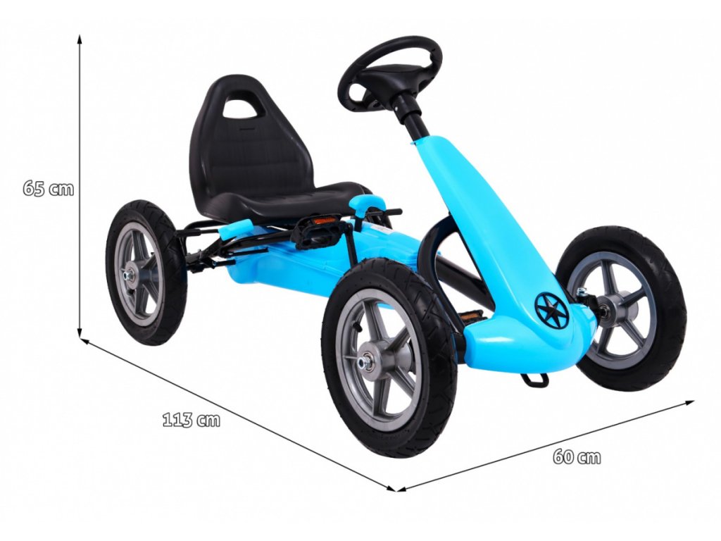 Dětská šlapací motokára Formule Star s velkými nafukovacími koly o průměru 30 cm je určena pro děti od 5 let a hmotnosti 50 kg. Pohon zajištuje řetěz, který je zabezpečen ochranným krytem. Pohodlné sedadlo lze posouvat směrem k volantu ve třech polohách. Motokára je vybavena ruční brzdou. Šlapátka mají na povrchu protiskluzovou úpravu. Motokára umožňuje jízdu vpřed, vzad a volnoběh. Rám motokáry je vyroben z kvalitního kovu.
