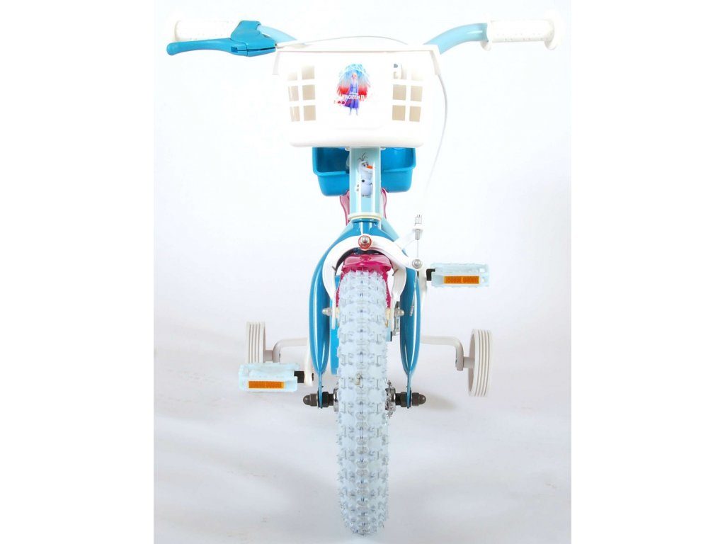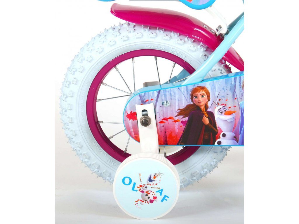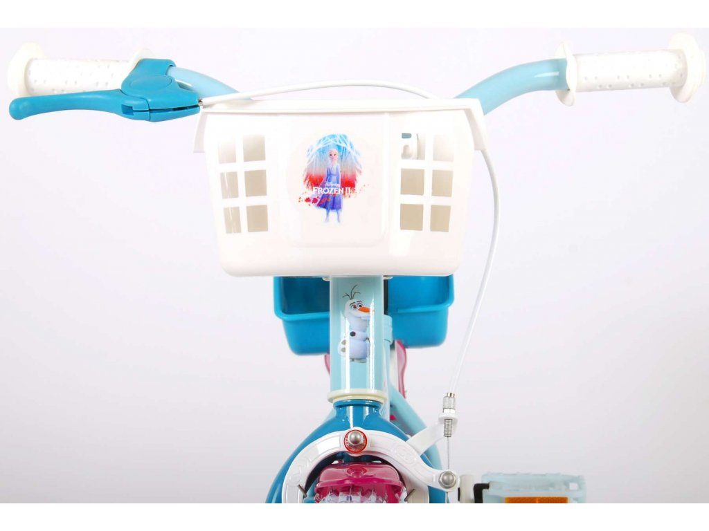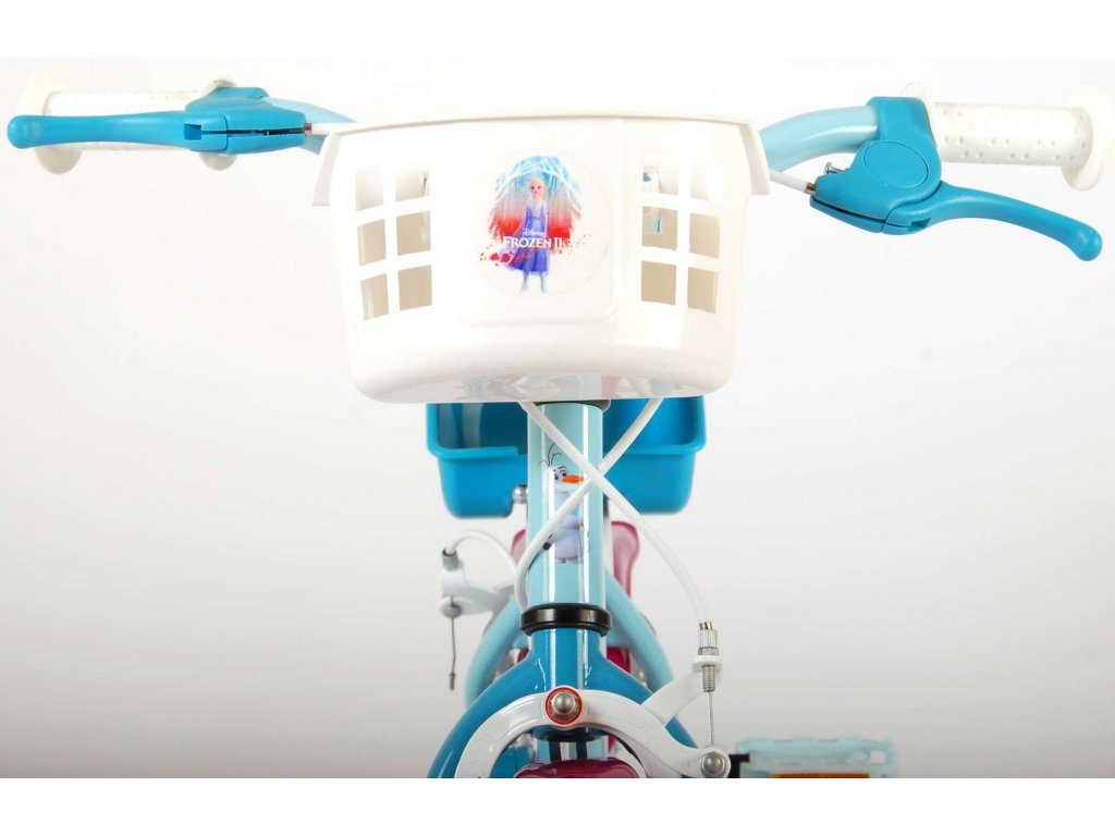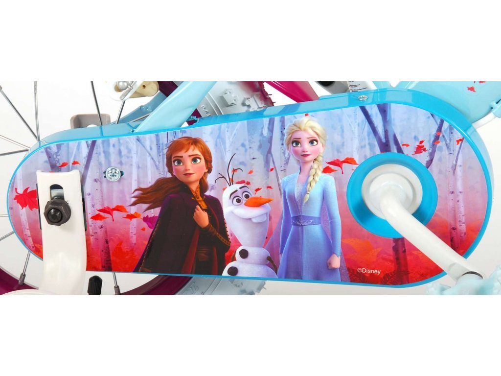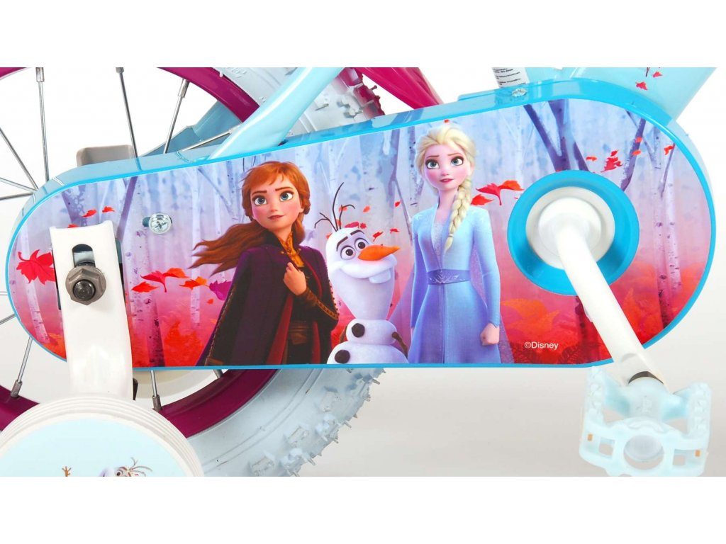 Originální dětské kolo od holandského výrobce Volare Frozen II (licence Disney) s velikostí ráfků 12 palců je určeno pro nejmenší děti ve věku od 3 do 4,5 let s výškou do 95 cm. Kolo je opatřeno demontovatelnými balančními kolečky, dítě se tedy bude cítit hned od první jízdy bezpečně a stabilně. Kolo je vybaveno 2 druhy brzd. Brždění probíhá buď protisměrnou zadní brzdou "torpédem",která možnuje brzdit zpětným záběrem pedálů nebo lze použít přední pákovou brzdu. Proti nechtěnému namotání nohavice nebo tkaničky do řetězu má kolo kryt s obrázky, který zakrývá celý řetěz. Sedadlo i řídítka jsou výškově nastavitelné. V zadní části je umístěný nosič na panenky a v přední části je košík na hračky.