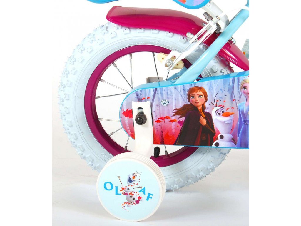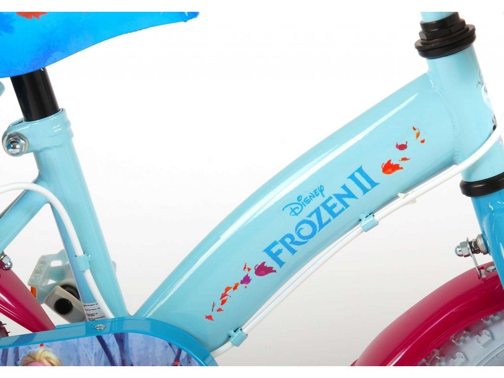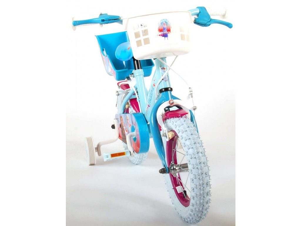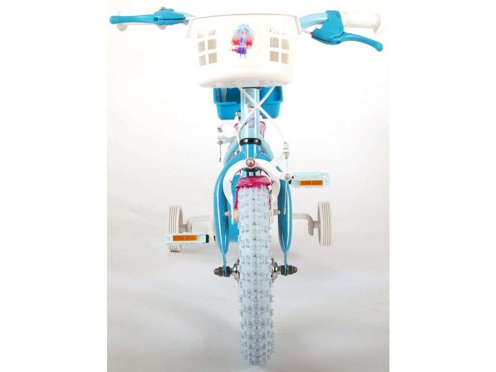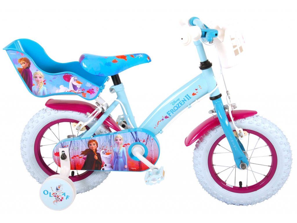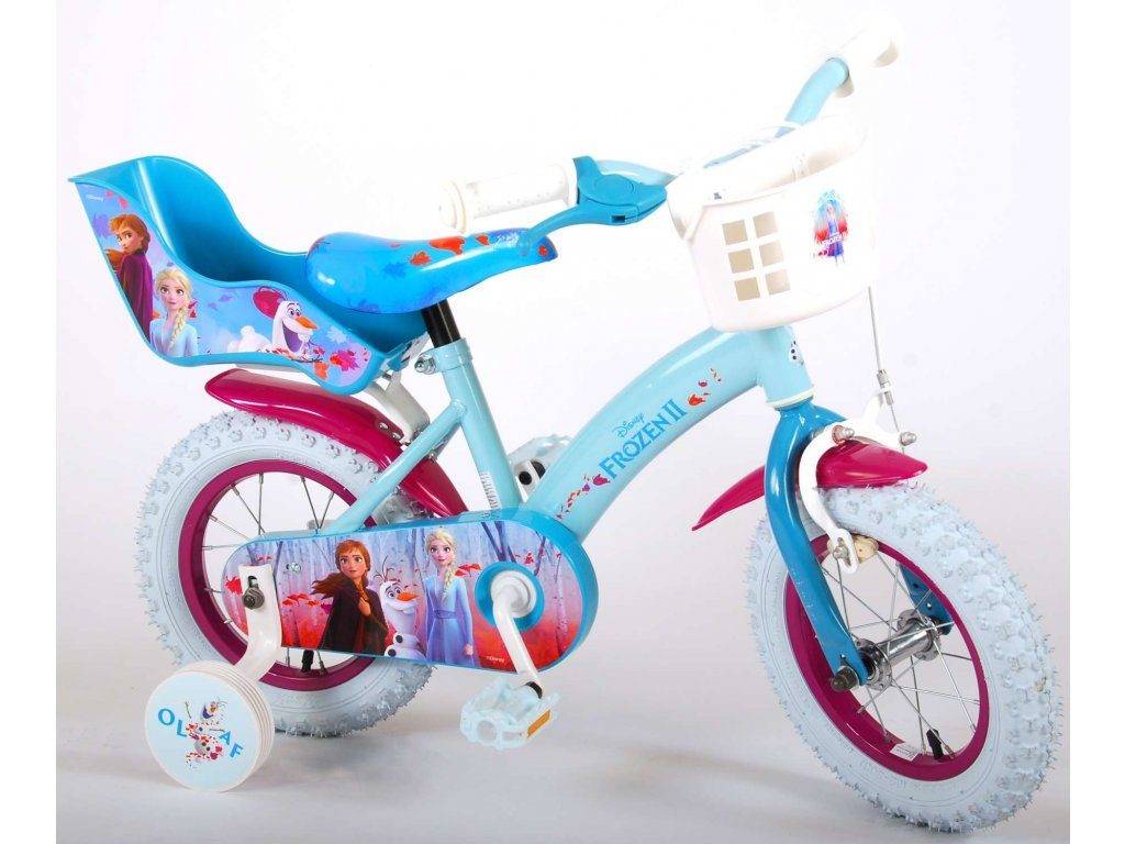 Originální dětské kolo od holandského výrobce Volare Frozen II (licence Disney) s velikostí ráfků 12 palců je určeno pro nejmenší děti ve věku od 3 do 4,5 let s výškou do 95 cm. Kolo je opatřeno demontovatelnými balančními kolečky, dítě se tedy bude cítit hned od první jízdy bezpečně a stabilně. Kolo je vybaveno 2 druhy brzd. Brždění probíhá buď protisměrnou zadní brzdou "torpédem",která možnuje brzdit zpětným záběrem pedálů nebo lze použít přední pákovou brzdu. Proti nechtěnému namotání nohavice nebo tkaničky do řetězu má kolo kryt s obrázky, který zakrývá celý řetěz. Sedadlo i řídítka jsou výškově nastavitelné. V zadní části je umístěný nosič na panenky a v přední části je košík na hračky.