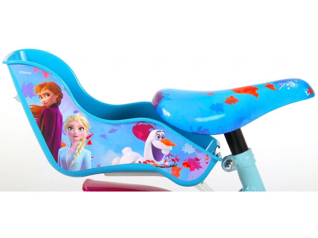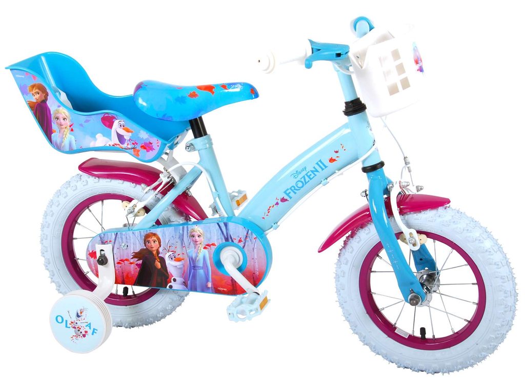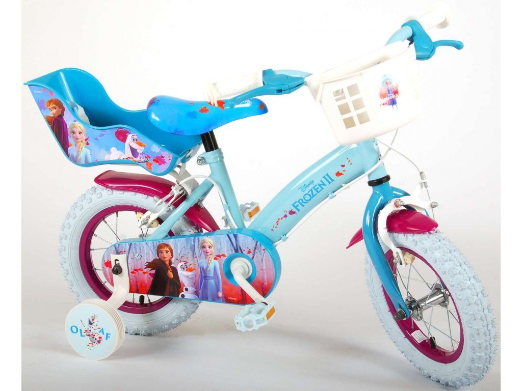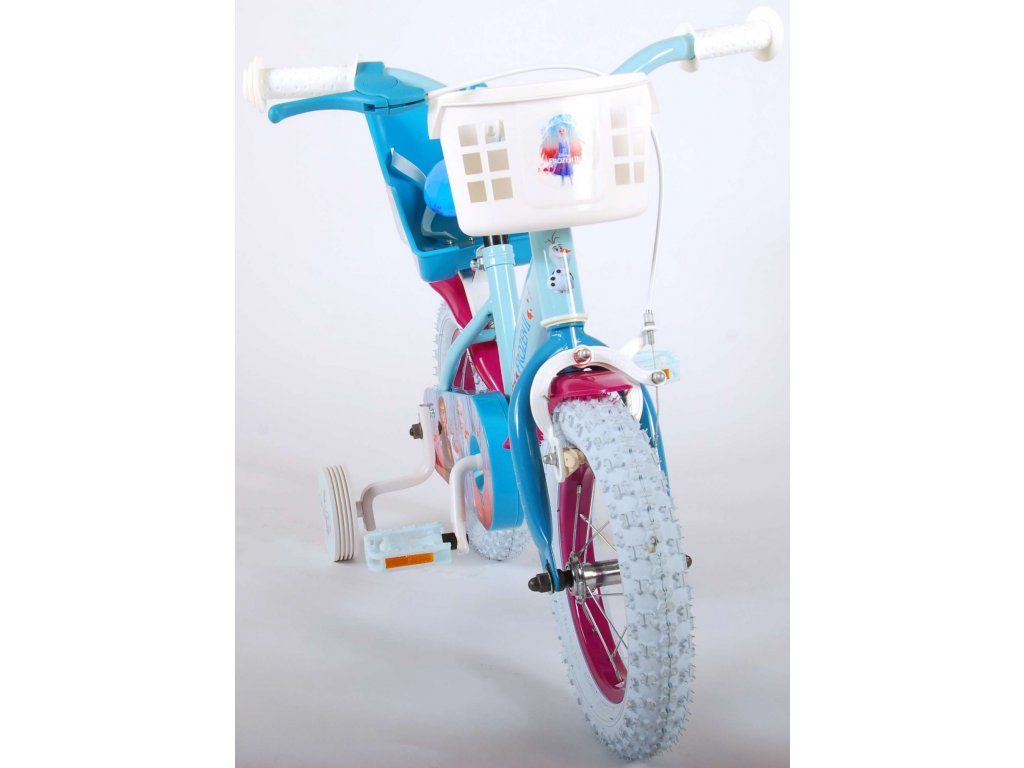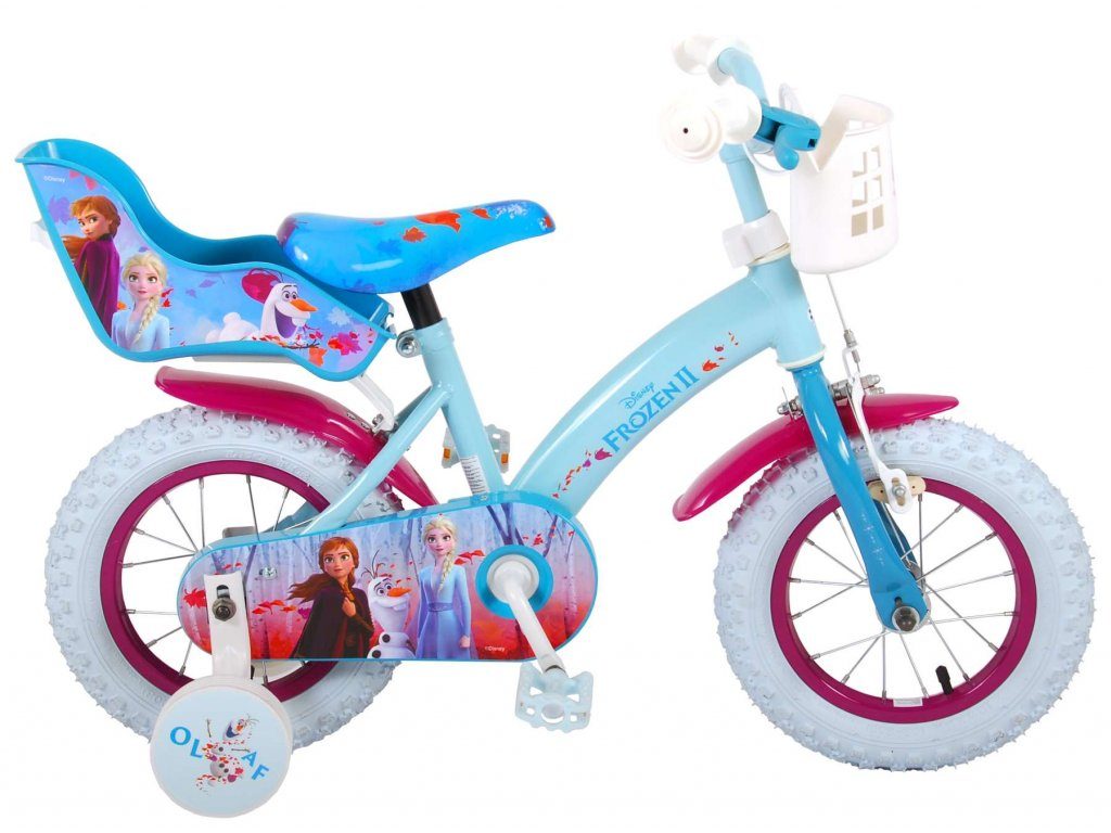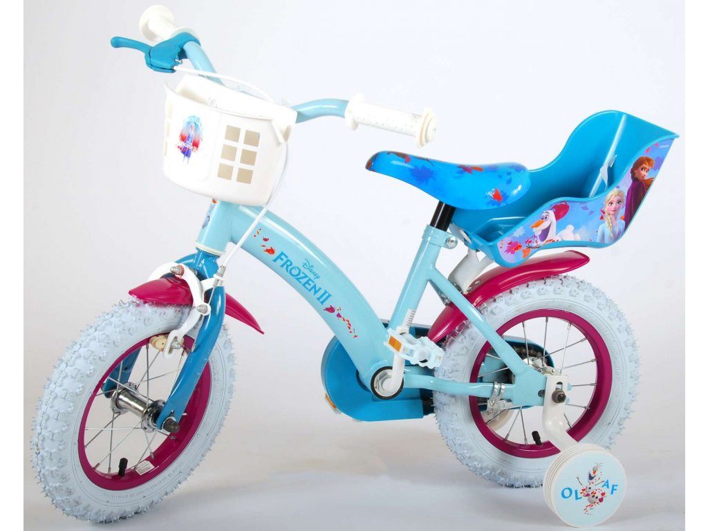 Originální dětské kolo od holandského výrobce Volare Frozen II (licence Disney) s velikostí ráfků 12 palců je určeno pro nejmenší děti ve věku od 3 do 4,5 let s výškou do 95 cm. Kolo je opatřeno demontovatelnými balančními kolečky, dítě se tedy bude cítit hned od první jízdy bezpečně a stabilně. Kolo je vybaveno 2 druhy brzd. Brždění probíhá buď protisměrnou zadní brzdou "torpédem",která možnuje brzdit zpětným záběrem pedálů nebo lze použít přední pákovou brzdu. Proti nechtěnému namotání nohavice nebo tkaničky do řetězu má kolo kryt s obrázky, který zakrývá celý řetěz. Sedadlo i řídítka jsou výškově nastavitelné. V zadní části je umístěný nosič na panenky a v přední části je košík na hračky.