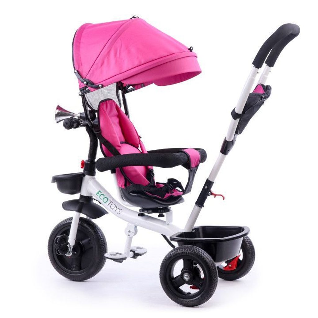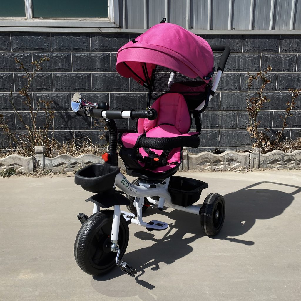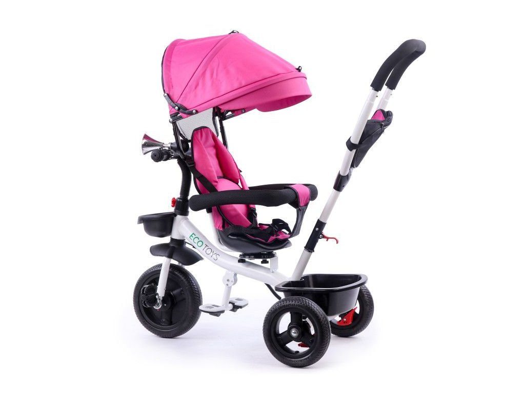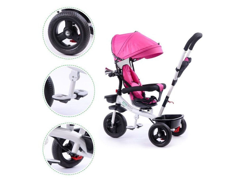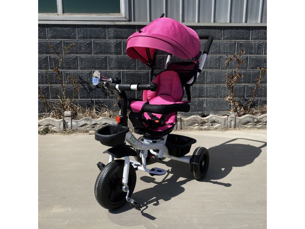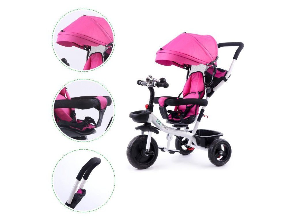 Dětská tříkolka Ecotoys S360 s otočným sedadlem je určena pro děti od 1 do 5 let. Vybavena praktickou odnímatelnou stříškou proti slunci a dešti. V zadní části je umístěn velký koš na hračky, v přední části potom menší košík. Tříkolka má pevnou ocelovou konstrukci a odolná EVA kola usazená v pevných plastových ráfcích. Madlo a 5 bodové bezpečnostní pásy zabraňují vypadnutí dítěte z kočárku. Na řídítkách je umístěný klakson. Pro větší bezpečnost mohou tříkolku řídit i rodiče a zadní kola mají 2 nezávislé brzdy. Sedadlo lze otočit o 360° a to ve směru jízdy nebo čelem k rodiči a navíc usnadní nastupování nejmladším dětem.