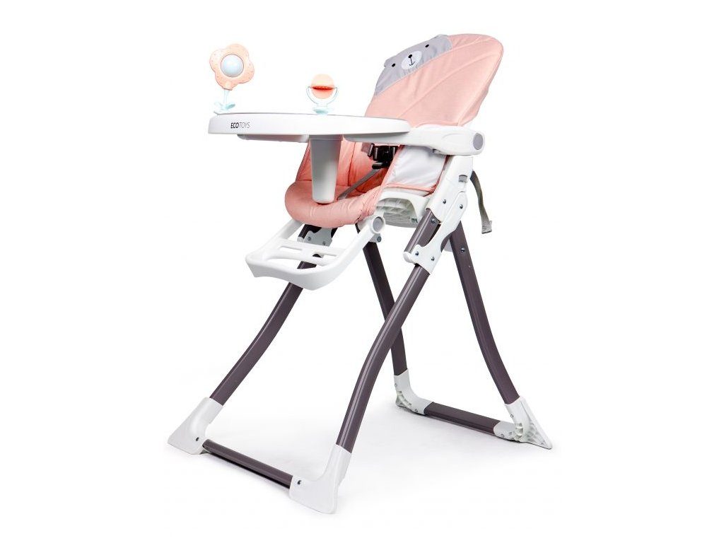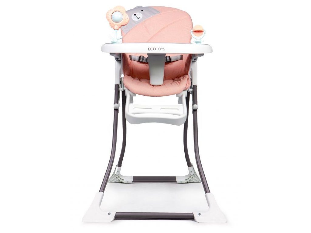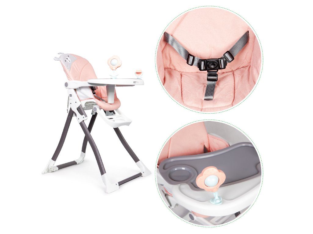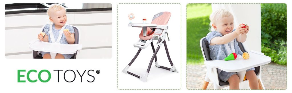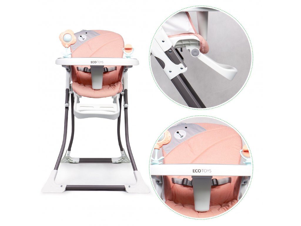 Jídelní židlička Ecotoys se stolečkem 2v1 a zabudovanými hračkami. Pomocí jednoho tlačítka ji lze velmi jednoduše složit a rozložit, což oceníte zejména při cestách. Jídelní tác má zvýšené okraje, lze ho odejmout a nastavit ve třech polohách dle věku dítěte. Je rozdělený na 2 části, kdy jedna slouží pro zábavu a druhá pro stravování. Praktické polstrování je vyrobeno s nesavého materiálu, lze ho snadno udržovat, čistit a prát v pračce. Na ochranu dítěte před vypadnutím je židlička vybavena 3 bodovými bezpečnostními pásy a pod jídelním tácem je umístěna blokace proti sesunutí dítěte. Na koncích noh jsou koncovky s protiskluzovou úpravou.