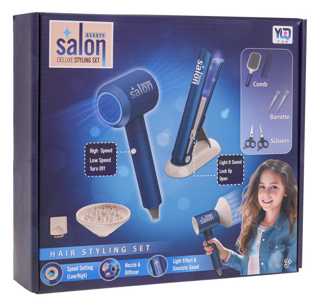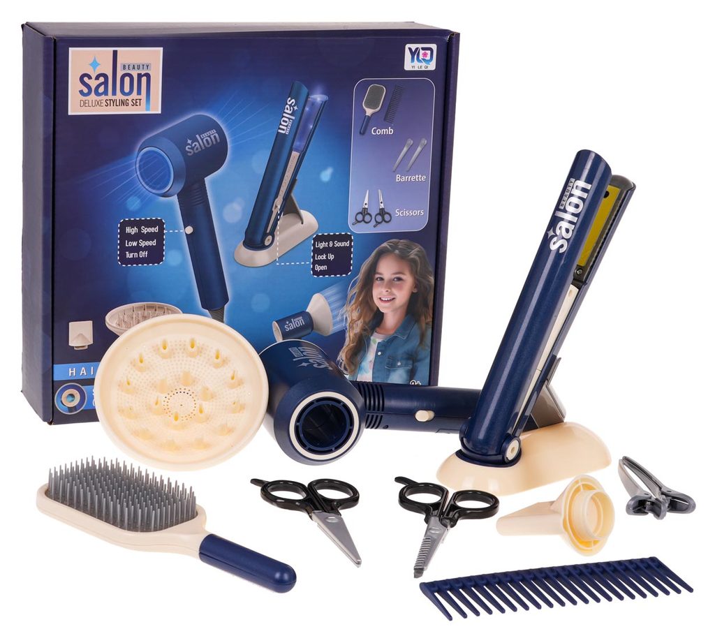 Souprava malé kadeřnice Beauty Salon musí být součástí pokojíčku každé malé princezny. Je vybavena spoustou důležitých věcí pro každou malou kadeřnici. Sada obsahuje fén na baterii, žehličku na vlasy na baterii, nůžky, nástavce, hřeben na vlasy, sponky, stojánek a kartáč. Hračka je určena pro děti od 36 měsíců věku.