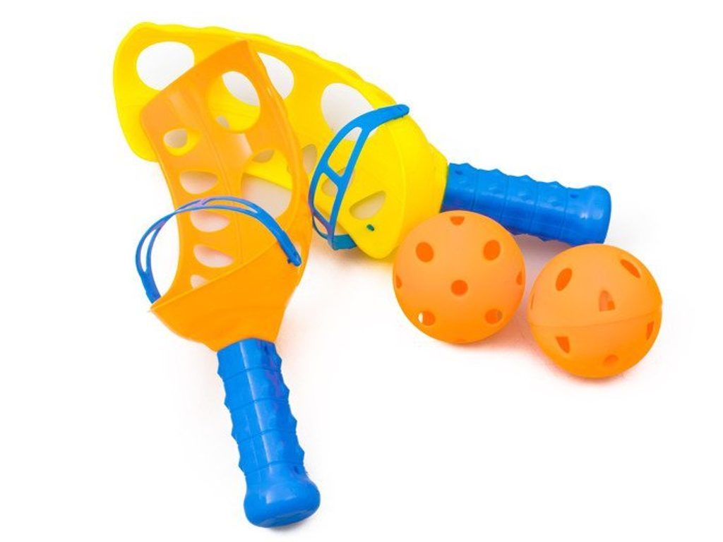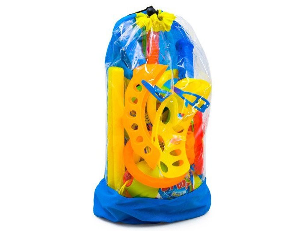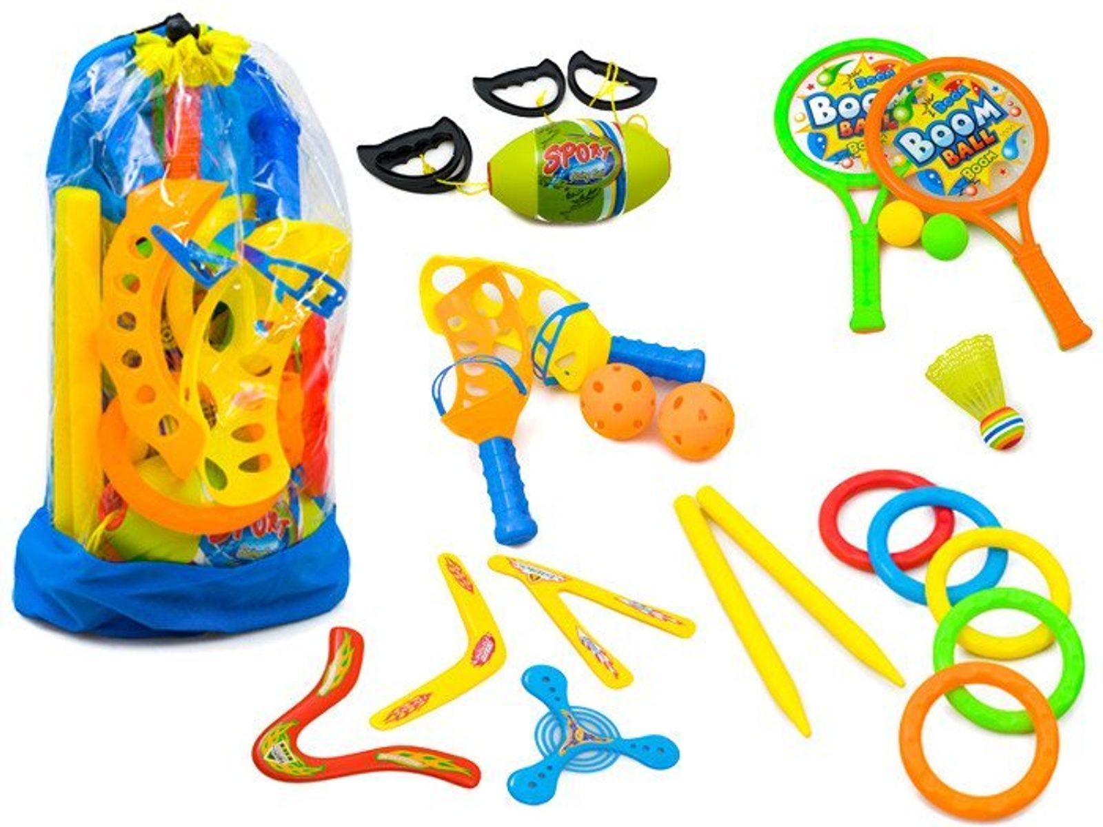 Tento sportovní set je ideální pro všechny děti, které rádi tráví čas aktivně. Jedná se o sadu sportovních potřeb pro malé i velké. Ideální na dovolenou, na dvůr nebo na zahradu. Obsahuje pálky na badminton, lapače míčků, 4 různé druhy bumerangů, plastové kolíky spolu s házecími kroužky a také kouli na dvojité šňůrce kterou se dva hráči snaží co nejrychleji dostat od sebe. Vše je uloženo v praktickém batůžku.