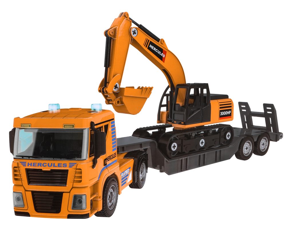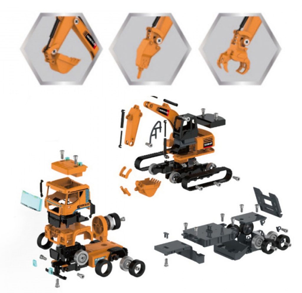 Souprava nákladního auta a bagru je vhodná pro děti od tří let. Sada se skládá z celkem 185 prvků. Hračka má zvukové a světelné efekty. Světla na náklaďáku blikají a jsou slyšet zvuky zapalování, couvání a houkání auta. Kabina nákladního automobilu se vyklápí dopředu. Šroubovák/vrtačka vydává zvuky při vrtání nebo vyšroubování a rozsvítí se modrá LED. Kabina rypadla se otáčí o 360 stupňů a rameno s lopatou se pohybuje nahoru a dolů a provádí nakládací a vyklápěcí manévry. Sada obsahuje 3 vyměnitelné nástavce na bagr: lžíci, vrtačku a drapák. Auto má gumové pneumatiky a zvládne různé terény.