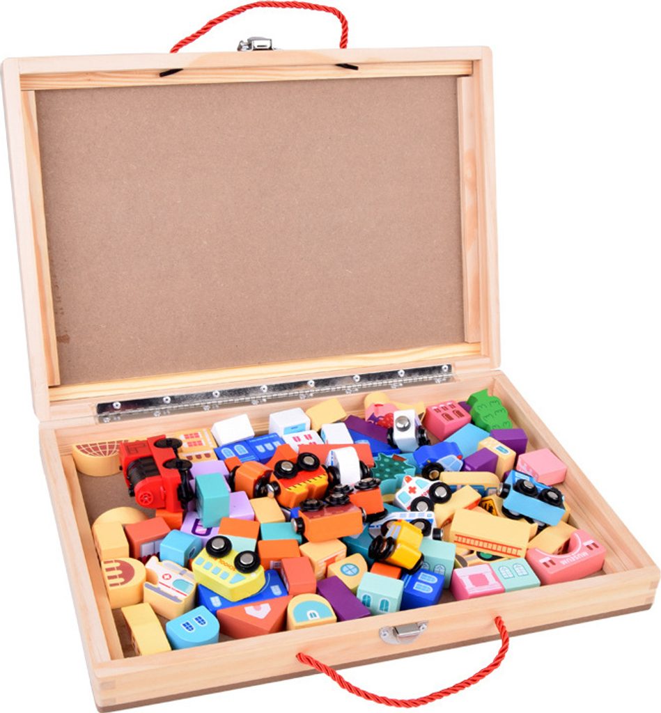 Dřevěný kufr: Sada je zabalena v pevném dřevěném kufru, který slouží nejen jako městská základna, ale také umožňuje snadné skladování a přepravu kostek a příslušenství.