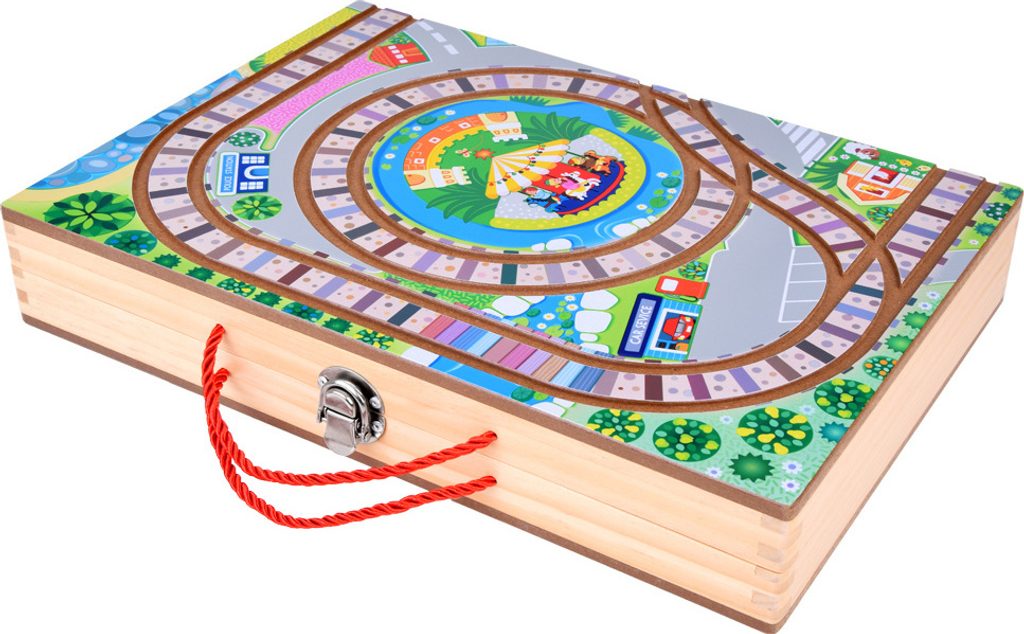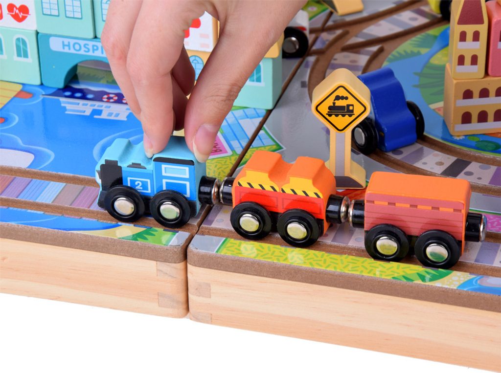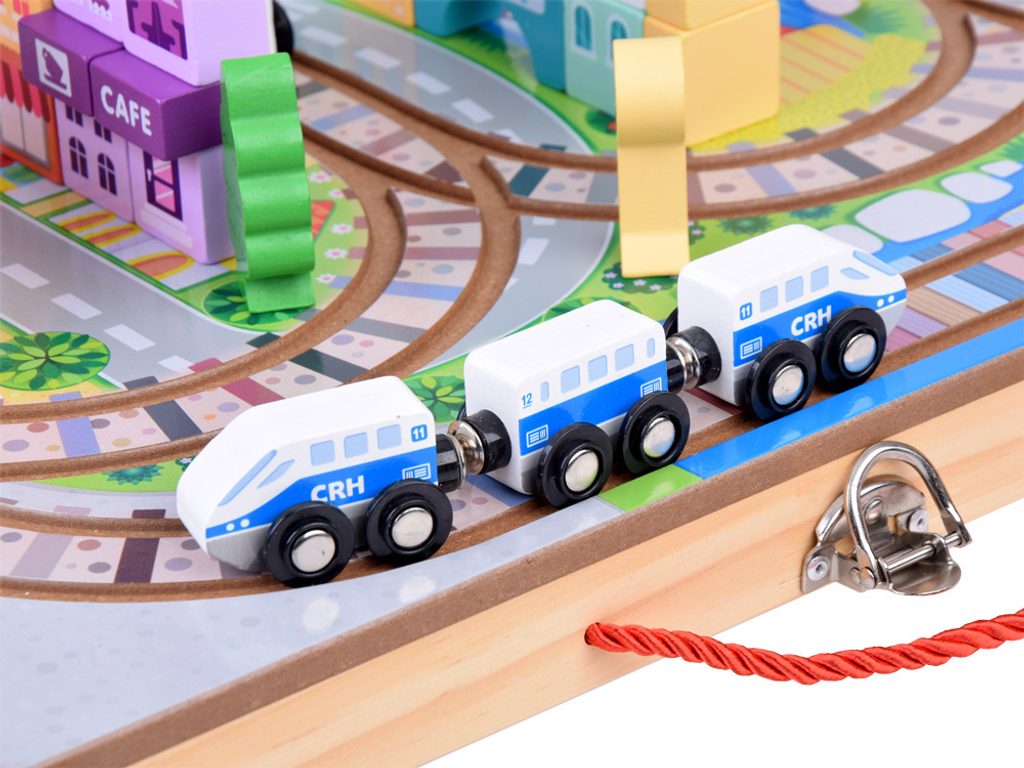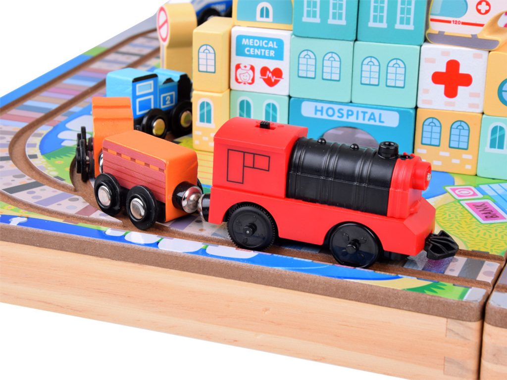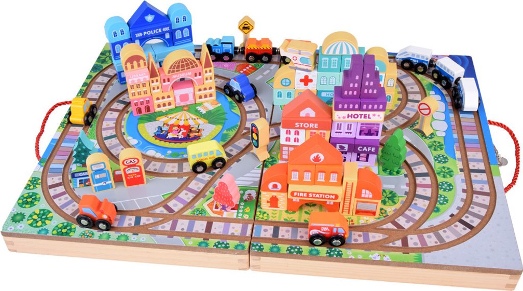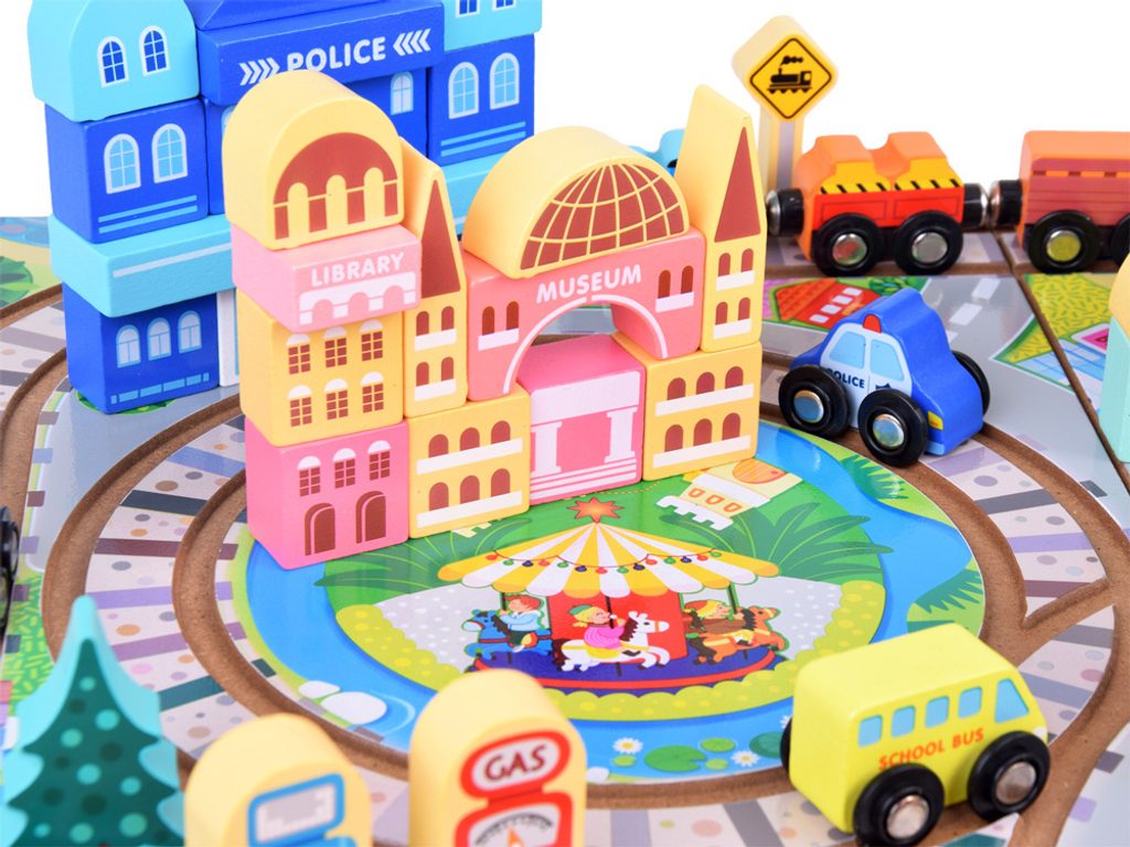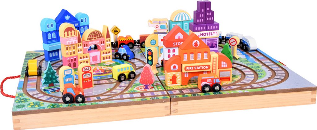 Trať: Město obklopuje síť kolejí, která dítěti umožňuje plánovat trasy a cesty vlaku. Děti si mohou vytvářet vlastní příběhy pohybem vlaku po městě.