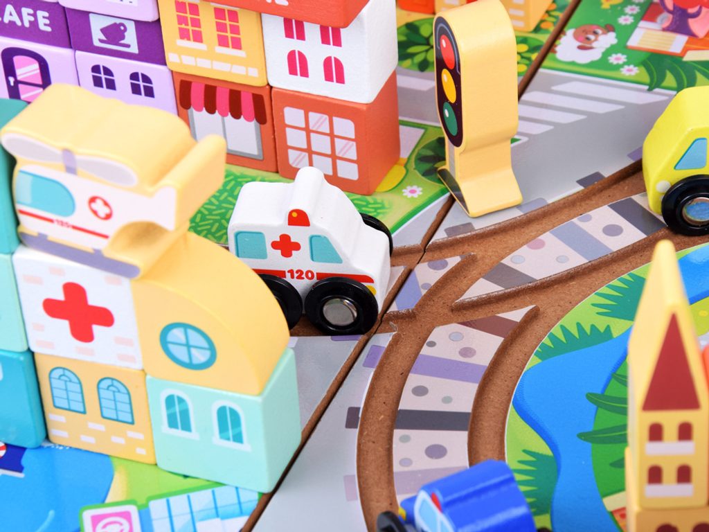 Sada městských bloků: Obsahuje různé dřevěné bloky, které lze kombinovat a uspořádat do libovolných konfigurací, což vám umožní postavit město s domy, obchody a dalšími budovami v okouzlujících pastelových barvách.
