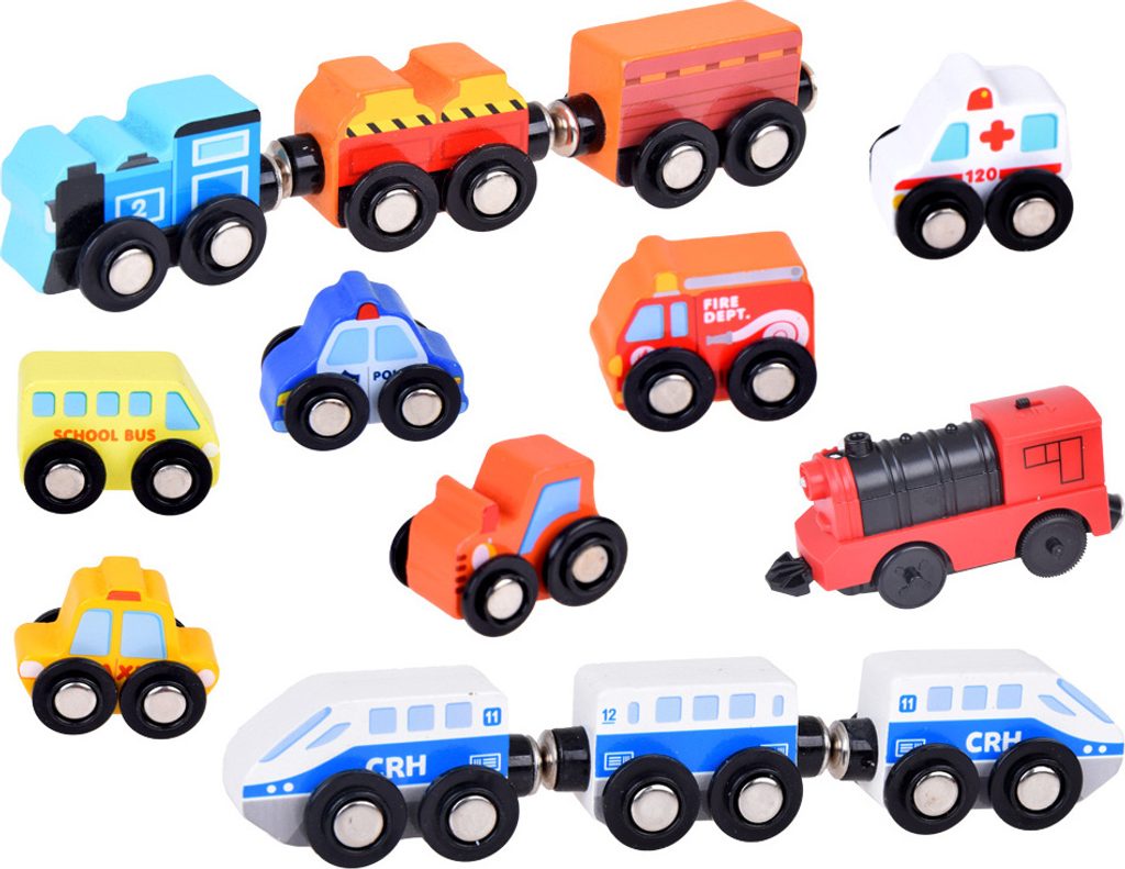 Vlak na baterie: Vlak, napájený baterií (1,5 V AA), se pohybuje po kolejích, rozváží zboží a přepravuje cestující. Je to fascinující hra, která potěší každé dítě.