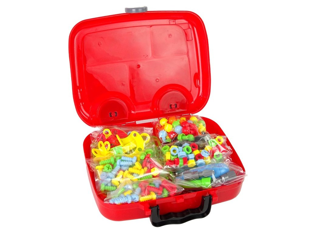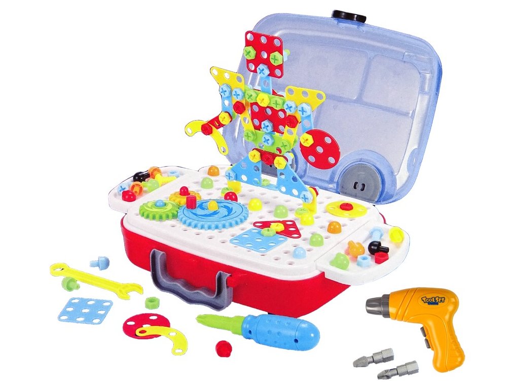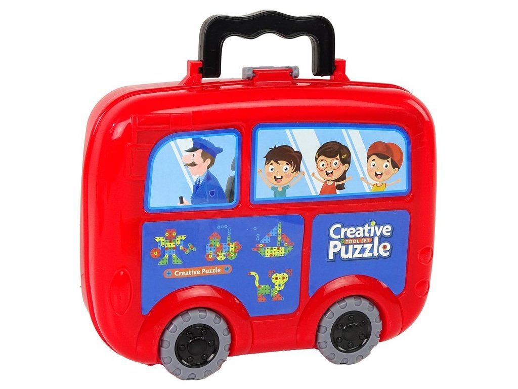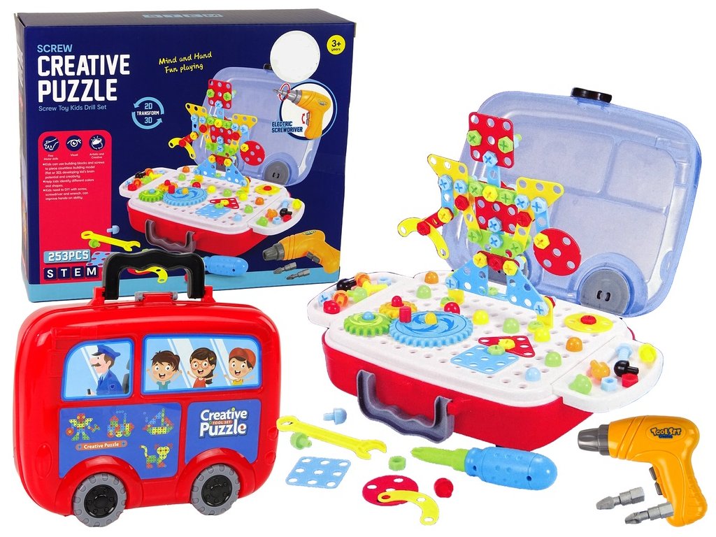 Barevná konstrukční stavebnice Puzzle Panel v praktickém kufříku ve tvaru autíčka s horním úchytem je ideální hračkou pro kluky i holčičky. Součástí je vrtačka na baterie, ruční šroubovák a francouzský klíč. Celkem je v sadě obsaženo 253 ks různých konstrukčních prvků v různých barvách, ze kterých lze šroubováním pomocí libovolně vytvářet obrazce, mozaiky, vzory a prostorové obrazce. Vše záleží jen na představivosti dítěte. Hra se stavebnicí podporuje u dětí představivost, motorické schopnosti a trpělivost. Hračka je určena pro děti od 36 měsíců věku.