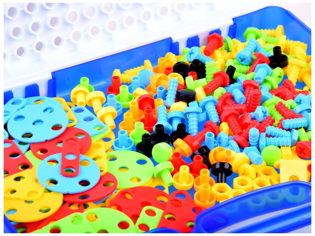 Senzační sada 237 kostek, ideální pro každého malého stavitele. Základem konstrukce je systém otvorů, ke kterým jsou přišroubovány prvky různých tvarů a barev.