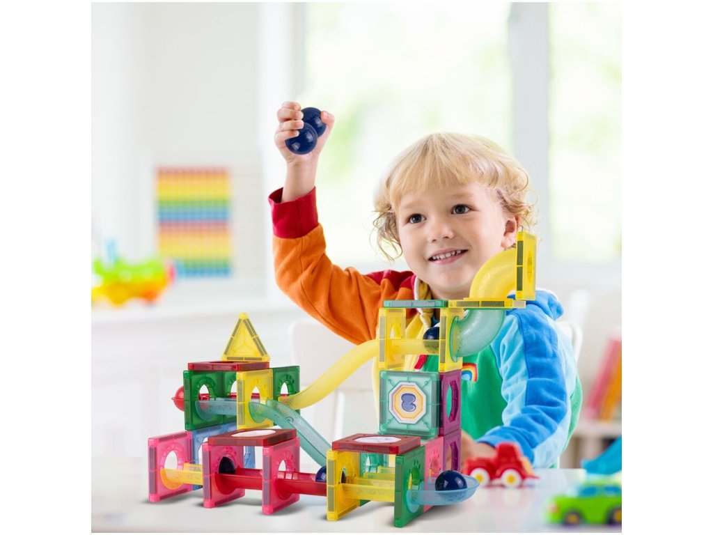 Barevná magnetická stavebnice se skluzavkou Magnet Blocks je ideální hračkou pro všechny malé konstruktéry. Skládá se z celkem 78 součástí jako jsou konstrukční elementy, části skluzavky, čtverce, trojúhleníky, obdélníky a další. Všechny součásti se velmi snadno propojují a lze z nich vytvořit velké množství plošných a 3D tvarů. Hračka je určena pro děti od 3 let věku.