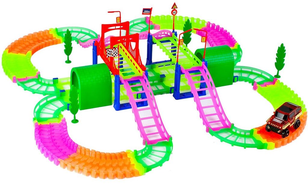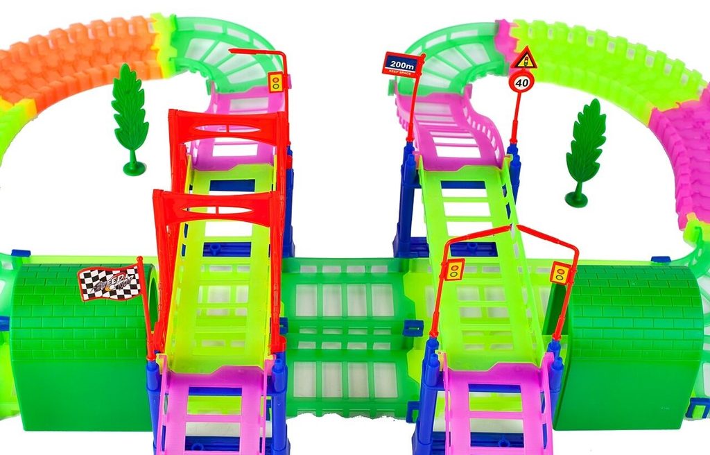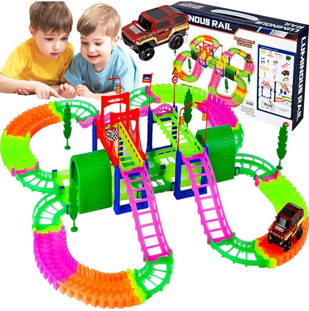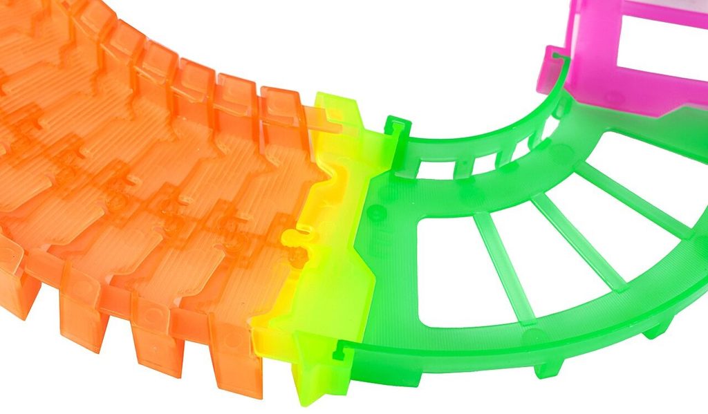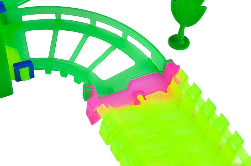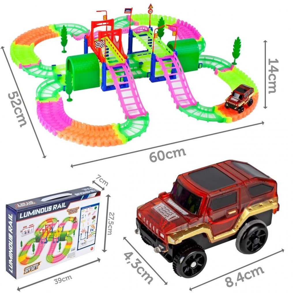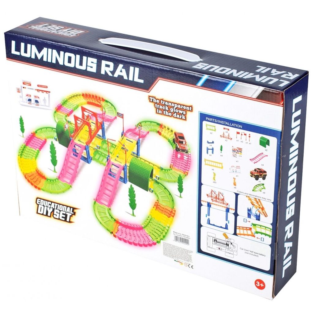 Dětská svítící autodráha Luminous Rail se 135 elementy učí dětí představivost a podporuje kreativitu. Dráha je elastická a fluorescenční lze ji tak libovolně otáček a kombinovat a tmě svítí. Součástí dráhy jsou nadjezdy, stromečky, mosty a tunely. Autíčko, které je součástí balení je napájeno baterií a má LED podsvětlení. Hračka je určena pro děti od 36 měsíců věku.
