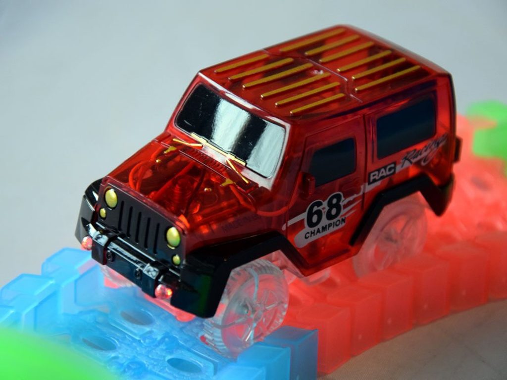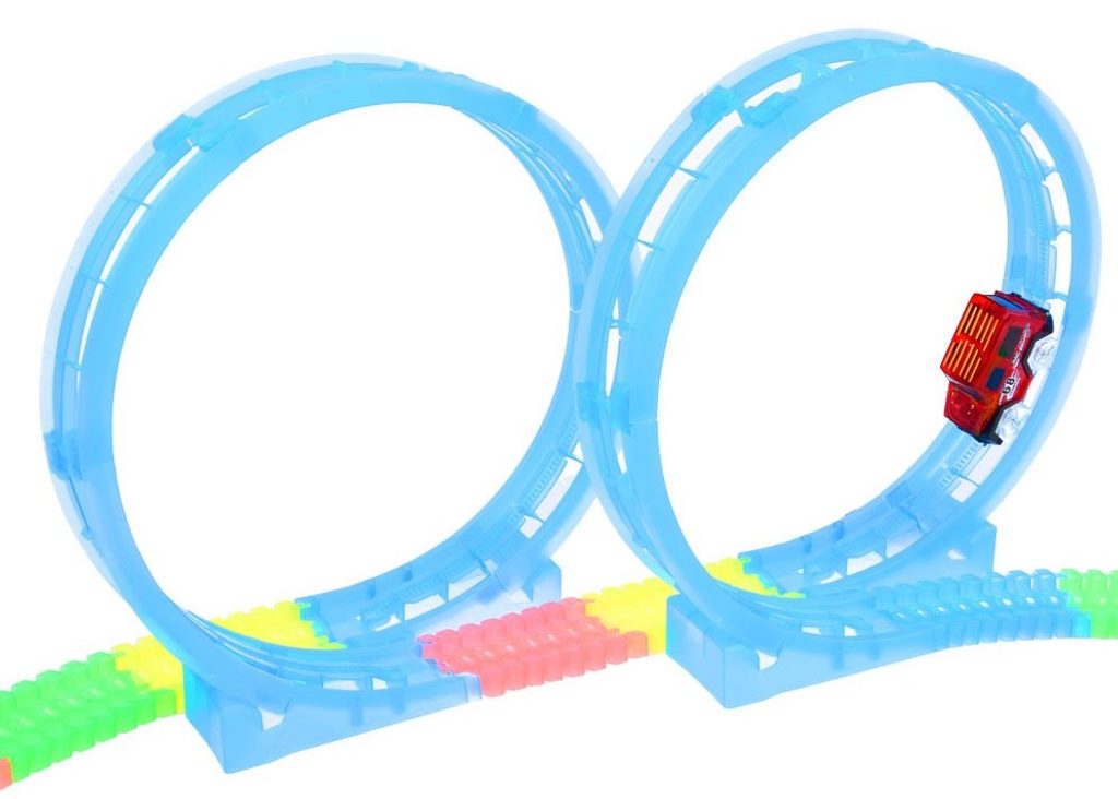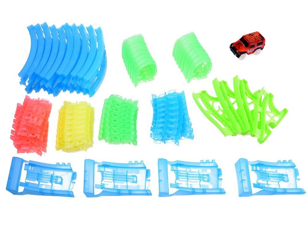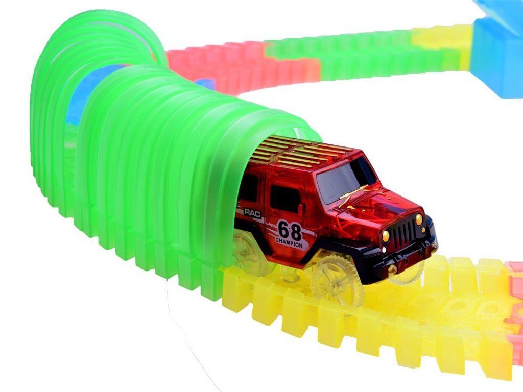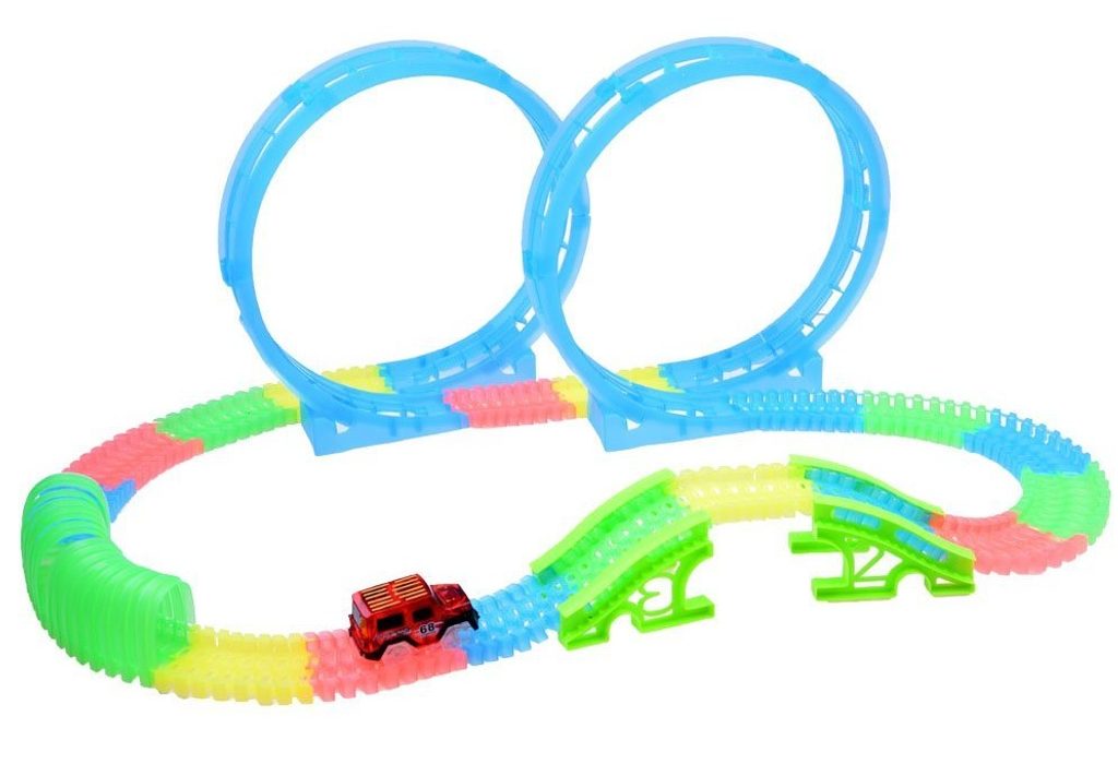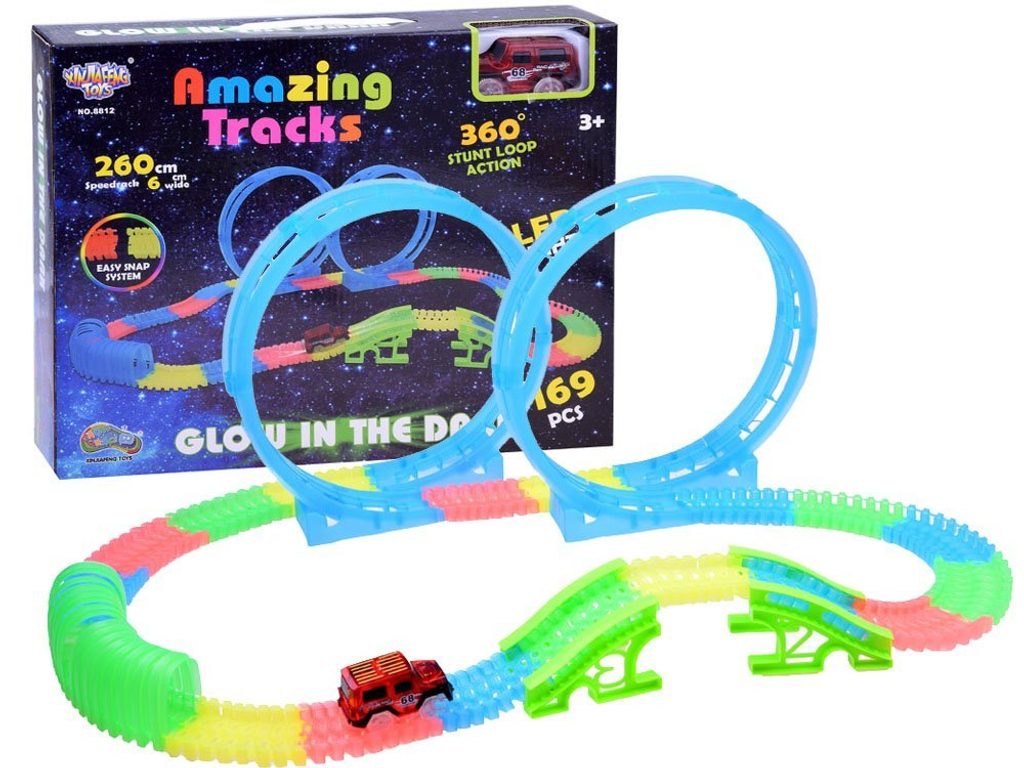 Dětská svítící autodráha Magic Tracks s 169 elementy učí dětí představivost a podporuje kreativitu. Dráha má celkovou délku 260 cm a šířku 4,5 cm. Je elastická a fluorescenční lze ji tak libovolně otáček a kombinovat a tmě svítí. Součástí dráhy jsou otočné smyčky, nadjezd a tunel. Autíčko, které je součástí balení je napájeno bateriemi a má LED podsvětlení. Hračka je určena pro děti od 36 měsíců věku.