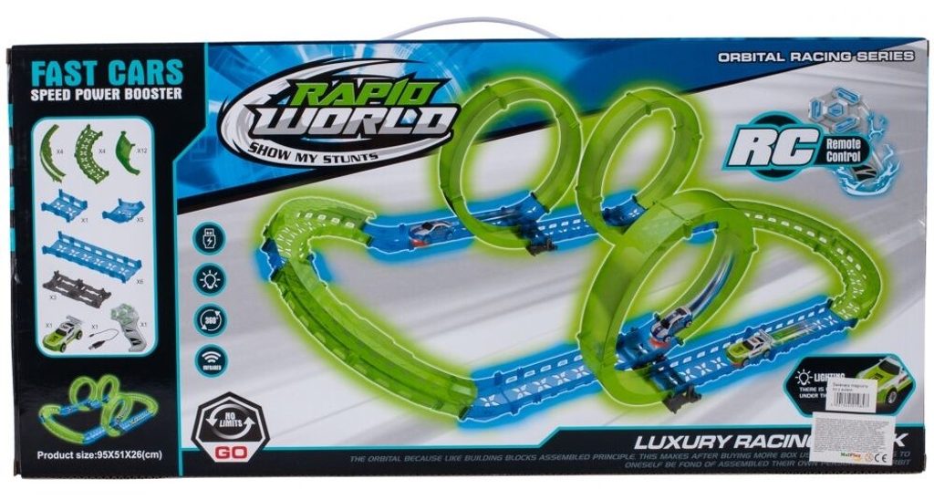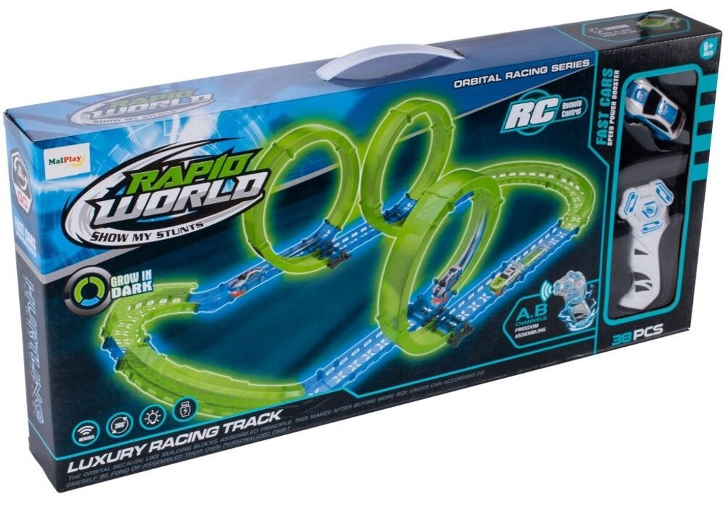 Dětská svítící autodráha Rapid World učí dětí představivost a podporuje kreativitu. Dráha je fluorescenční a ve tmě svítí. Součástí dráhy jsou tři otočné smyčky. Autíčko, které je součástí balení je napájeno přes USB, má LED podsvětlení a je ovládáno pomocí dálkového ovladače. Hračka je určena pro děti od 36 měsíců věku.