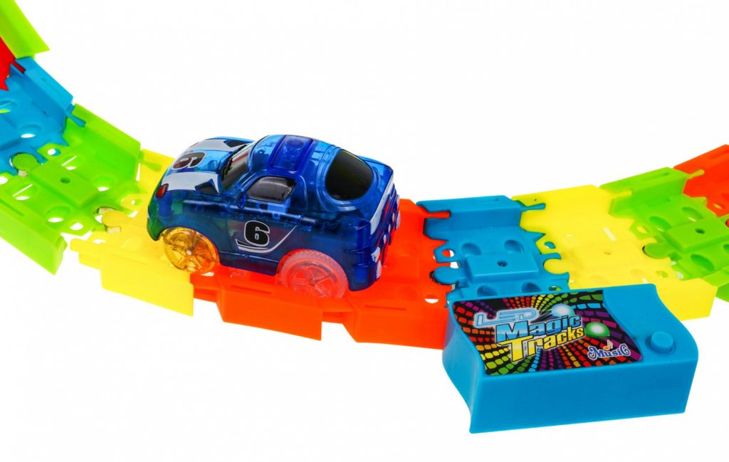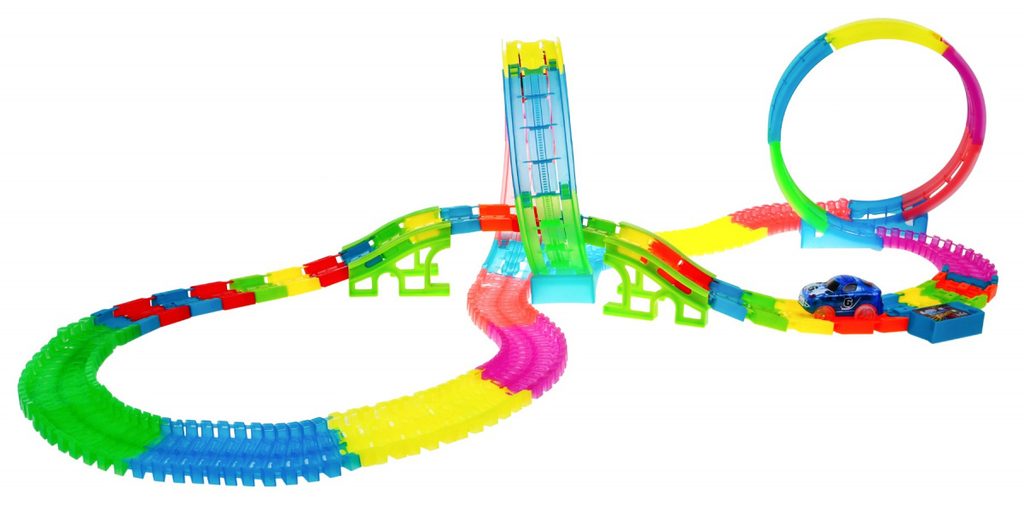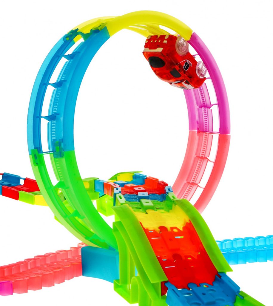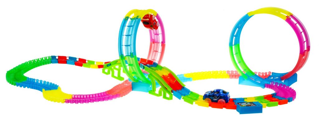 Dětská svítící autodráha Twister Tracks se 166 elementy učí dětí představivost a podporuje kreativitu. Dráha je elastická a fluorescenční lze ji tak libovolně otáček a kombinovat a tmě svítí. Součástí dráhy jsou otočné smyčky, nadjezd a tunel. Hra je doprovázena zvukovými efekty. Autíčka, které jsou součástí balení jsou napájeny bateriemi a mají LED podsvětlení. Hračka je určena pro děti od 36 měsíců věku.