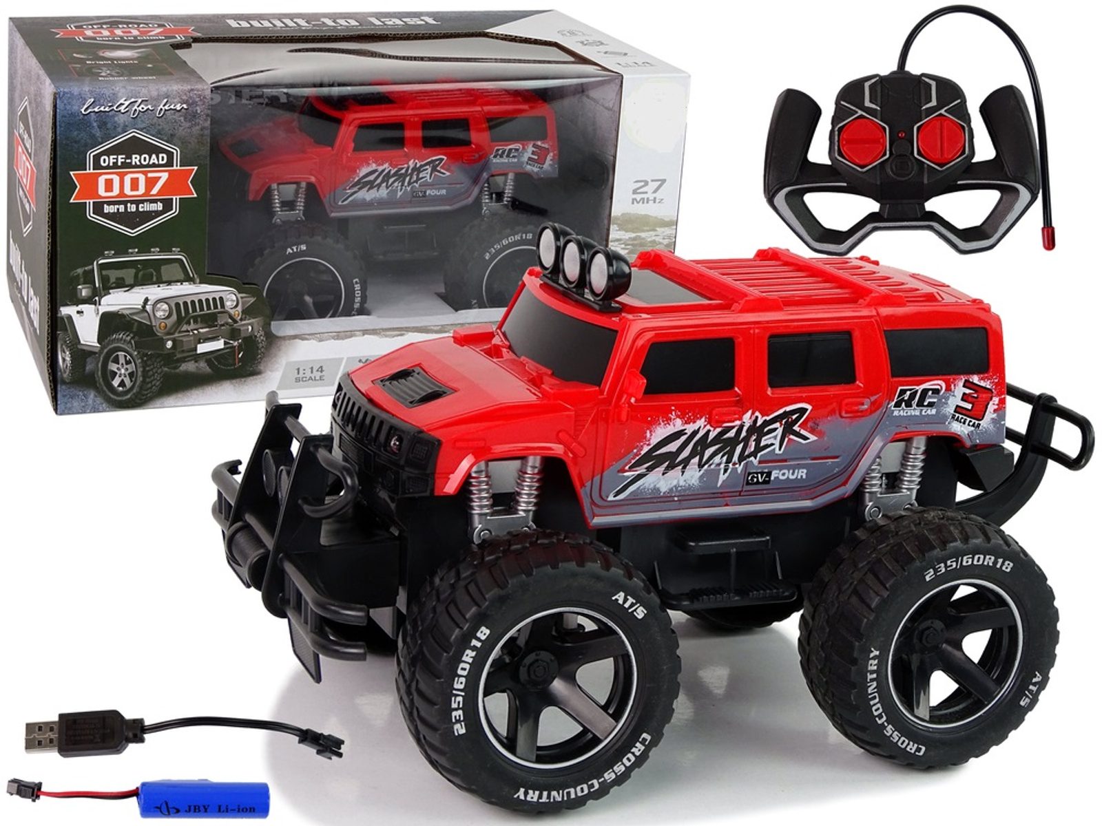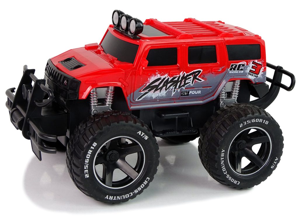 Terénní autíčko Slasher na dálkové ovládání s dálkovým ovladáním 27 MHz umožnuje jízdu dopředu a dozadu, zatáčí do všech směrů. Je osazeno velkými gumovými koly s velmi dobrou přilnavostí a je vybaveno tlumiči nárazů. Součástí balení je 3,7V akumulátor napájení autíčka, nabíječka a dálkový ovladač. Dálkové ovládání je napájeno bateriemi, které nejsou součástí balení. Autíčko je vyrobeno z odolného plastu a má certifikaci CE.