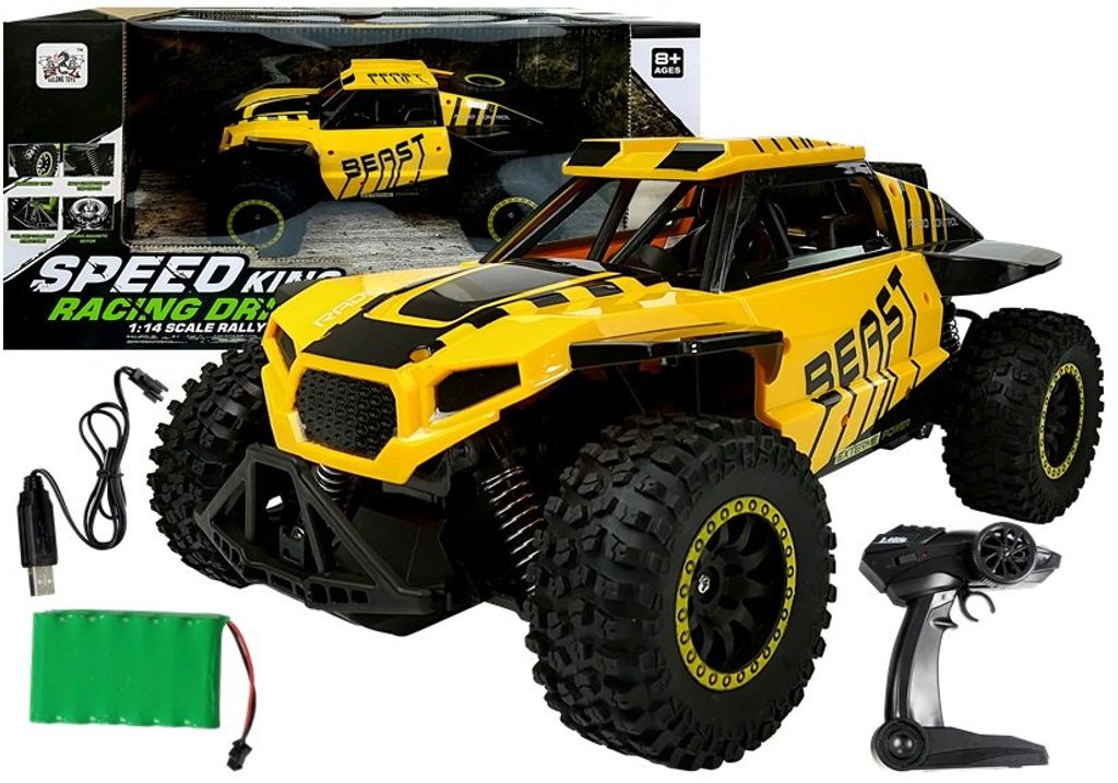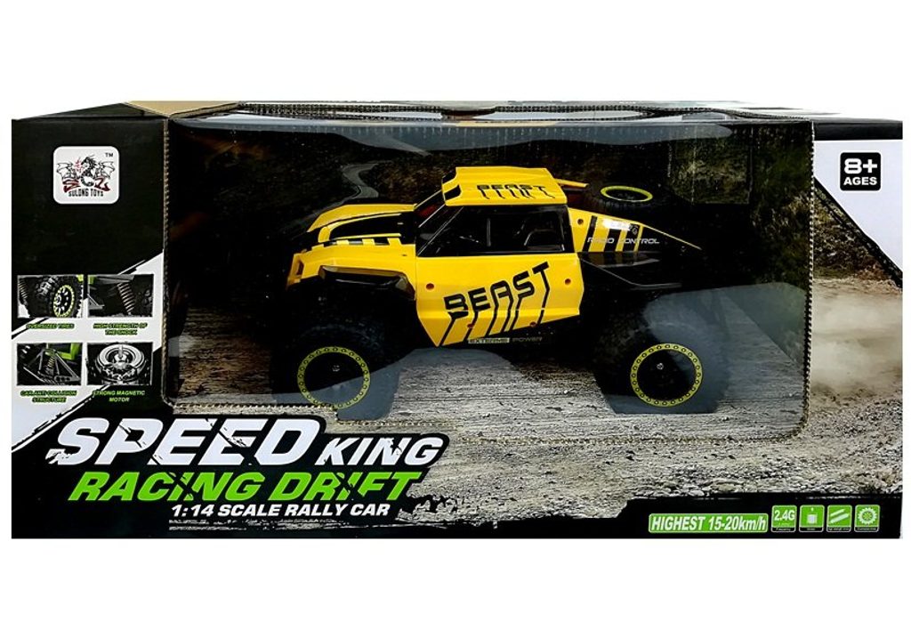 Terénní autíčko Speed King na dálkové ovládání s dálkovým ovladáním 2,4G umožnuje jízdu dopředu a dozadu, zatáčí do všech směrů. Je osazeno širokými gumovými koly s velmi dobrou přilnavostí a je vybaveno silnými tlumiči nárazů. Součástí balení je baterie napájení autíčka, nabíječka a dálkový ovladač. Dálkové ovládání je napájeno bateriemi, které nejsou součástí balení. Autíčko je vyrobeno z odolného plastu a má certifikaci CE.