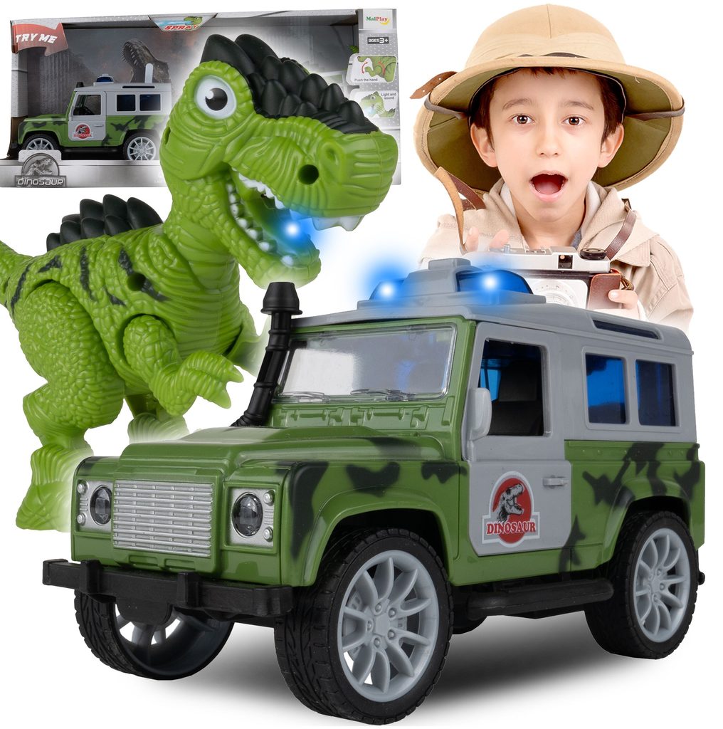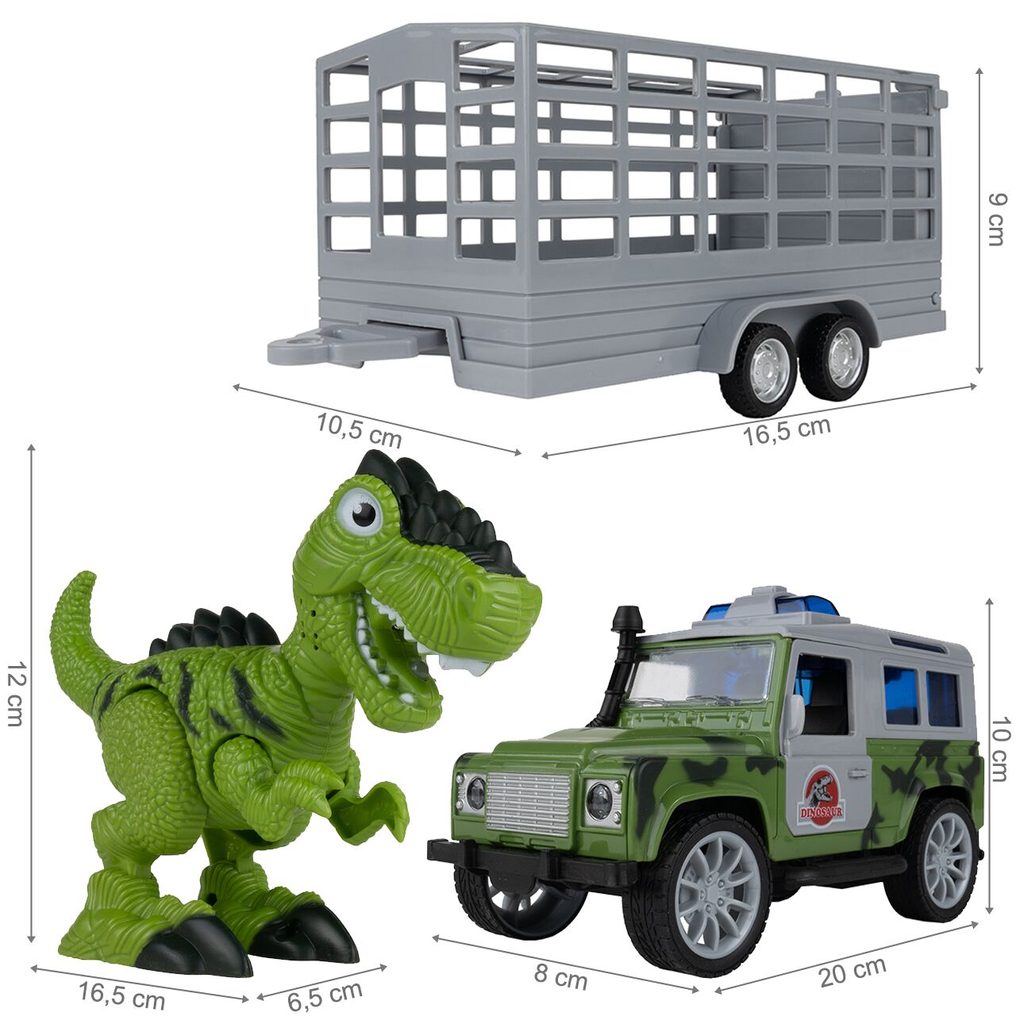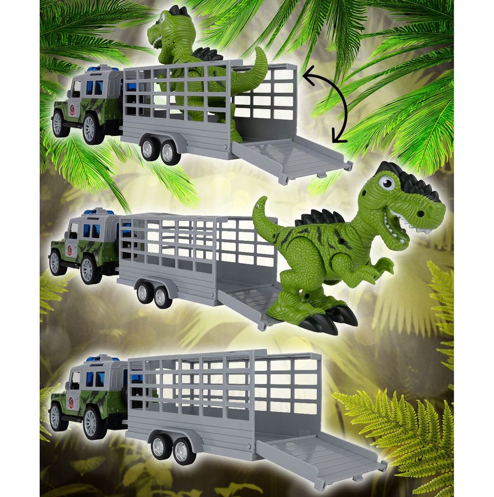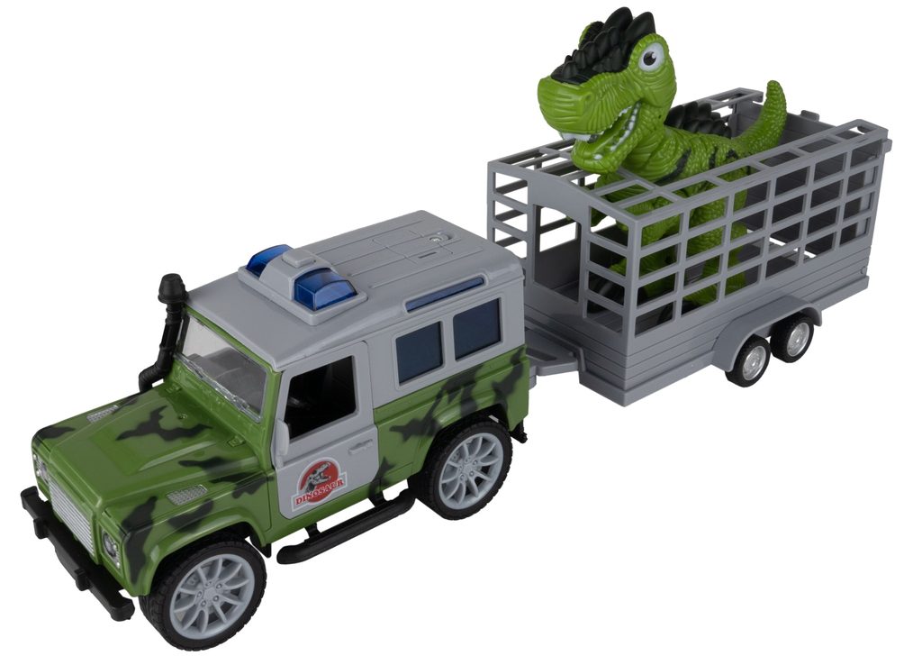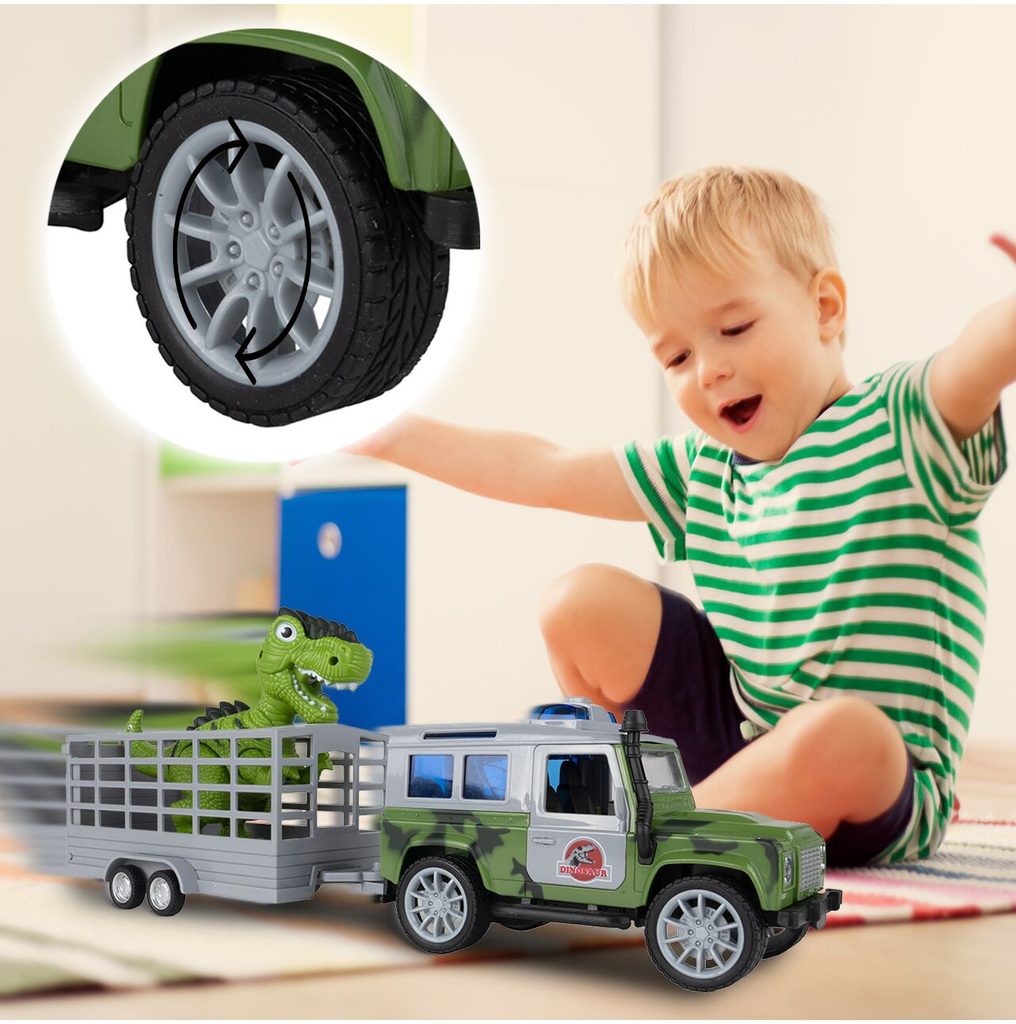 Terénní auto na setrvačník Dino Car je ideální hračkou pro rozvoj manuální zručnosti a logického myšlení. Součástí sady je autíčko, přívěs, dinosaurus a lahvička na vodu. Autíčko je vybaveno tlačítky, které spouští zvuky startování,, motoru a klaksonu. Na střeše je umístěný svítící maják. Pohon zajišťuje setrvačník na předních kolech. Zadní část přívěsu je sklopná. Dinosaurus vydává zvuky a po nalití vody chrlí páru. Hračka je určena pro děti od 36 měsíců věku.