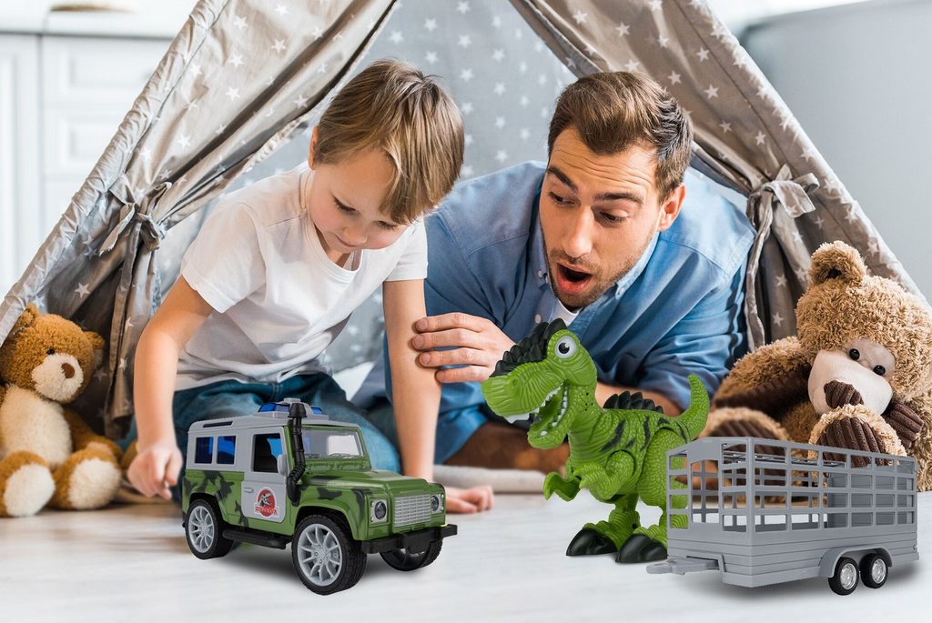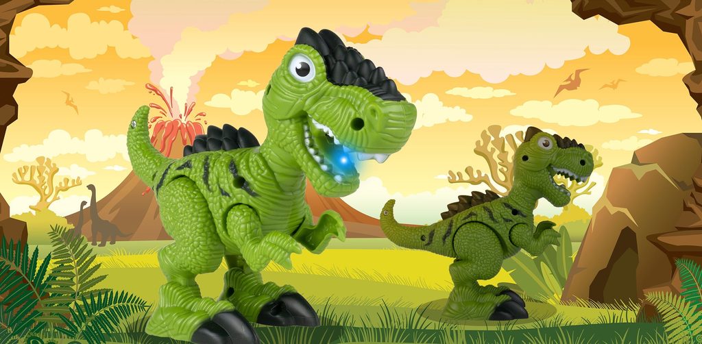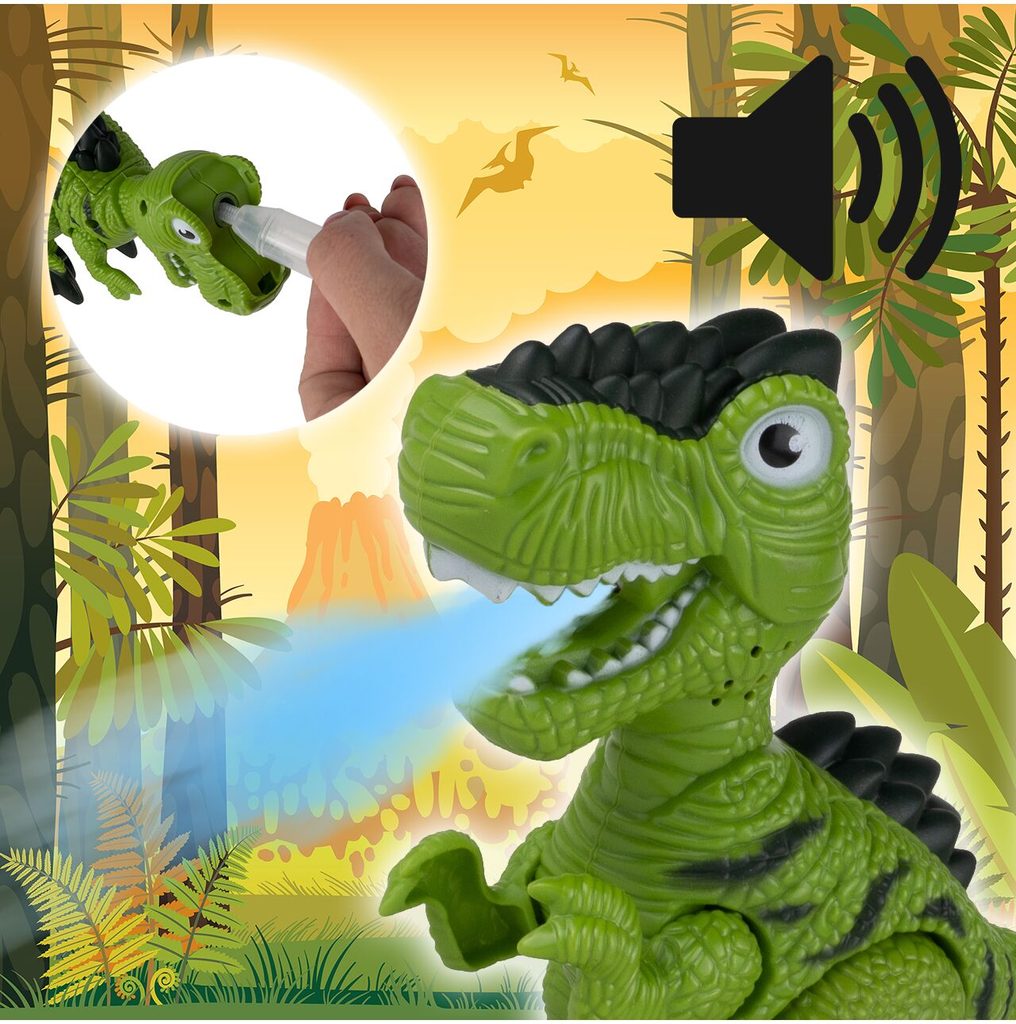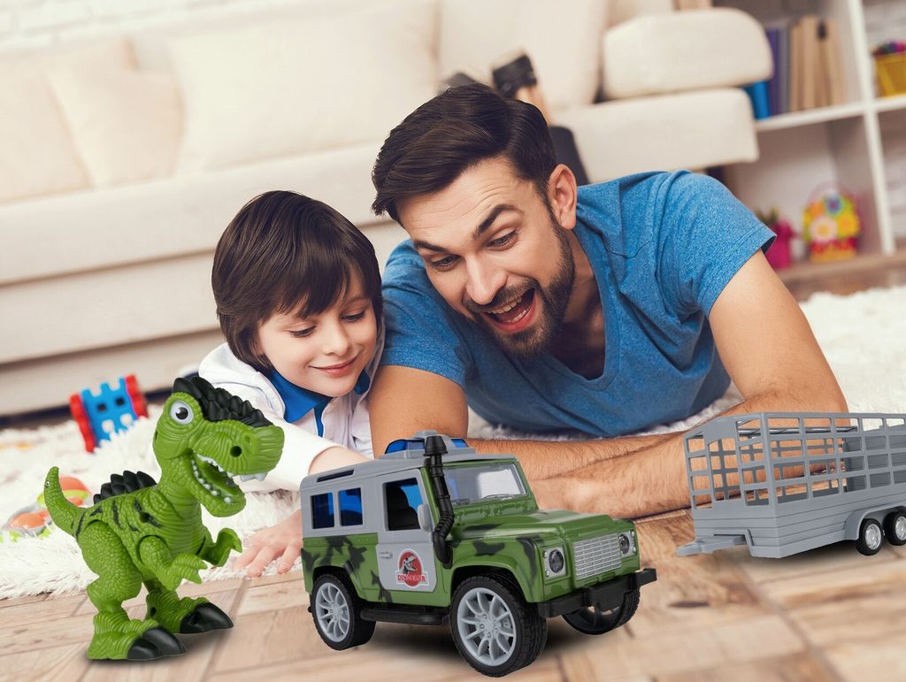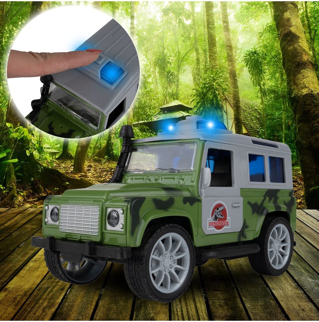 Terénní auto na setrvačník Dino Car je ideální hračkou pro rozvoj manuální zručnosti a logického myšlení. Součástí sady je autíčko, přívěs, dinosaurus a lahvička na vodu. Autíčko je vybaveno tlačítky, které spouští zvuky startování,, motoru a klaksonu. Na střeše je umístěný svítící maják. Pohon zajišťuje setrvačník na předních kolech. Zadní část přívěsu je sklopná. Dinosaurus vydává zvuky a po nalití vody chrlí páru. Hračka je určena pro děti od 36 měsíců věku.