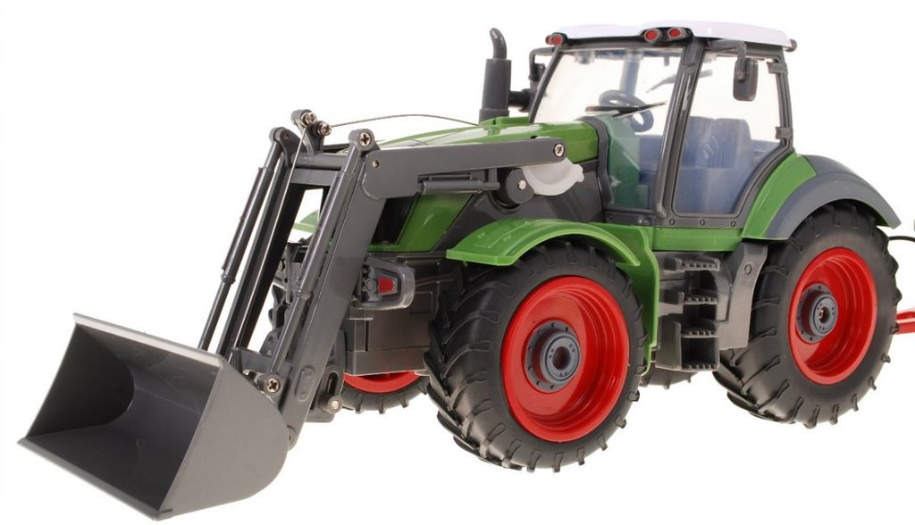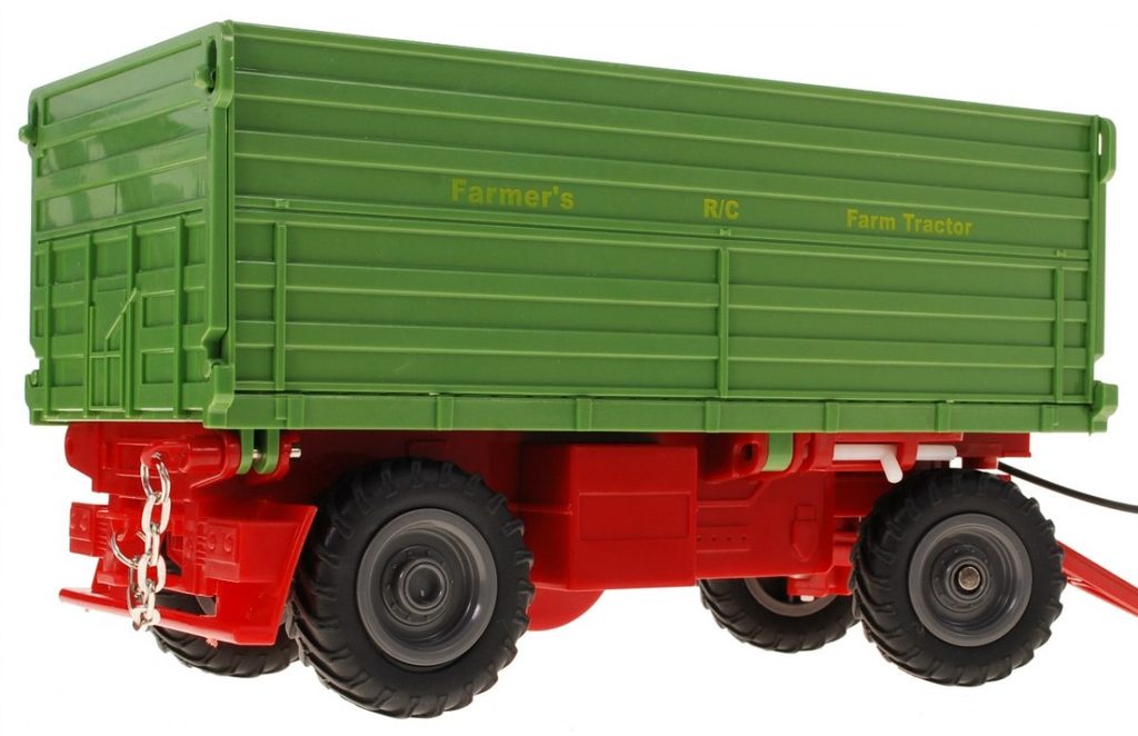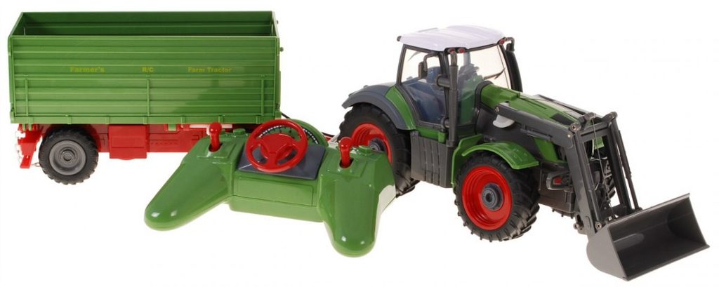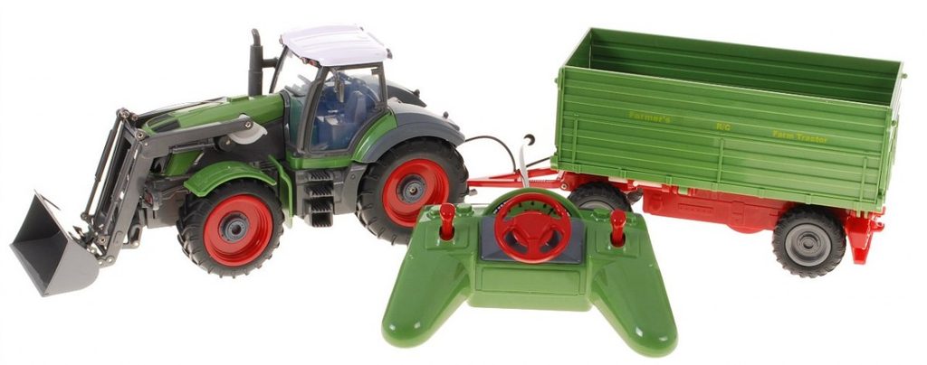 Traktor s návěsem Farmer s dálkovým ovládáním 2,4G umožnuje jízdu dopředu a dozadu, má otáčecí kola doprava a doleva a připojený přívěs, který lze sklápět. V přední části je umístěna lžíce, kterou lze zvedat nahoru a dolů. Je osazený gumovými koly. Ovládání je velmi jednoduché pomocí ovladače s kolečkem ve tvaru volantu a 2 páčkami. Dálkové ovládání i traktor jsou napájeny bateriemi, které nejsou součástí balení. Traktor je vyroben z plastu a má certifikaci CE.