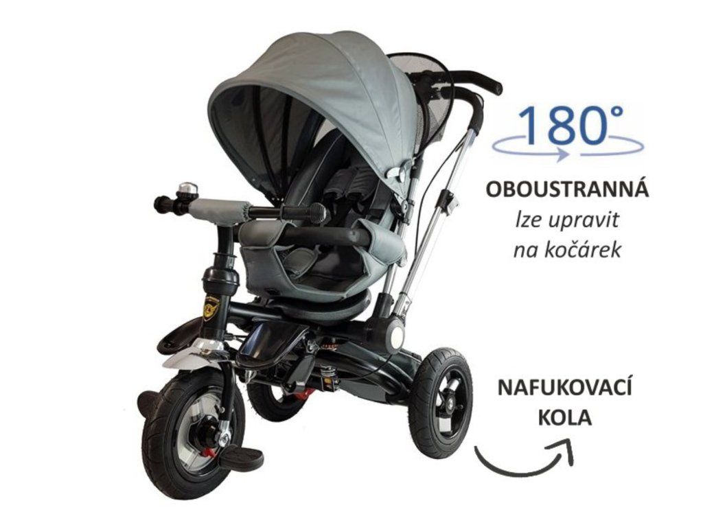 Dětská oboustranná tříkolka Majlo Toys PRO700 s nafukovacími koly. Primárně určena pro děti od 3 do 5 let, ale využití najde i pro menší děti. Vybavena praktickou stříškou proti slunci. V zadní části je umístěn velký koš na hračky, v přední části potom menší košík. Tříkolka má pevnou ocelovou konstrukci a robustní nafukovací kola. Čalouněné madlo zabraňuje vypadnutí dítěte z kočárku. Na řídítkách je zvoneček. Pomocí vodící tyče mohou tříkolku řídit i rodiče a využít ji i jako kočárek podle toho na kterou stranu vodící tyč otočí. Nebo můžete tříkolku zcela odstrojit. Pro menší děti slouží stupátka. Velkou výhodou je také otočné sedátko.