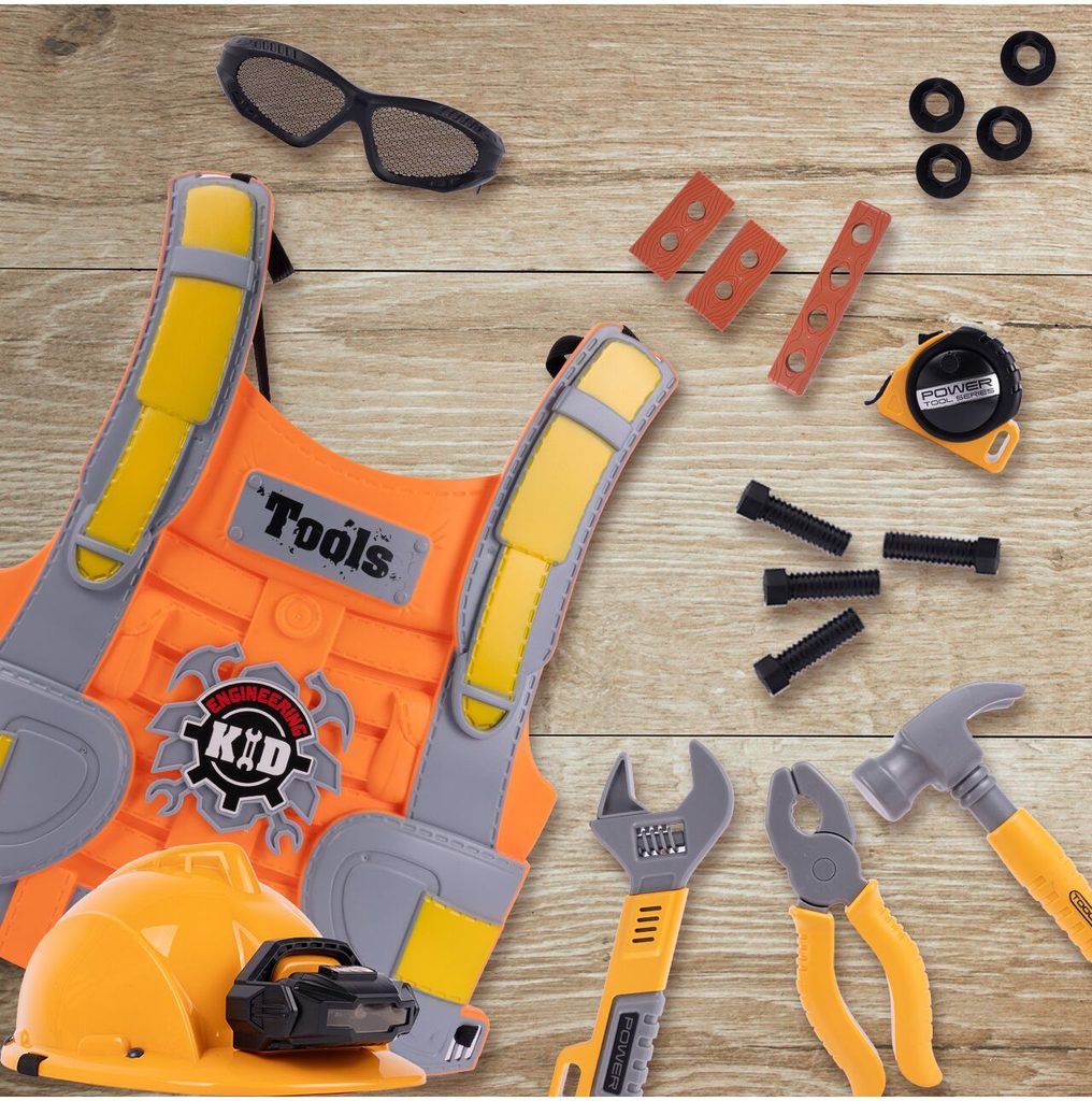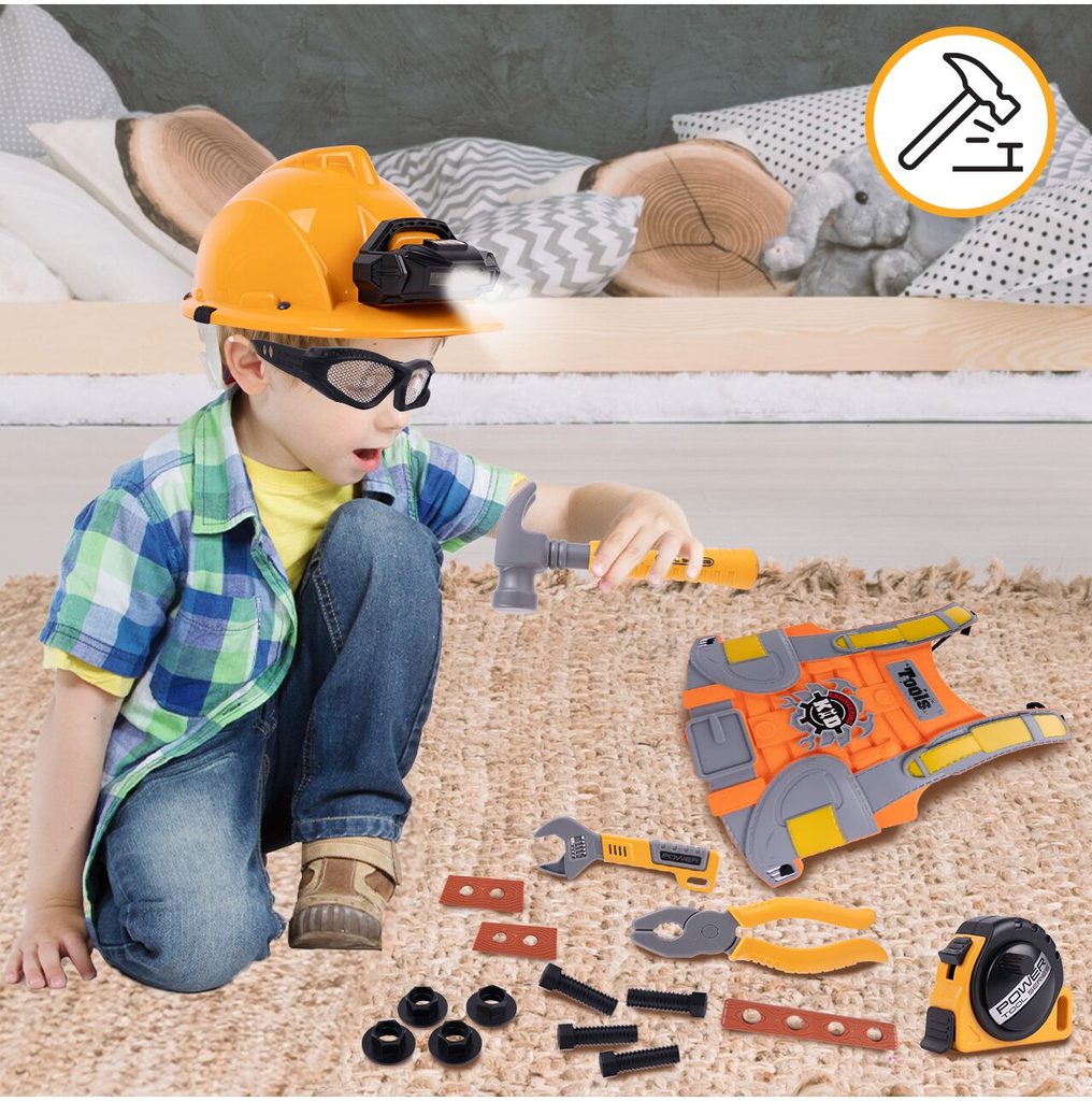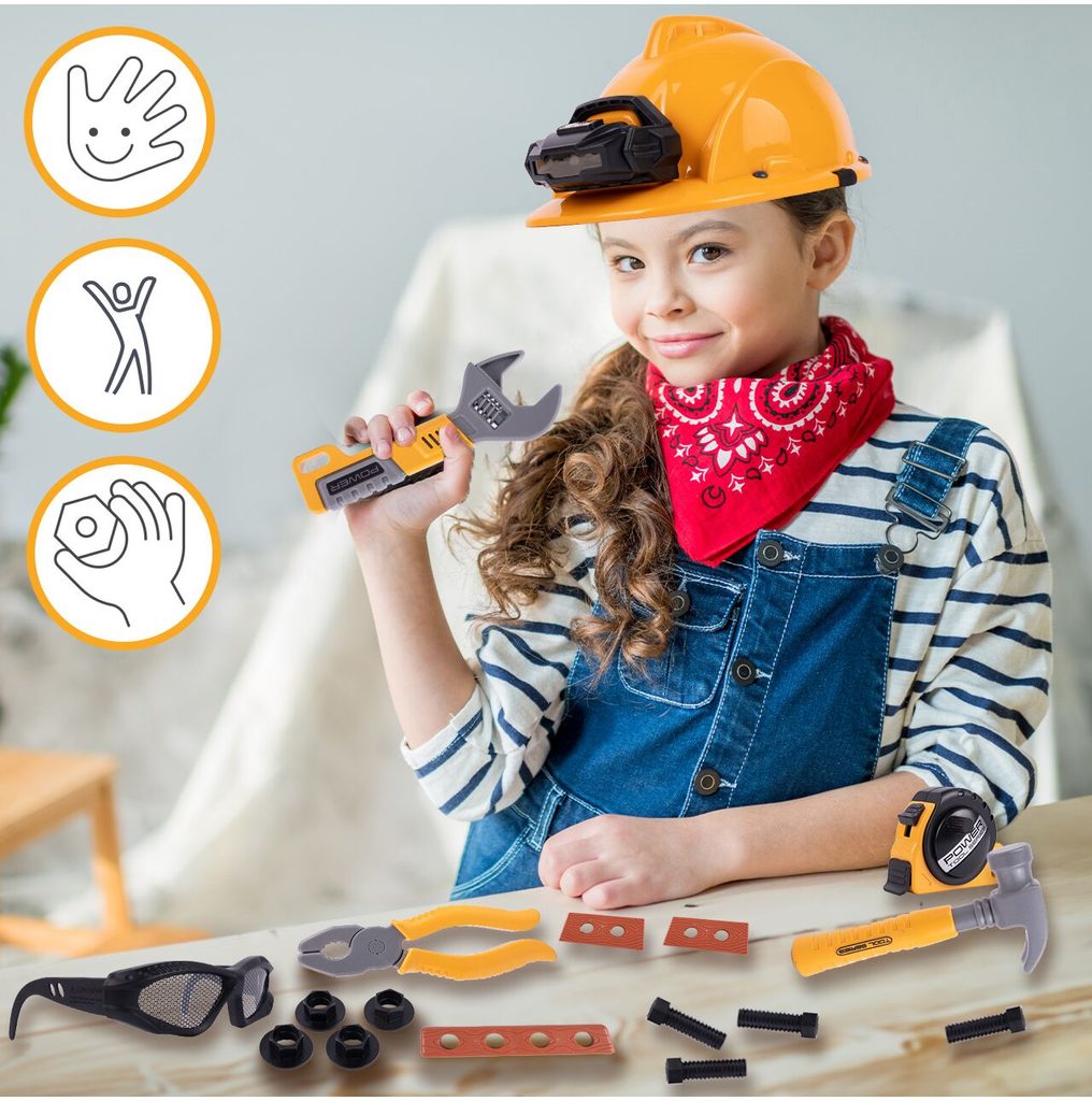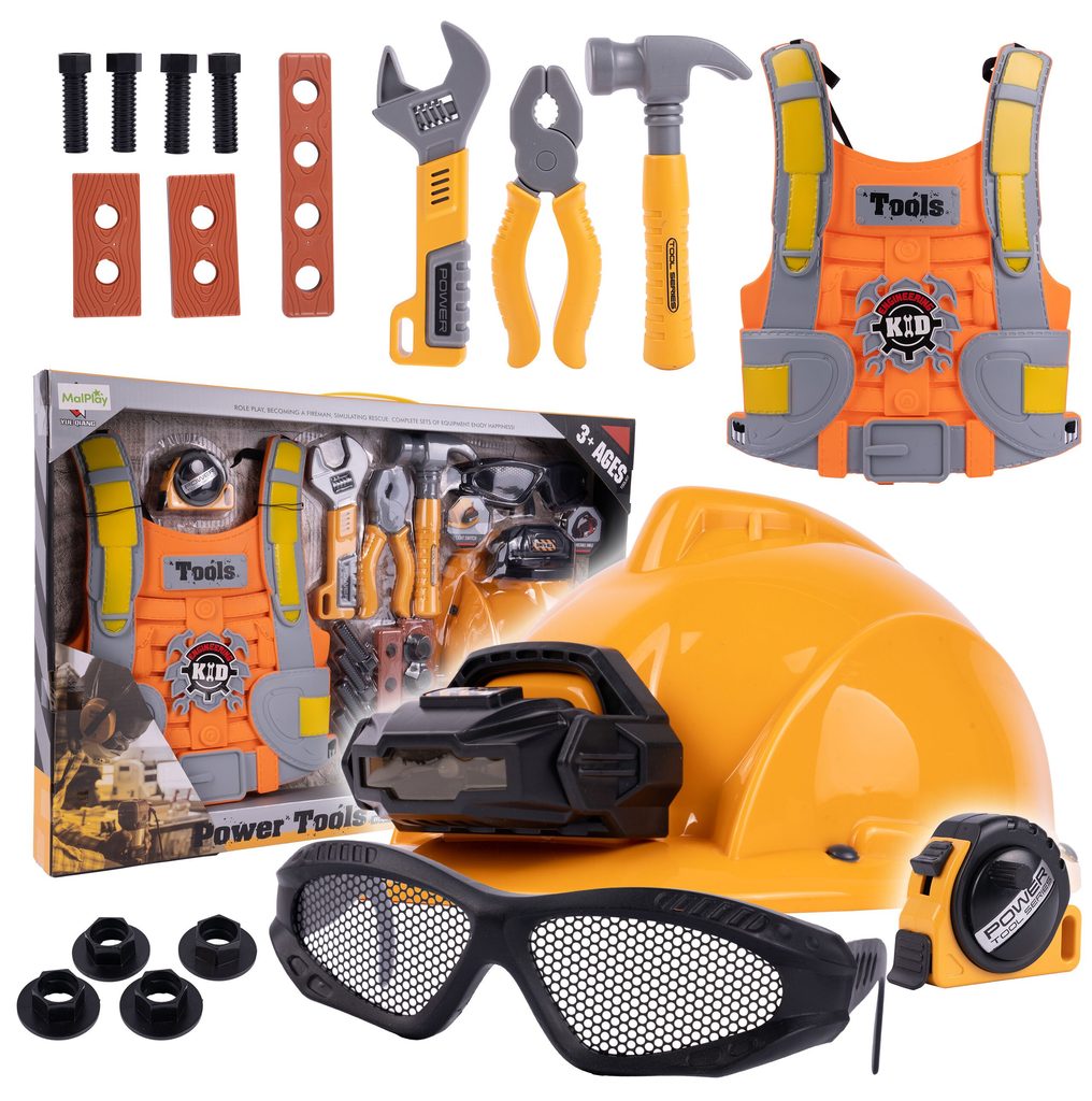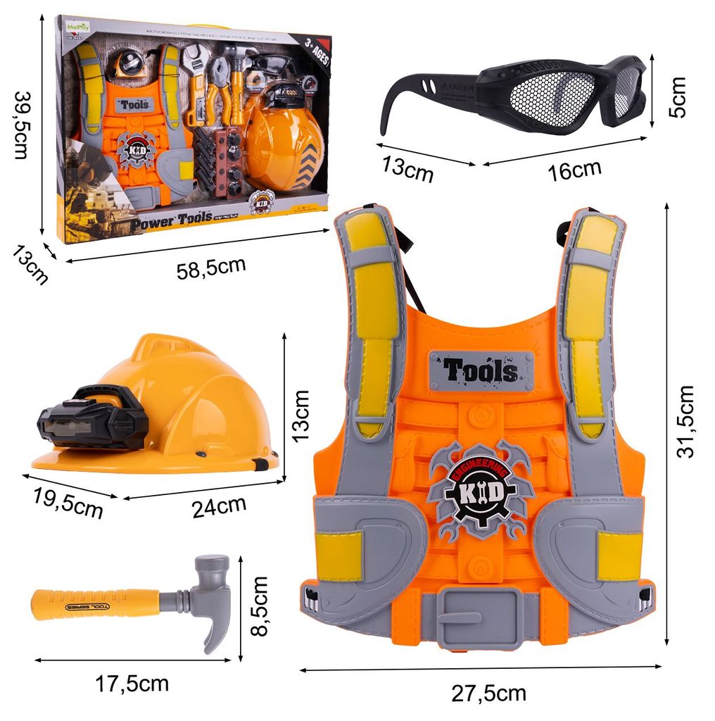 Velká sada plastového nářadí s helmou na baterie, vestou a ochrannými brýlemi je ideální hračkou pro všechny malé kutily. Sada obsahuje mnoho součástí včetně kladívka, francouzského klíče, šroubků, kleští, konstrukčních prvků a dalšího nářadí. V sadě je také helma na baterie, které po zapnutí svítí. Hračka je určena pro děti od 36 měsíců věku.