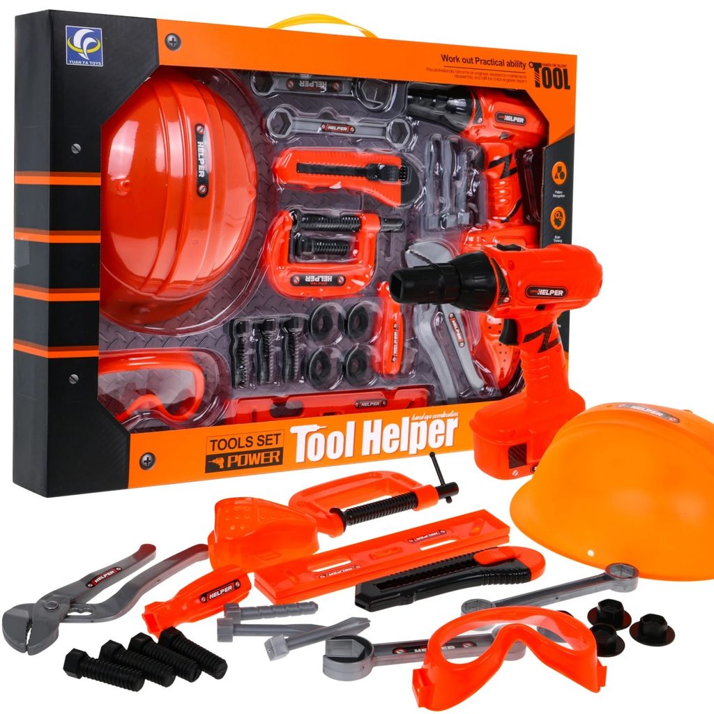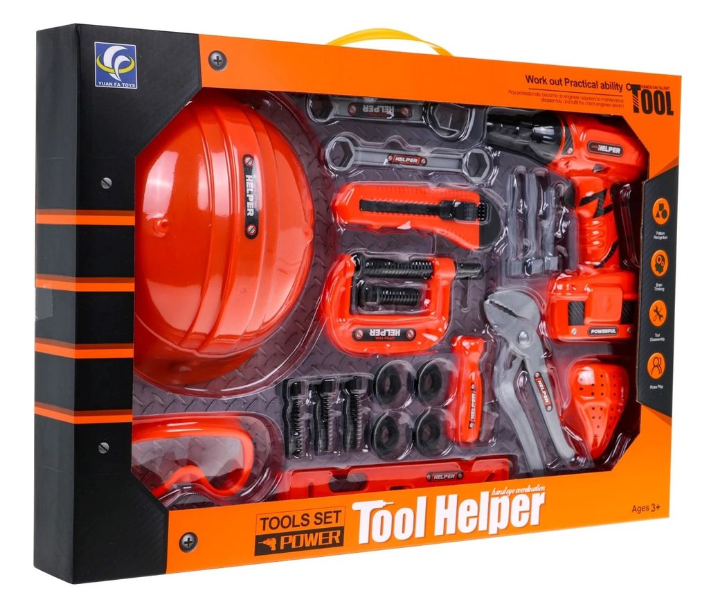 Velká sada plastového nářadí s helmou, vrtačkou a ochrannými brýlemi Tool Helper je ideální hračkou pro všechny malé kutily. Sada obsahuje mnoho součástí včetně 2 francouzských klíčů, šroubků, kleští, ochranných brýlí, matic a dalšího nářadí. V sadě je také vrtačka na baterie, které po zapnutí vydává charakteristický zvuk. Hračka je určena pro děti od 36 měsíců věku.