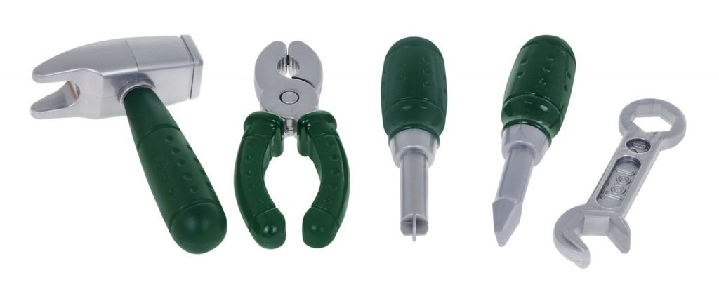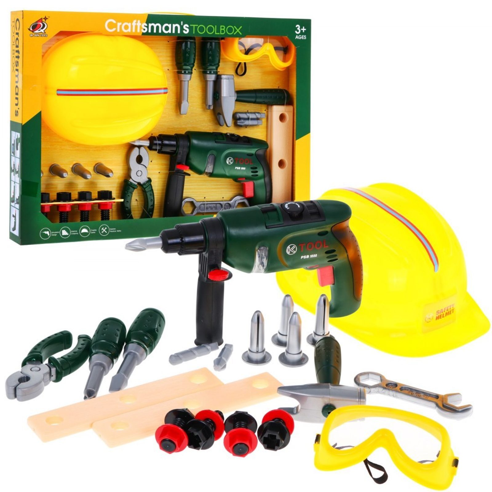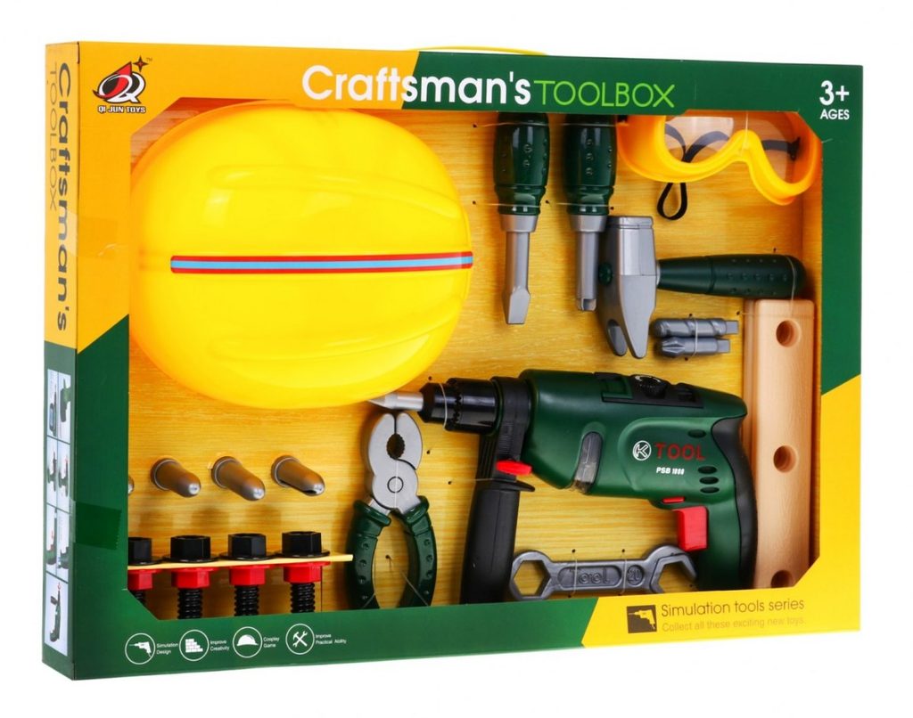 Velká sada plastového nářadí s helmou, vrtačkou a ochrannými brýlemi Toolbox je ideální hračkou pro všechny malé kutily. Sada obsahuje mnoho součástí včetně kladívka, francouzského klíče, kleští, konstrukčních prvků, šroubů, matic a dalšího nářadí. V sadě je také vrtačka na baterie, které po zapnutí vydává charakteristický zvuk. Hračka je určena pro děti od 36 měsíců věku.
