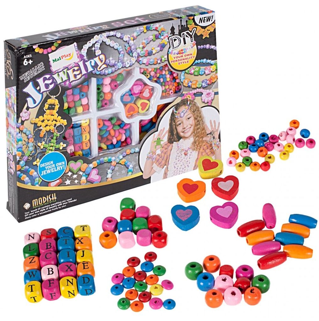 Velká sada korálků DIY Jewelry pro výrobu dřevěných šperků a bižuterie. Sada obsahuje mnoho druhů korálků v různých tvarech a barevných provedeních a šňůrky na navlékaní. Zabavte sebe i své dítě touto velkou kreativní sadou korálků a výsledkem se můžete pochlubit všem okolo. Vše je uloženo v barevné krabici s průhlednými otvory a přihrádkami. Hračka je vyrobená v pestrobarevném provedení a určena pro děti od 5 let.