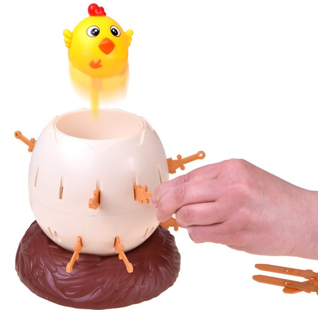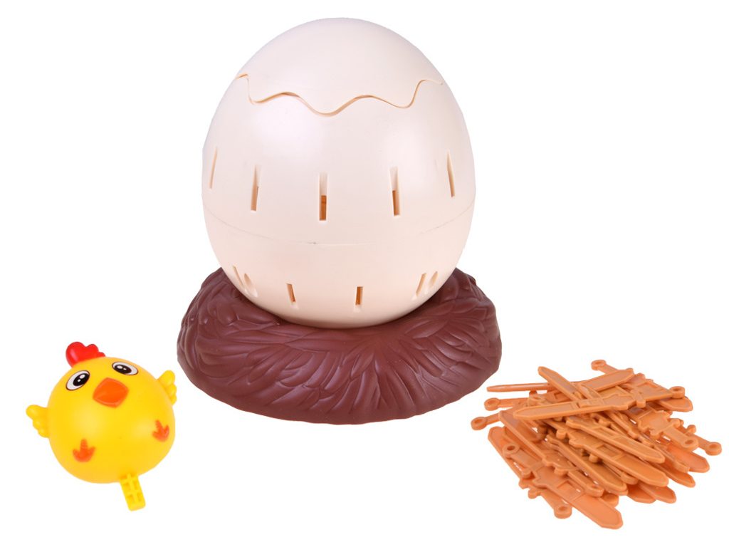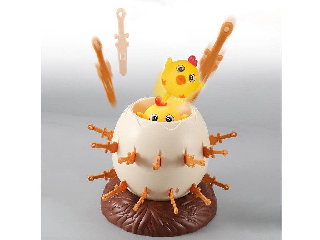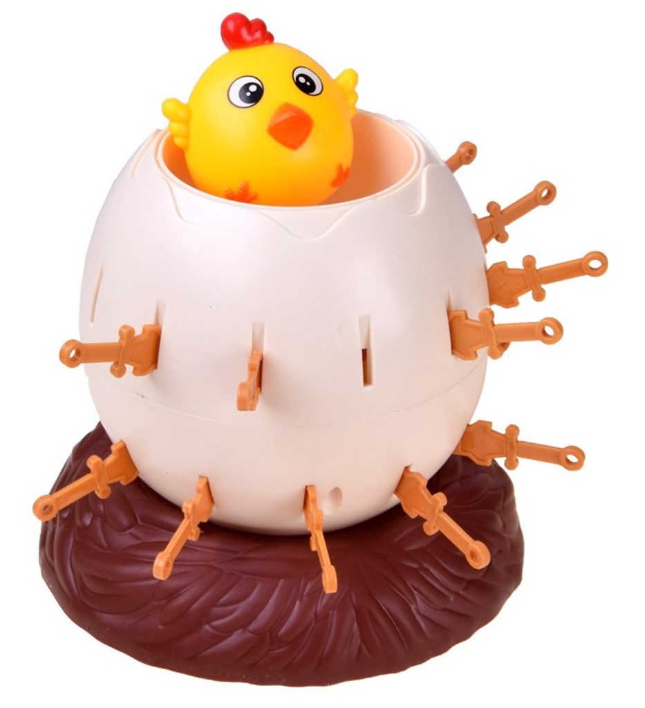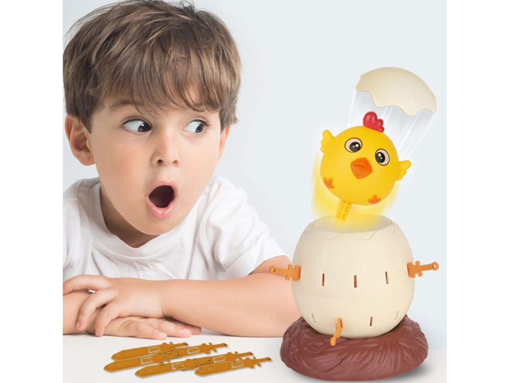 Veselá dětská hra Skákající kuře je určena pro děti a klidně i pro dospělé. Sada obsahuje vejce se skořápkou a otvory, kuře, podstavec ve tvaru hnízda a "meče". Tato hra rozvíjí manuální zručnost a procvičuje trpělivost a koncentraci. Princip je v postupném vkládání mečů dovnitř vejce a to tak aby kuře nevyskočilo. Pokud hráč vloží meč nepřesně, kuře vyskočí ven a hráč ztrácí tah. Hračka je vyrobená z plastu a určena pro děti od 5 let.