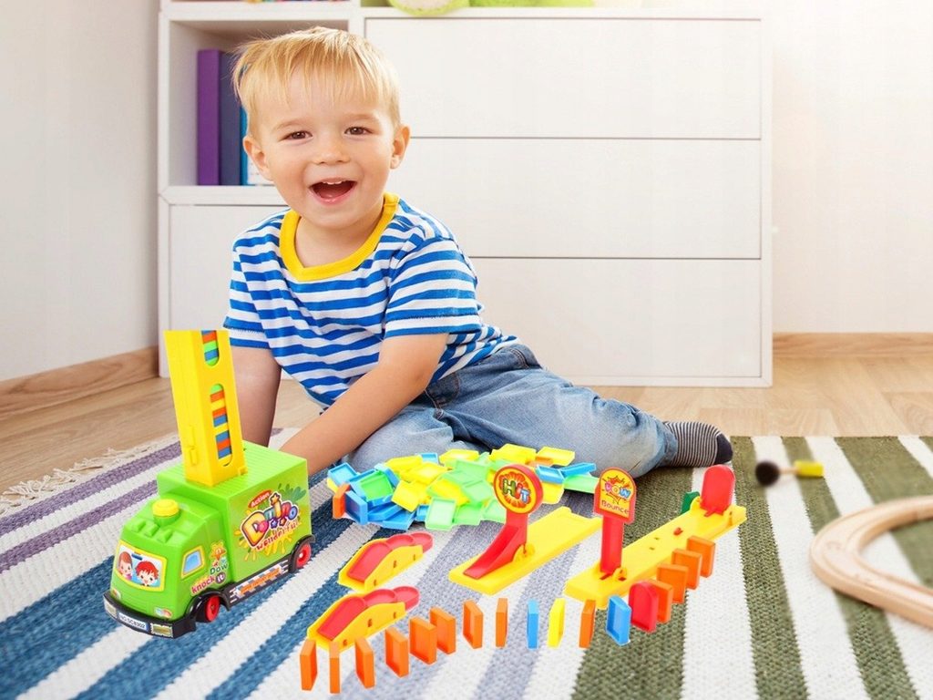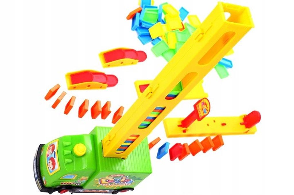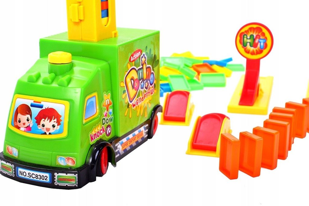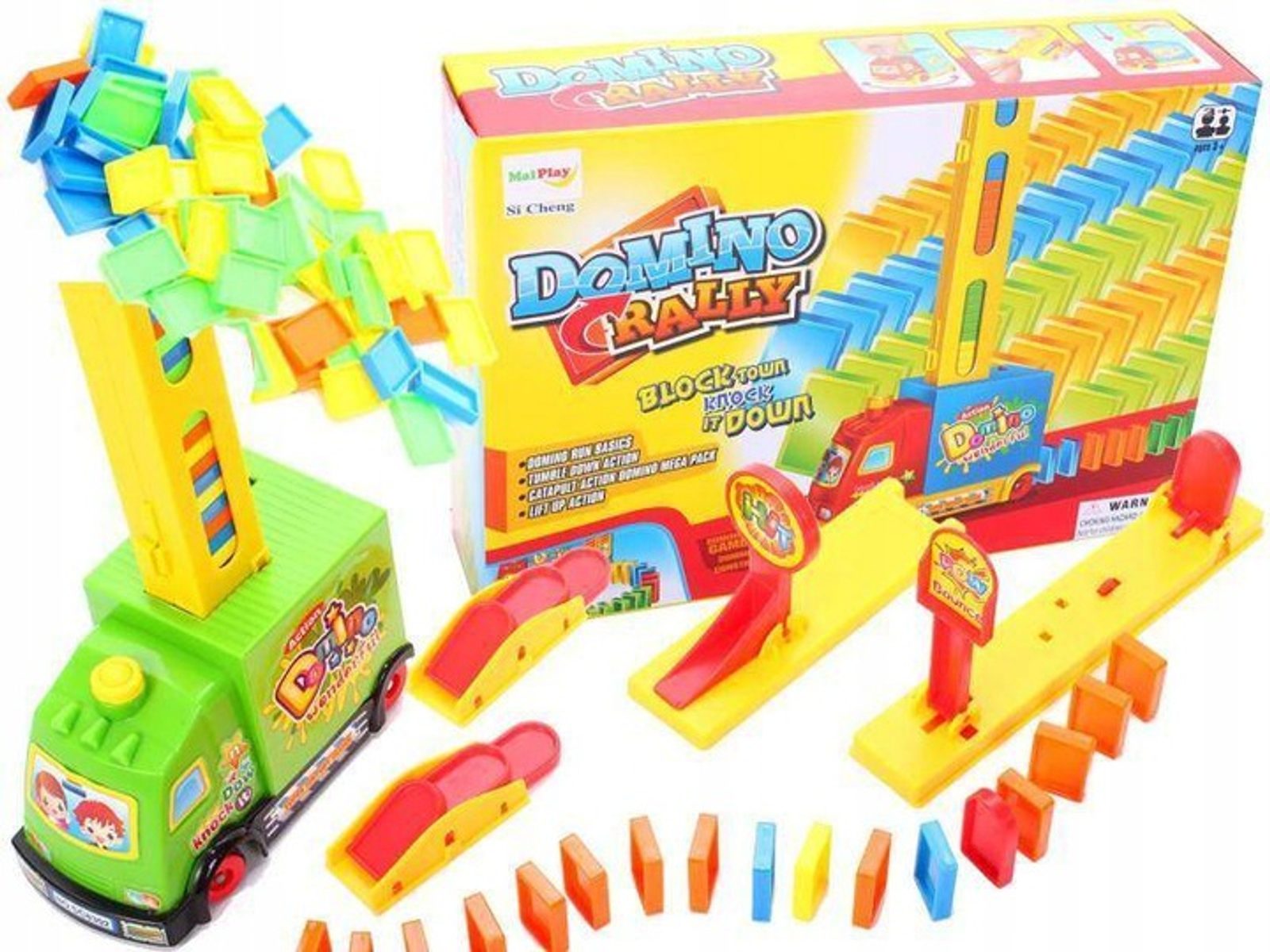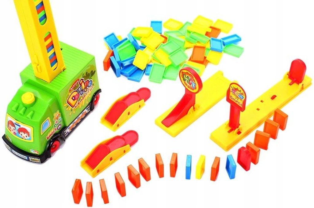 Veselé domino s autíčkem na baterie Funny Car zabaví nejen děti ale určitě i rodiče. Zásobník na kostky ve tvaru komínu se naplní kostkami a nasadí na střechu autíčka. Po zapnutí se autíčko rozjede a z její zadní části se za jízdy postupně vyskladňují kostičky jako v klasickém dominu. Kostičky lze stavět i ručně. Lze vytvořit dráhu o délce až metry. Hračka je určena pro děti od 3 let věku.