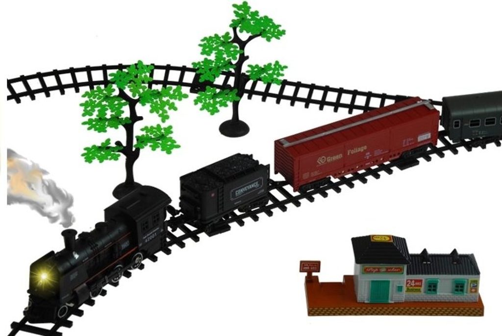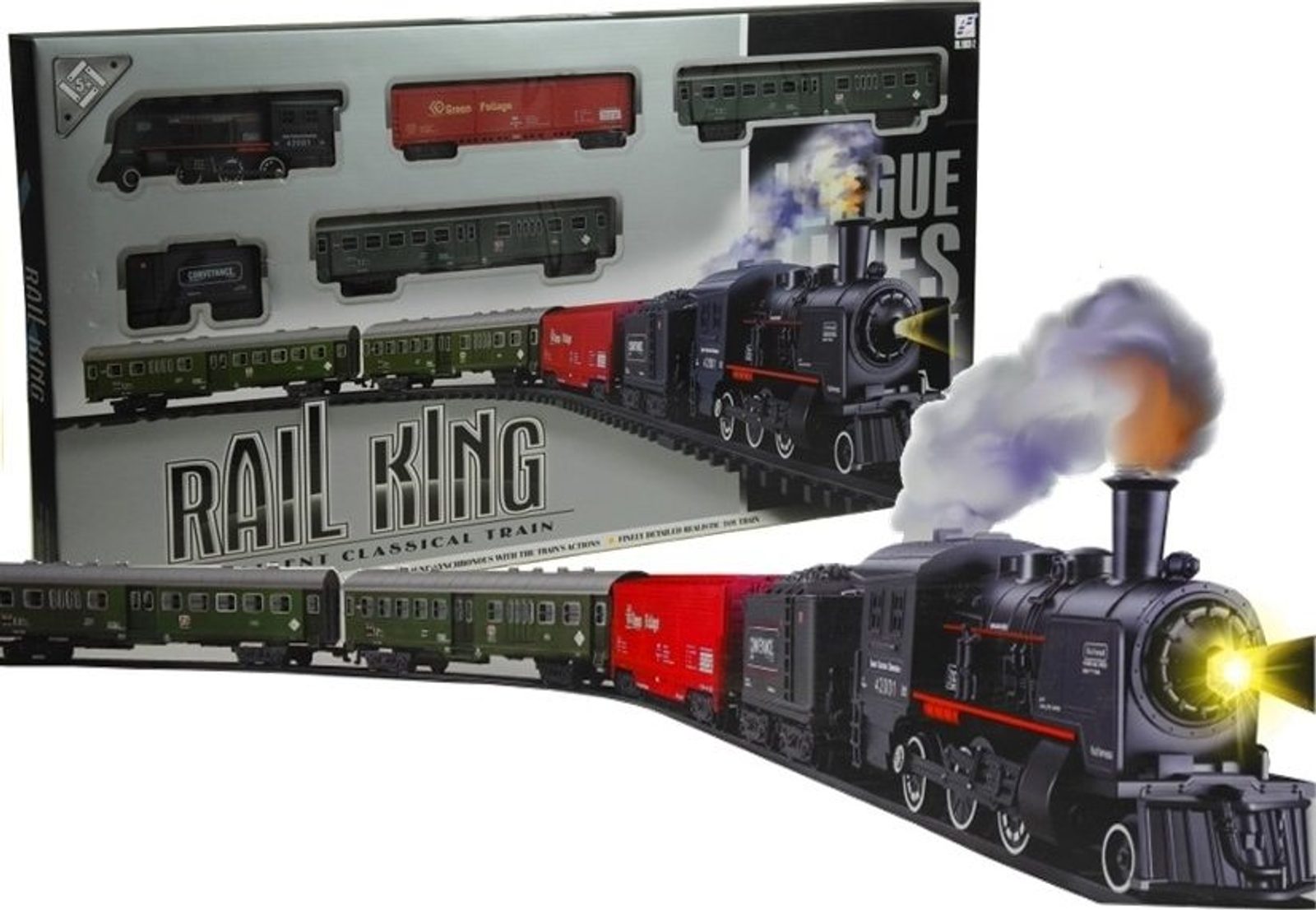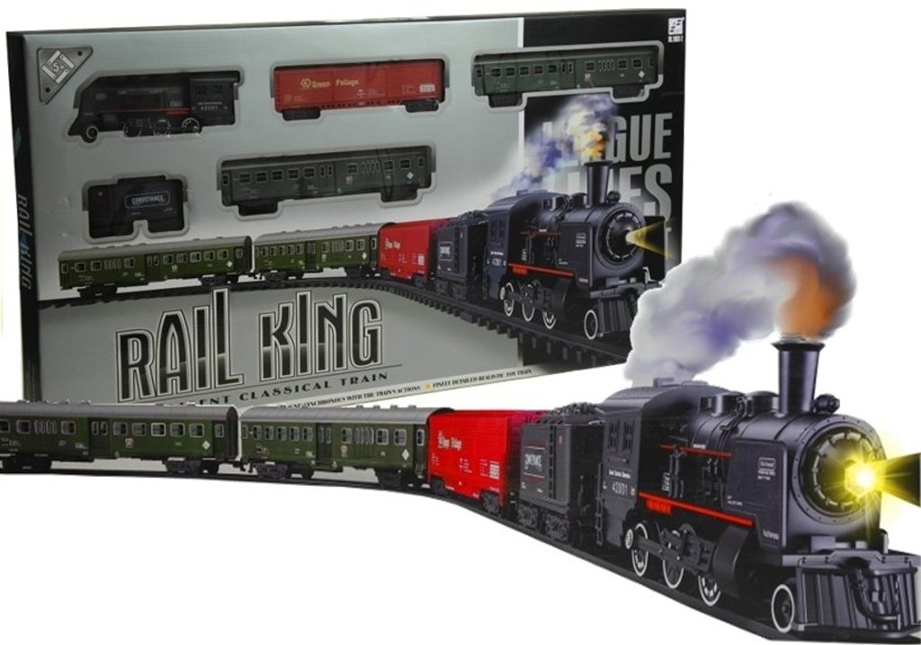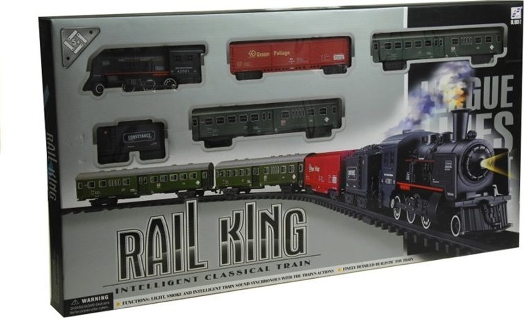 Vláčkodráha Rail King na baterie učí dětí představivost a podporuje kreativitu. Vláčkodráha je kompletně vybavená, naleznete zde lokomotivu, která svítí a po na nalití vody kouří, vagóny, budovu železniční stanice, stromky a koleje. Vše je vyrobeno z plastu bez ostrých hran. Hračka je určena pro děti od 36 měsíců věku.