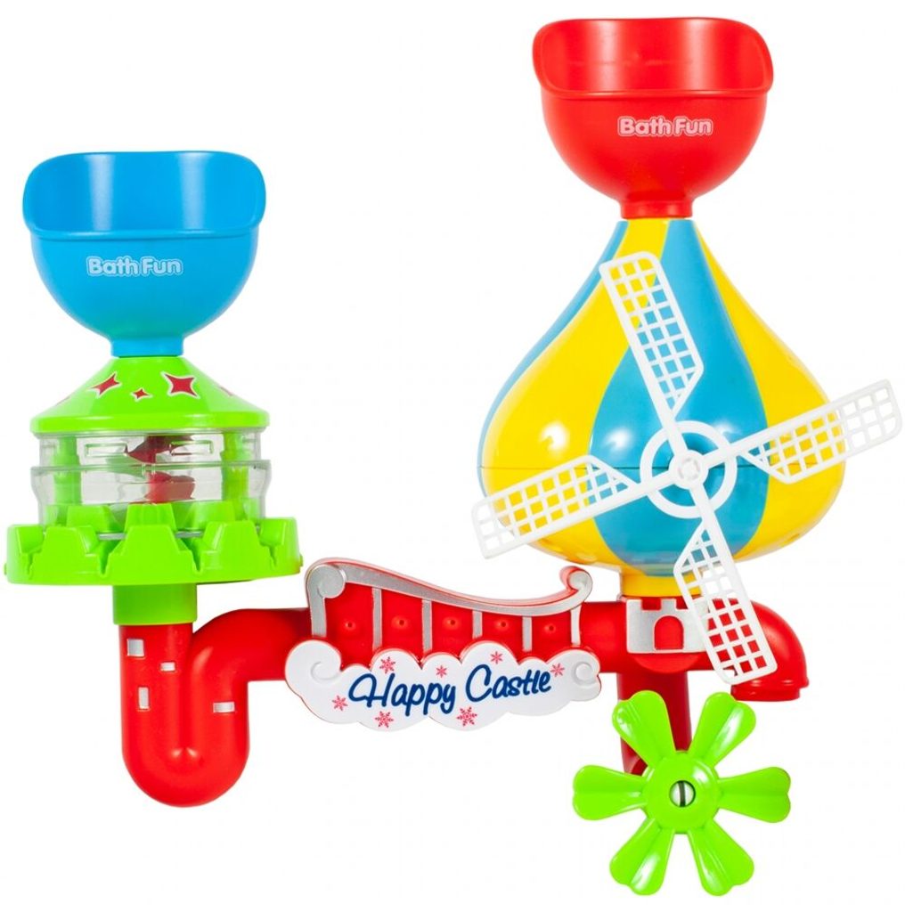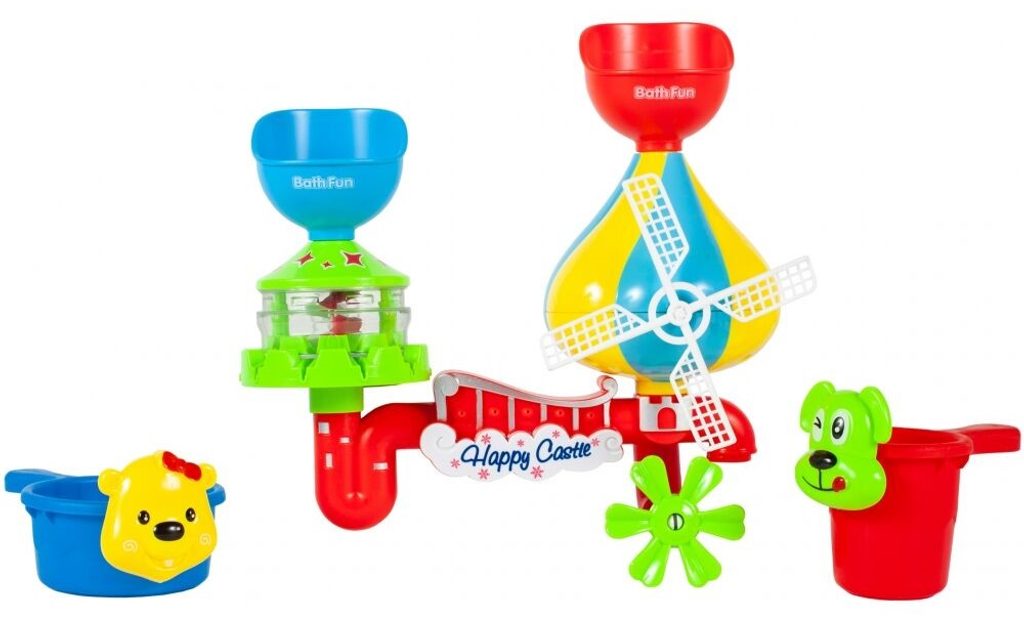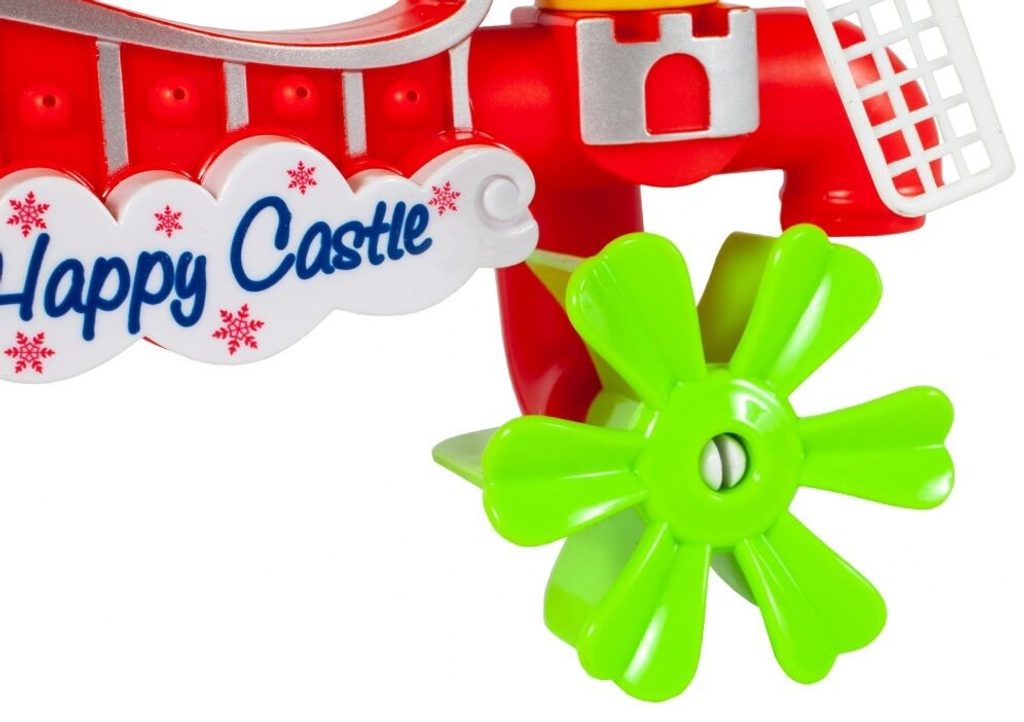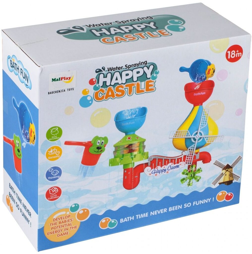 Dětská hračka Happy Castle je perfektní hračkou do vany. Je vybavena přísavkami pro snadné uchycení. Po nalití vody začne voda protékat hračkou, roztočí kolovrátek uprostřed hračky za současného zvuku tekoucí vody a zároveň vytvoří také fontánu, kdy voda vytéká z otvorů ve spojovací trubici. Součástí sady jsou také 2 nalévací nádobky s ouškem. Hračka je vyrobená z plastu a určena pro děti od 18 měsíců věku.