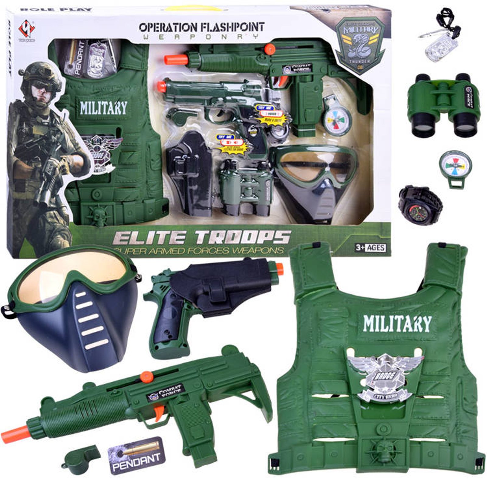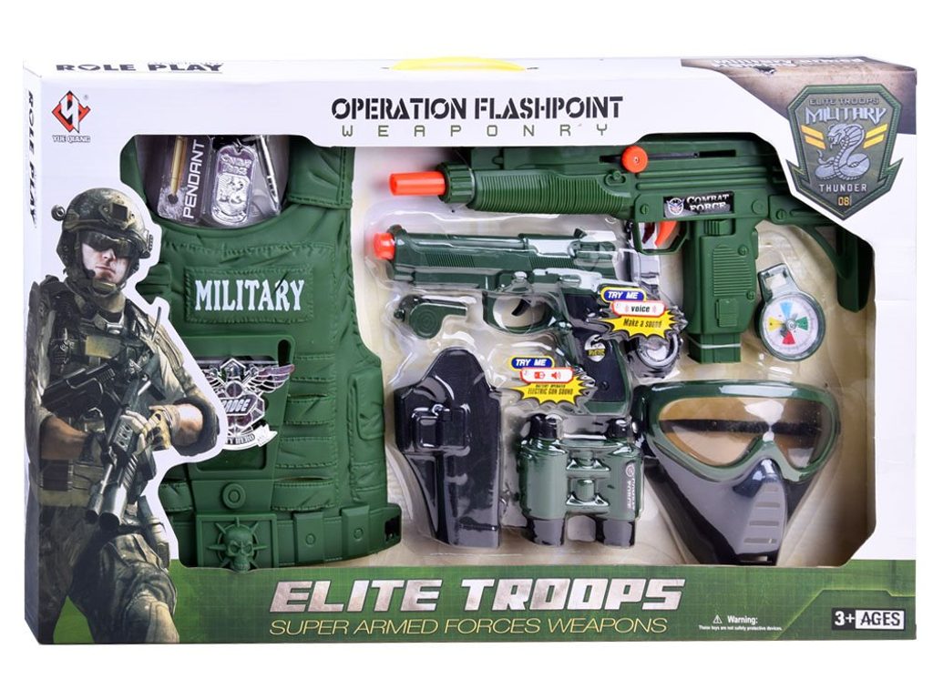 Sestava Elite Troops s maskou a kompletním příslušenstvím je ideální hračkou pro každého malého vojáčka. V sestavě najdete vše co bude potřebovat. Neprůstřelnou vestu, dalekohled, kompas, hodinky, píšťalku, masku, granát, identifikační štítek, pistoli a také samopal na baterie, která vydává zvuky střelby. Hračka je určena pro děti od 36 měsíců věku.