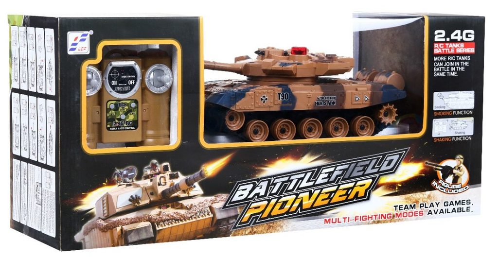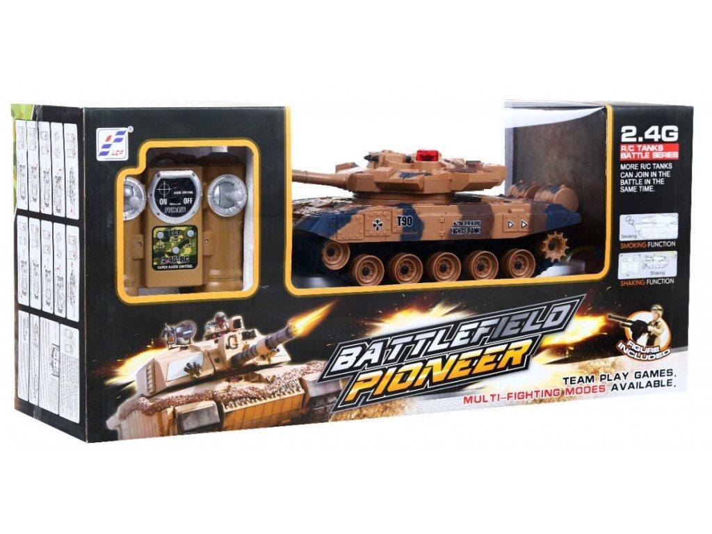 Vojenský tank Battlefield Pioneer na dálkové ovládání s dálkovým ovladáním 2,4G umožnuje jízdu dopředu a dozadu, zatáčí doprava a doleva a může se otáčet také na místě. Je osazený pásy a během jízdy vydává zvuky motoru a střelby. Během jízdy svítí přední světla a světýlko na otočné věžičce. Na tu lze umístit figurku tankisty, která je součástí balení. Po každém výstřelu se tank pohne, takže působí zcela realistickým dojmem. Dalším efekjtem je kouřící výfuk tanku. Součástí balení je akumulátor, USB nabíječka a dálkový ovladač. Dálkové ovládání je napájeno bateriemi, které nejsou součástí balení. Tank je vyroben z odolného plastu a má certifikaci CE.