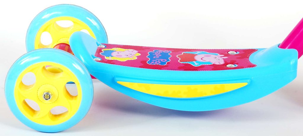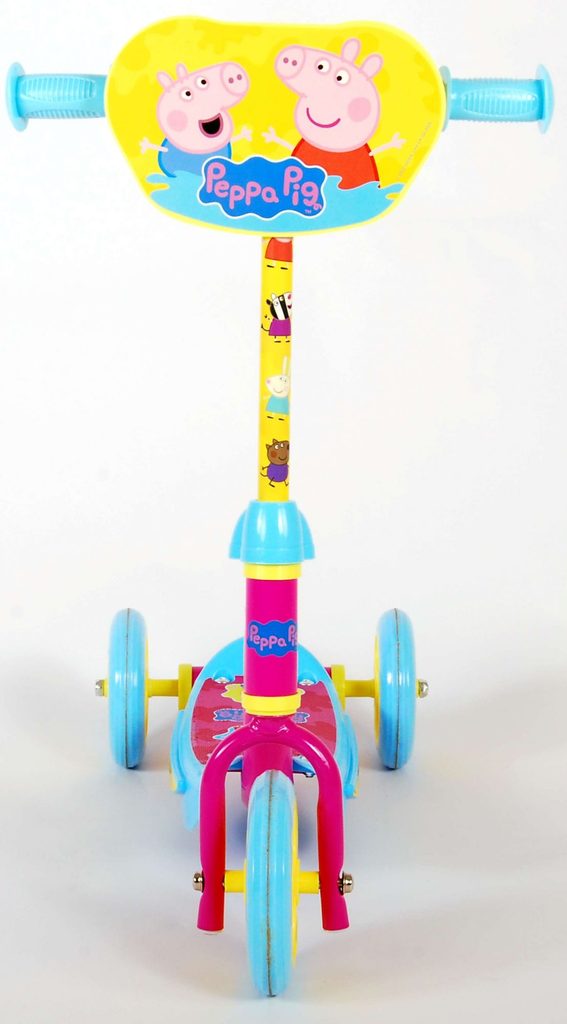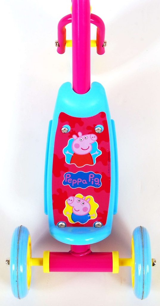 Dětská koloběžka se třemi koly Volare Peppa Pig se stabilní kovovou konstrukcí. Konce řídítek jsou vybaveny protiskluzovými úchyty. Nášlapná plocha je zdobena obrázky. Koloběžka je určena pro děti od 2 do 6 let věku