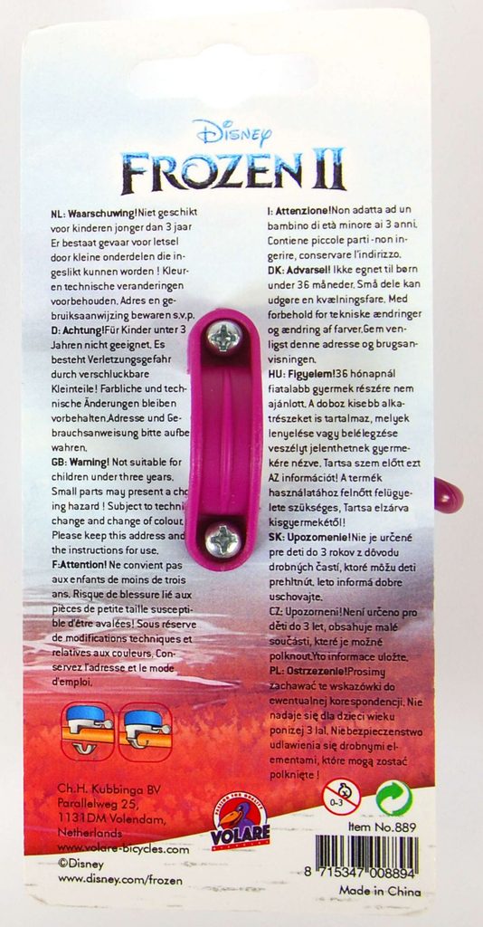 Dětský zvoneček Volare Frozen II je perfektním doplněk pro každé dětské kolo. Má průměr 5 cm, na horní straně má oblíbený obrázek a jeho zvonění upoutá a upozorní každého na to, že se blíží malý cyklista.