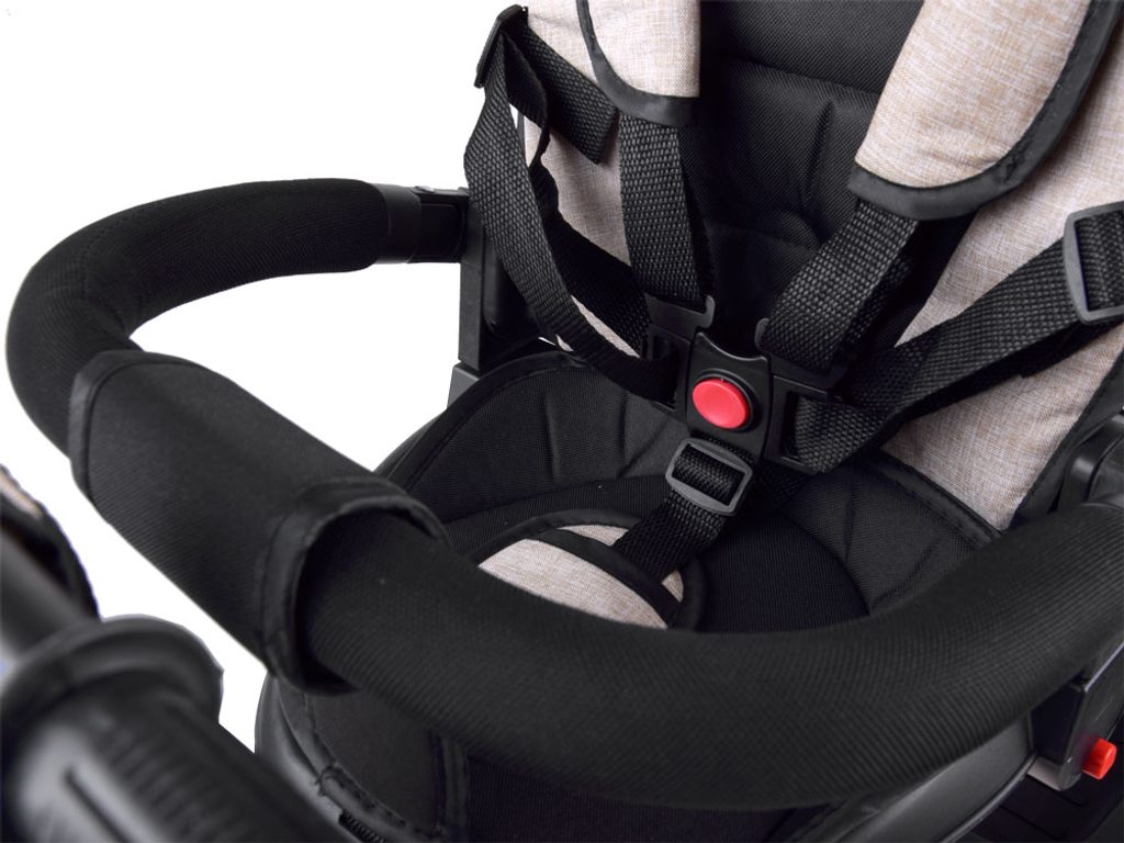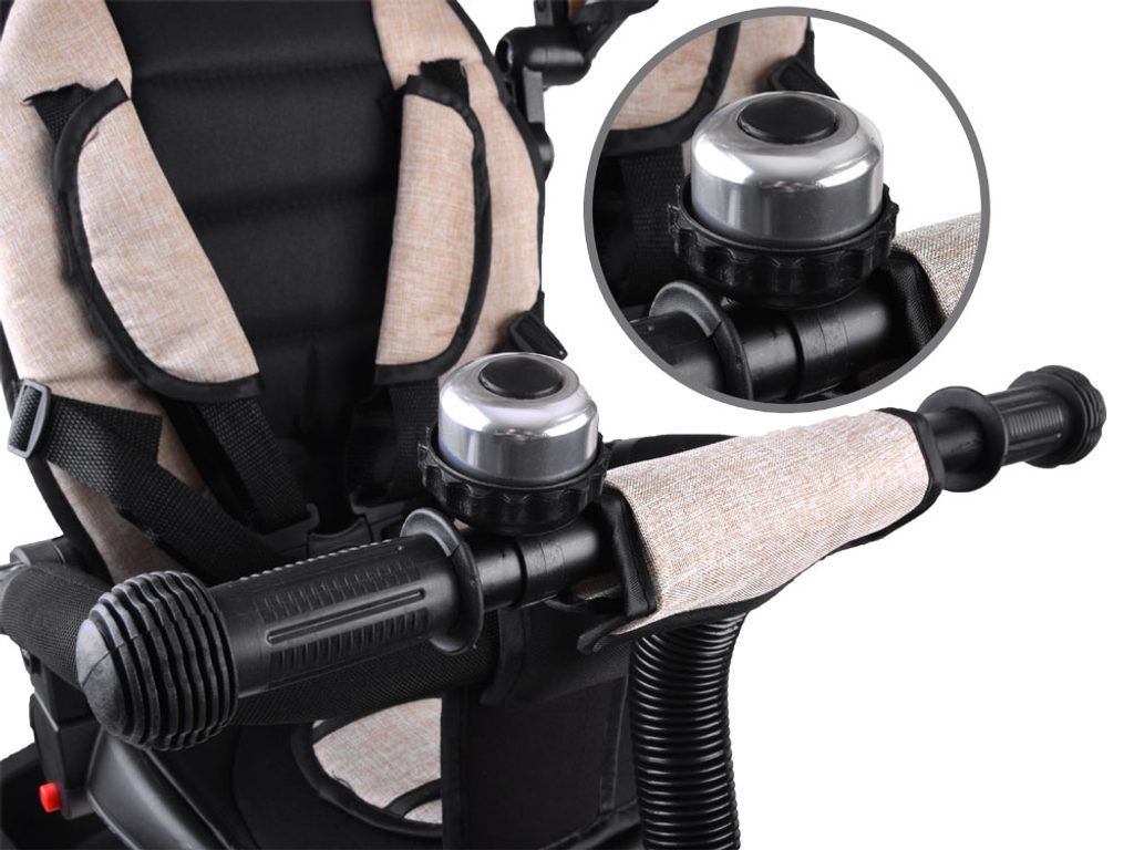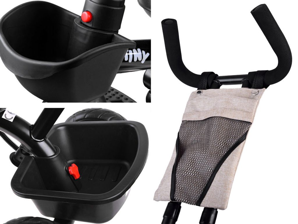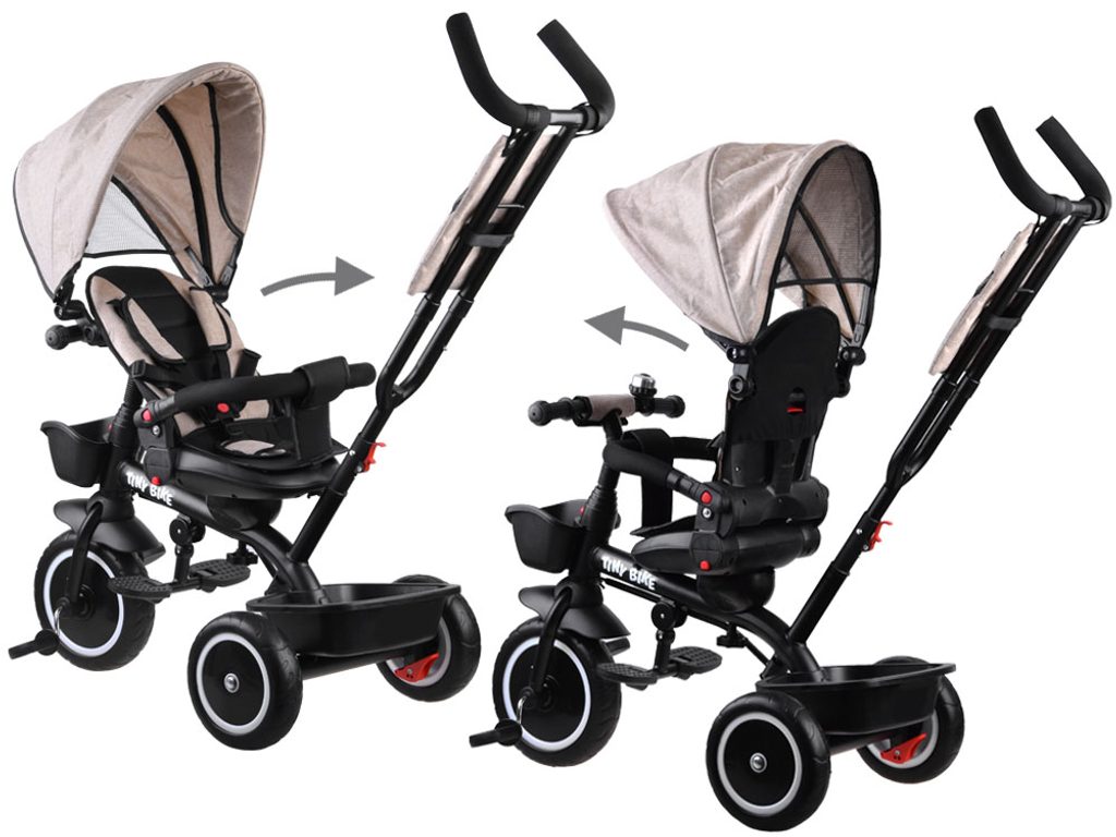 Dětská tříkolka Tiny Bike 3v1 s otočným sedadlem. Je určena pro děti od 6 měsíců do 5 let. Vybavena praktickou odnímatelnou stříškou proti slunci a dešti. V zadní části je umístěn velký koš na hračky, v přední části potom menší košík. Tříkolka má pevnou ocelovou konstrukci a odolná kola z pěnového plastu usazená v pevných plastových ráfcích. Madlo a 5bodový bezpečnostní pás zabraňují vypadnutí dítěte z kočárku. Na řídítkách je umístěný zvoneček. Pro větší bezpečnost mohou tříkolku řídit i rodiče a zadní kola mají 2 nezávislé brzdy. Sedadlo lze otočit o 360° a to ve směru jízdy nebo čelem k rodiči a navíc usnadní nastupování nejmladším dětem.