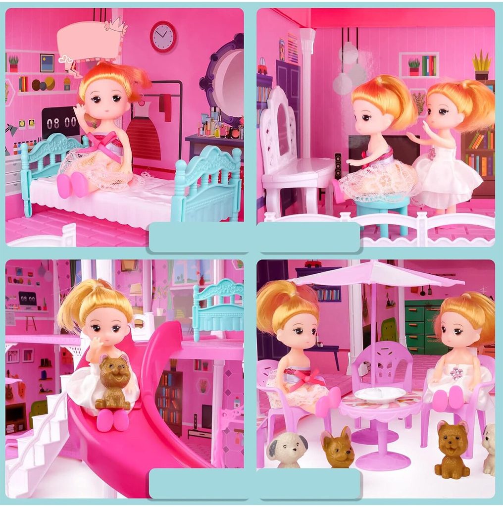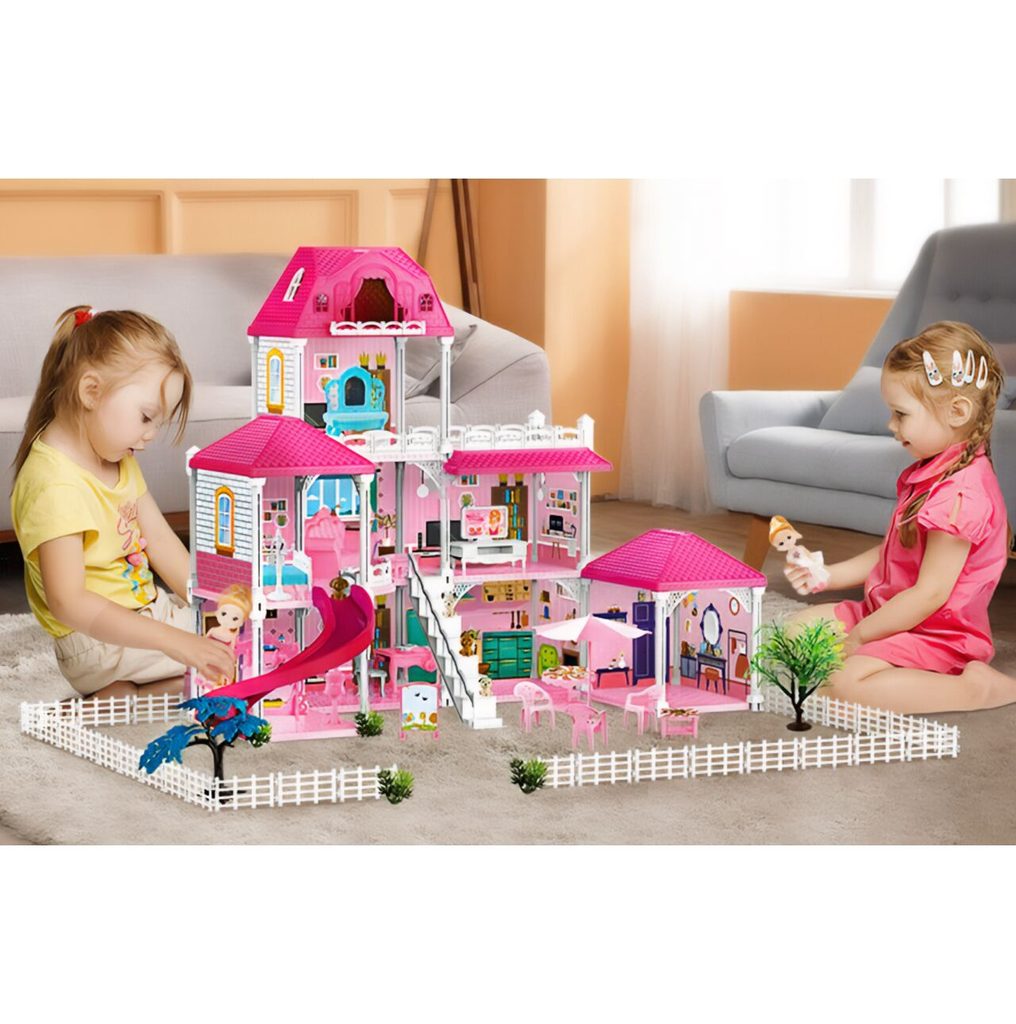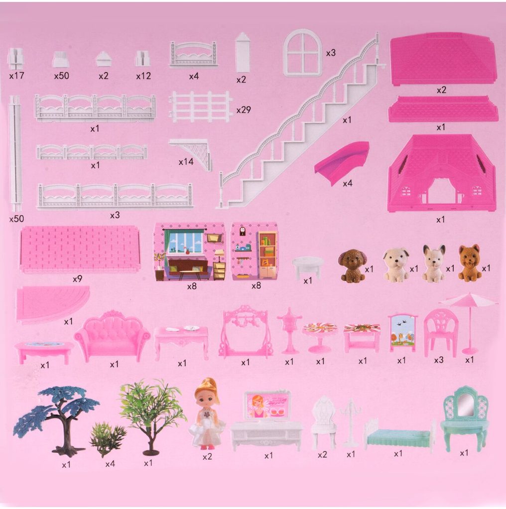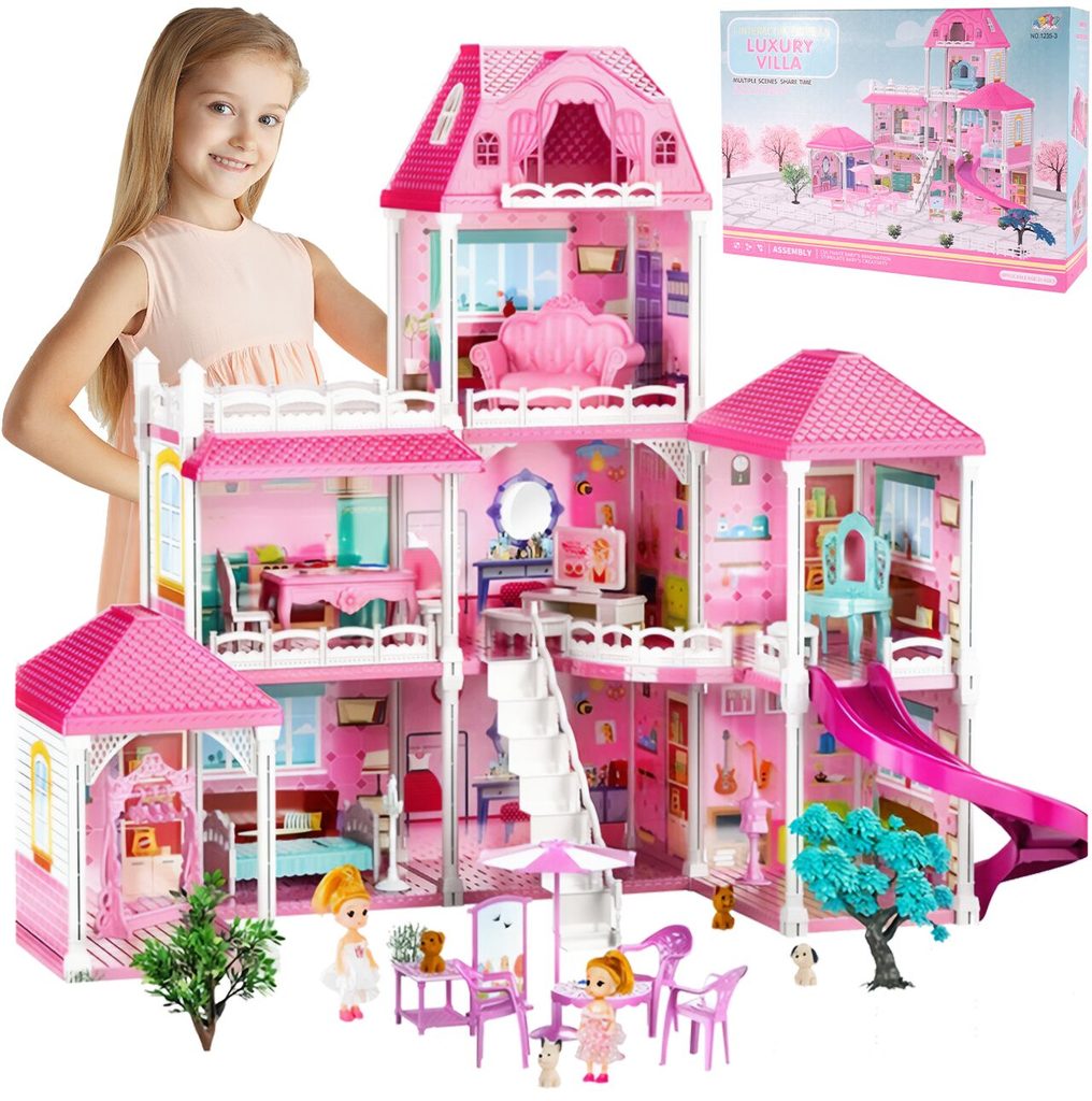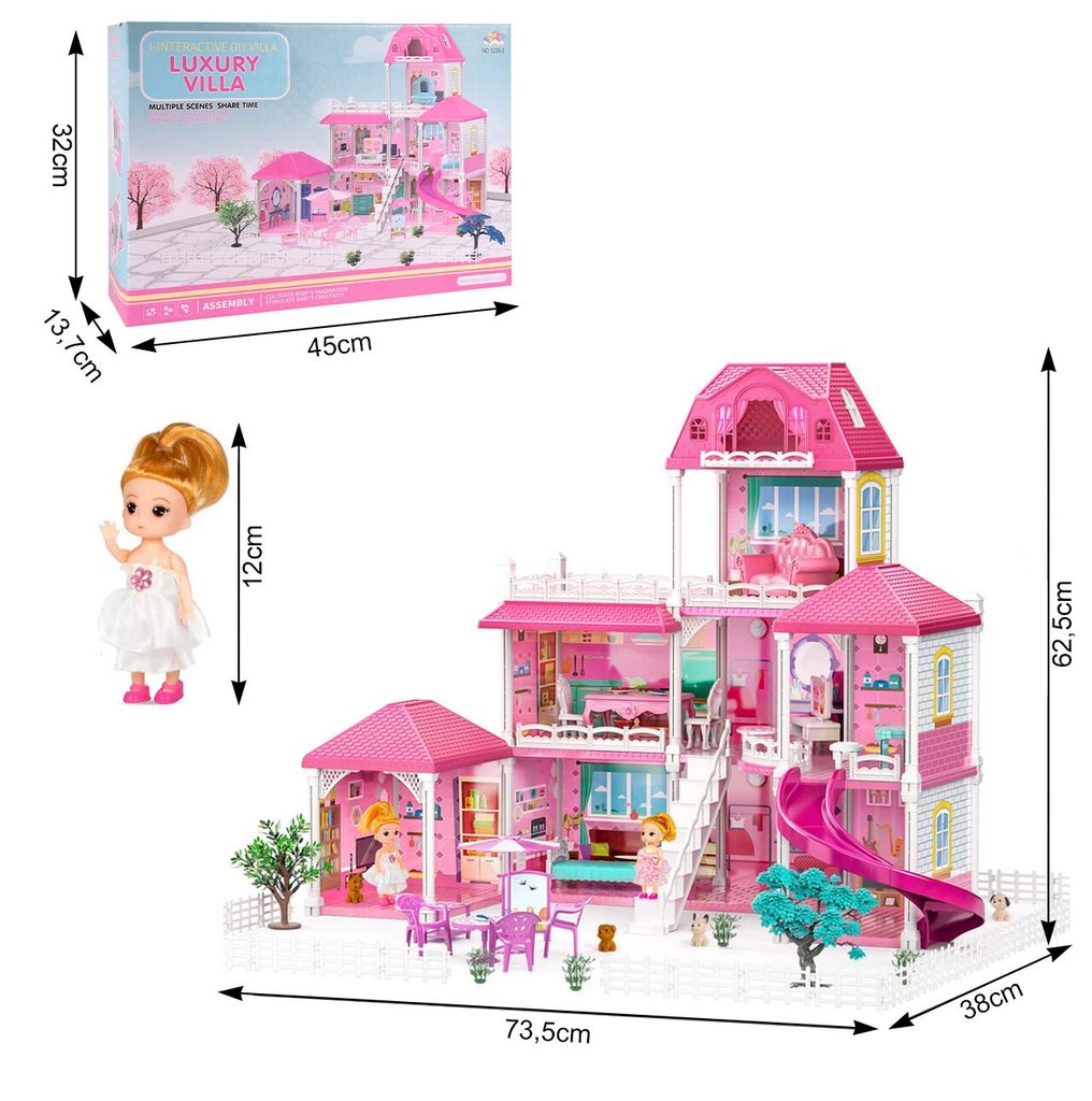 Nádherný domeček pro panenky s přízemím, prvním patrem a 2 terasami je snem každé malé princezny. Skládá se z celkem 8 velkých pokojů, které jsou průchozí. Nábytek v domečku lze libovolně přeskupovat. Najdete nábytek, televizor,stoleček, gauč, lampu, zahradní nábytek, stromečky a mnoho dalšího vybavení. Součástí jsou také 2 panenky a 4 pejsci. Je vhodný pro děti od 3 let věku.