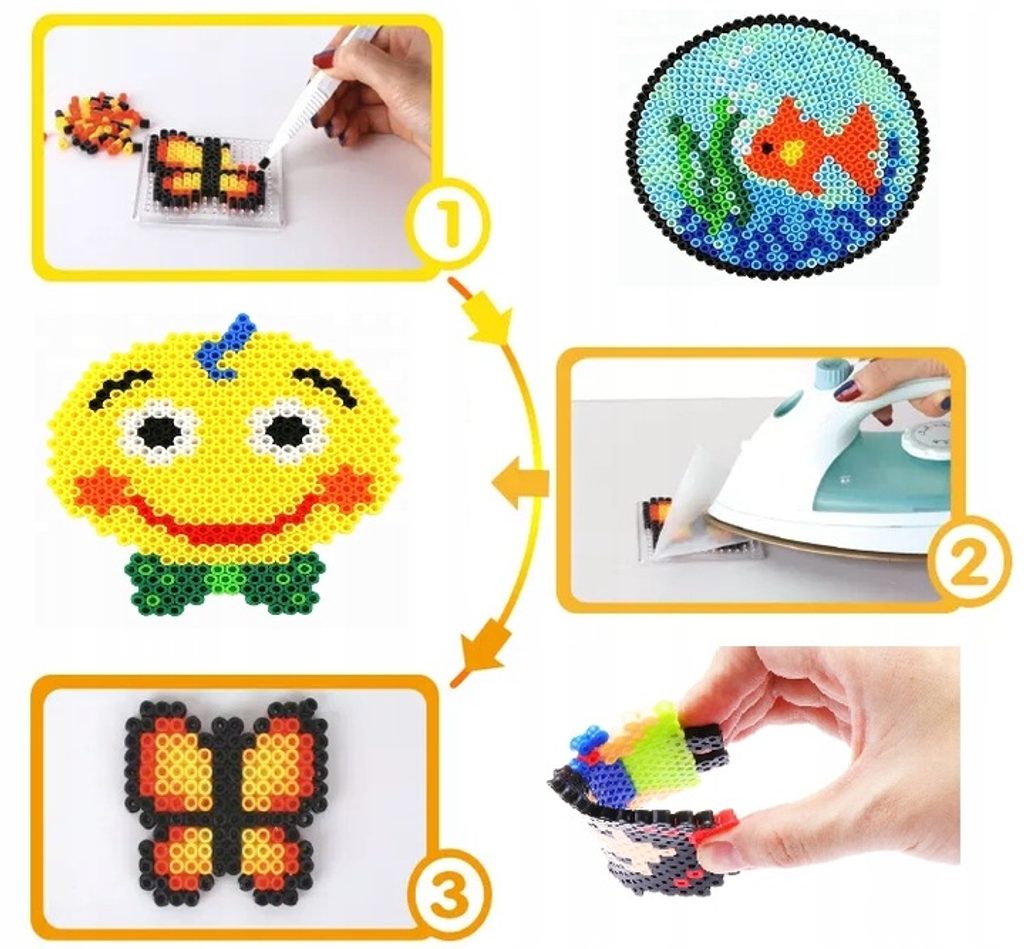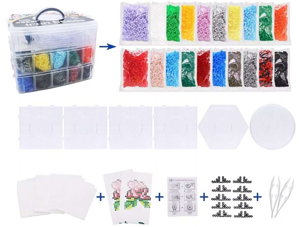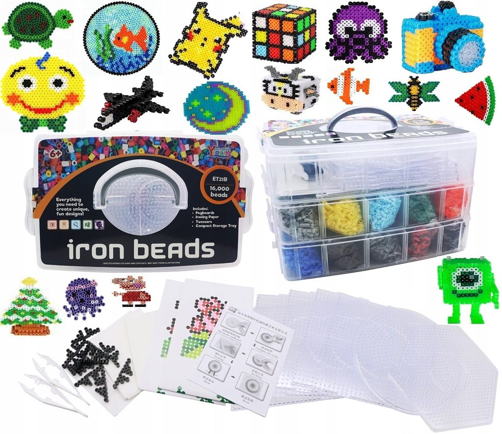 Sada barevných zažehlovacích korálků Iron Beads učí dětí představivost, podporuje kreativitu a manuální dovednosti. Sada obsahuje celkem 6000 ks korálků v různých barevných odstínech. Lze z nich vytvářet různé vzory, tvary, náramky, 3D postavičky a náhrdelníky, které se potom zažehlí přes přiložený žehlící papír. Vše je uloženo v praktickém plastovém kufříčku s horním úchytem. Hračka je určena pro děti od 6 let věku.